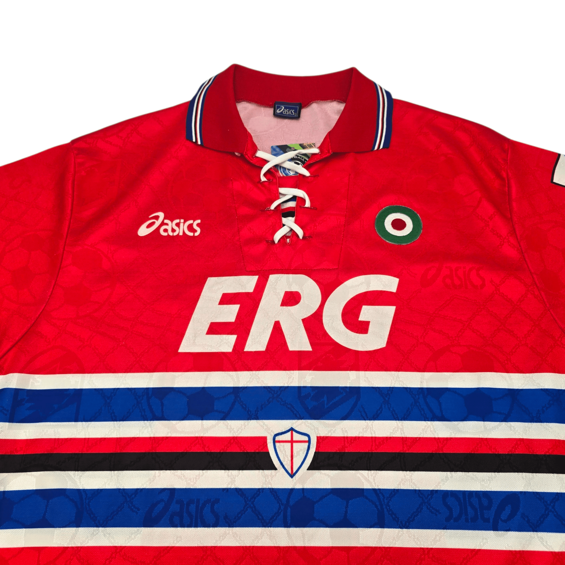 Information: Official Asics Sampdoria third football shirt, as worn by ‘La Samp’ during the 1994/95 season, when the side, under Sven-Göran Eriksson, competed in Serie A and reached the semi-finals of the Coppa Italia with a squad still boasting several icons from their golden era. The reverse of the shirt boasts the number '10' as worn by club legend, Roberto Mancini. A fantastic vintage jersey, ideal for a collection of your own or the perfect gift for any football fan.