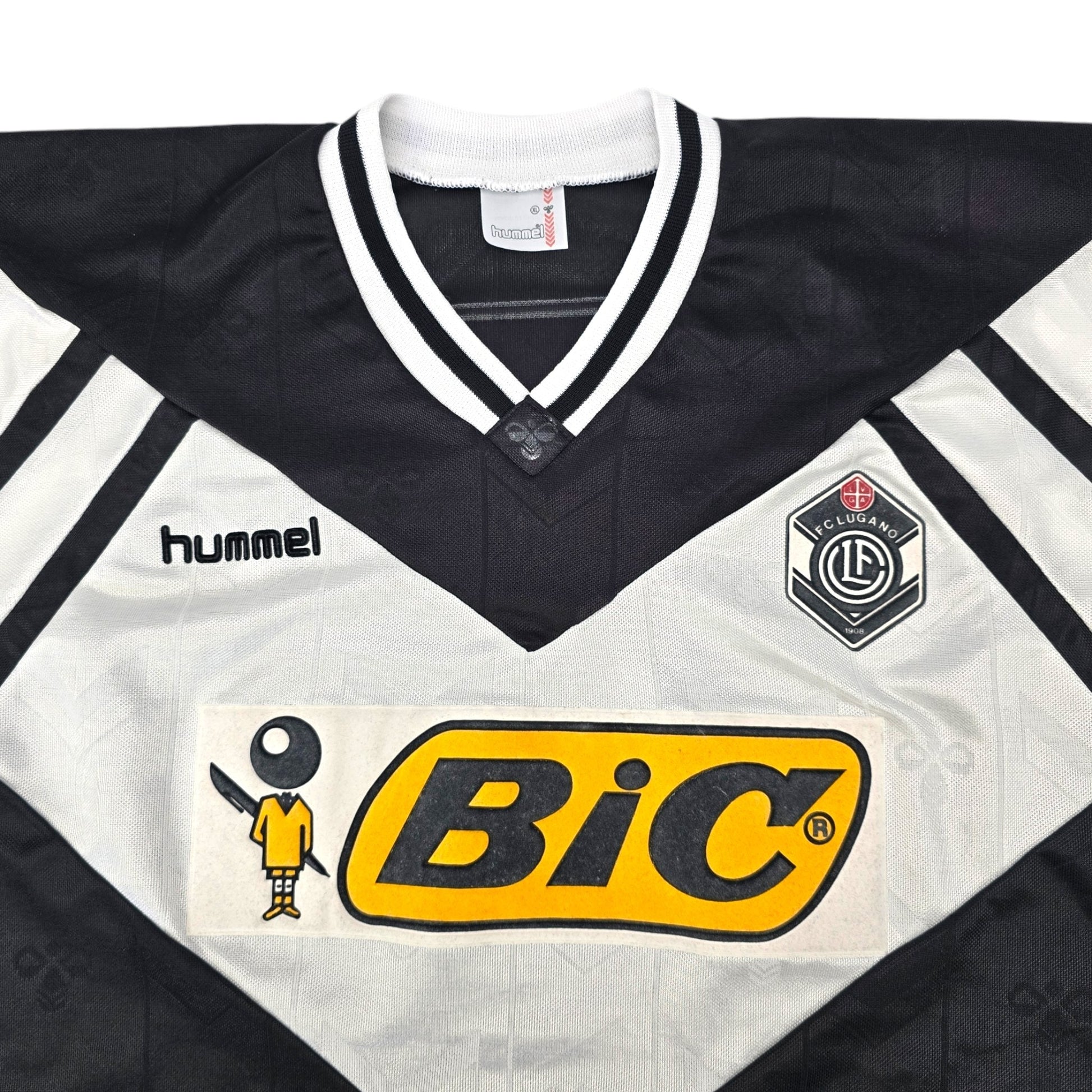 Information: Official Hummel Lugano Home football shirt from 1990/92, as worn by ‘Bianconeri’ when they achieved 5th and 9th place finishes respectively in the Swiss Super League. They also reached the final of the Swiss Cup in the 1991/92 season, where they were unlucky to lose to FC Luzern 3-1 after extra time. A fantastic vintage jersey, ideal for a collection of your own or the perfect gift for any football fan.
