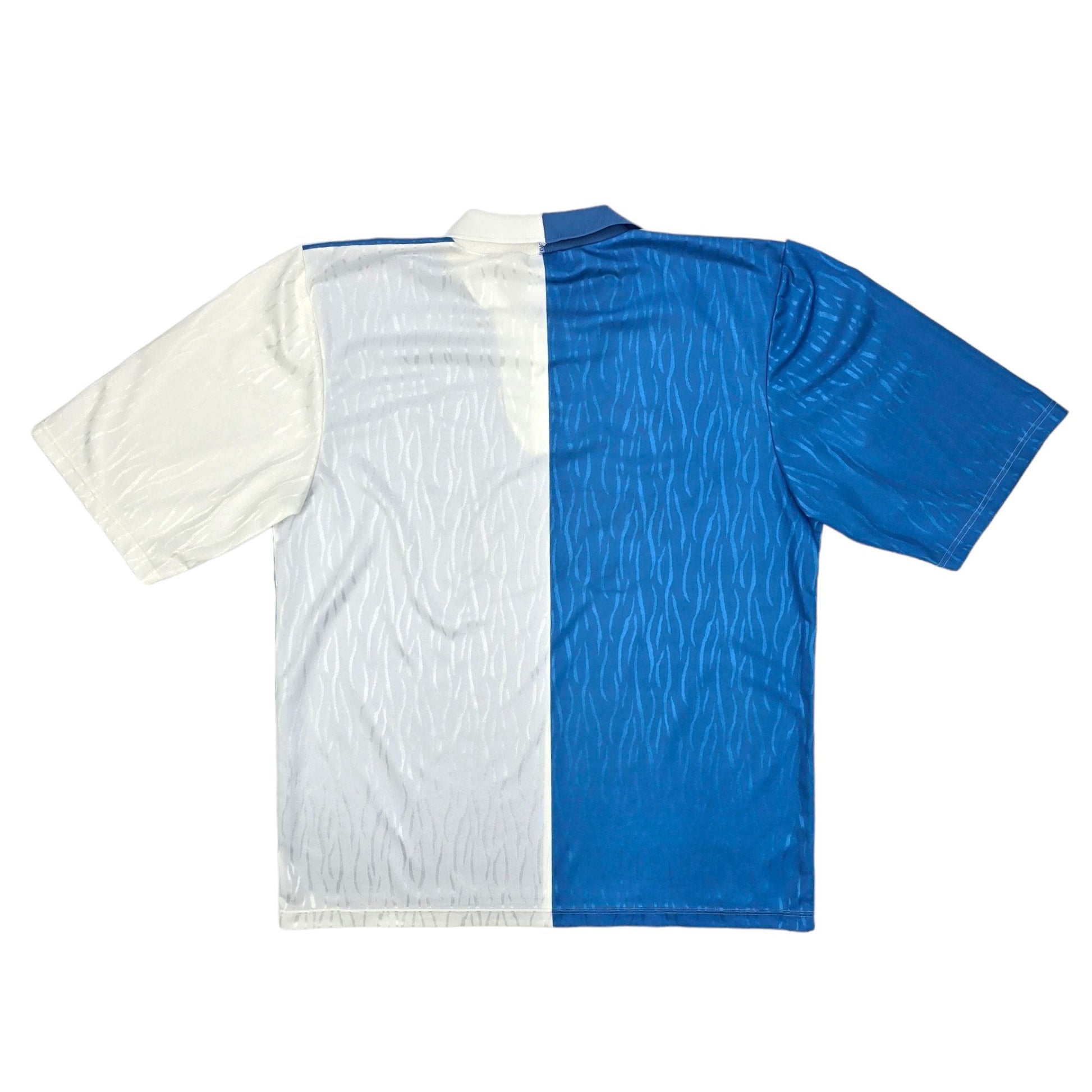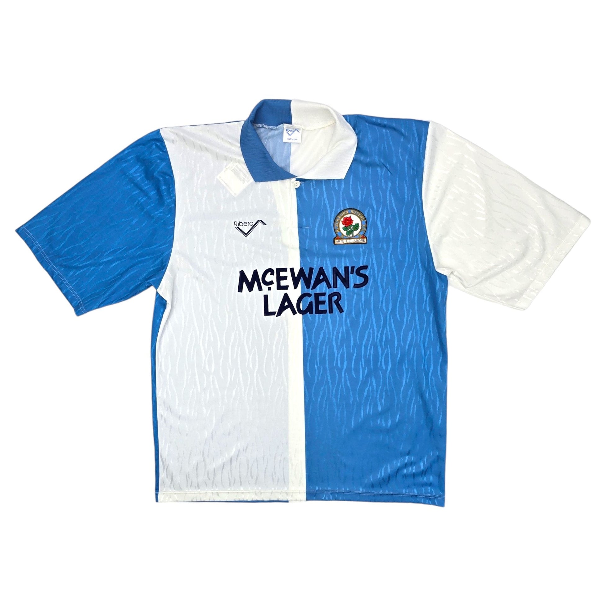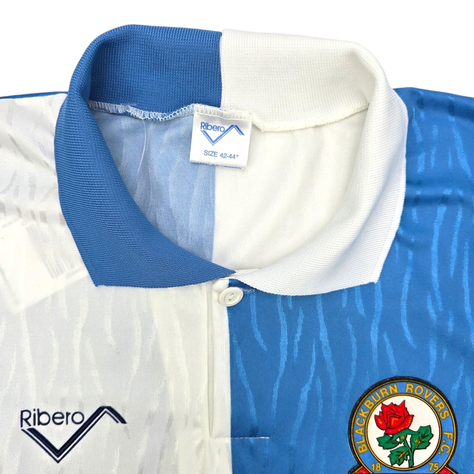 Information: Official Ribero Blackburn Rovers home football shirt from 1991/92, as worn by ‘Rovers’ when they were promoted from the Second Division into the newly founded FA Premier League after beating Leicester City 1-0 in the play-off final at Wembley.  Classic early 90s shirt design by manufacturer Ribero.  Stunning.  A Football Finery favourite.  A fantastic vintage jersey, ideal for a collection of your own or the perfect gift for any football fan.