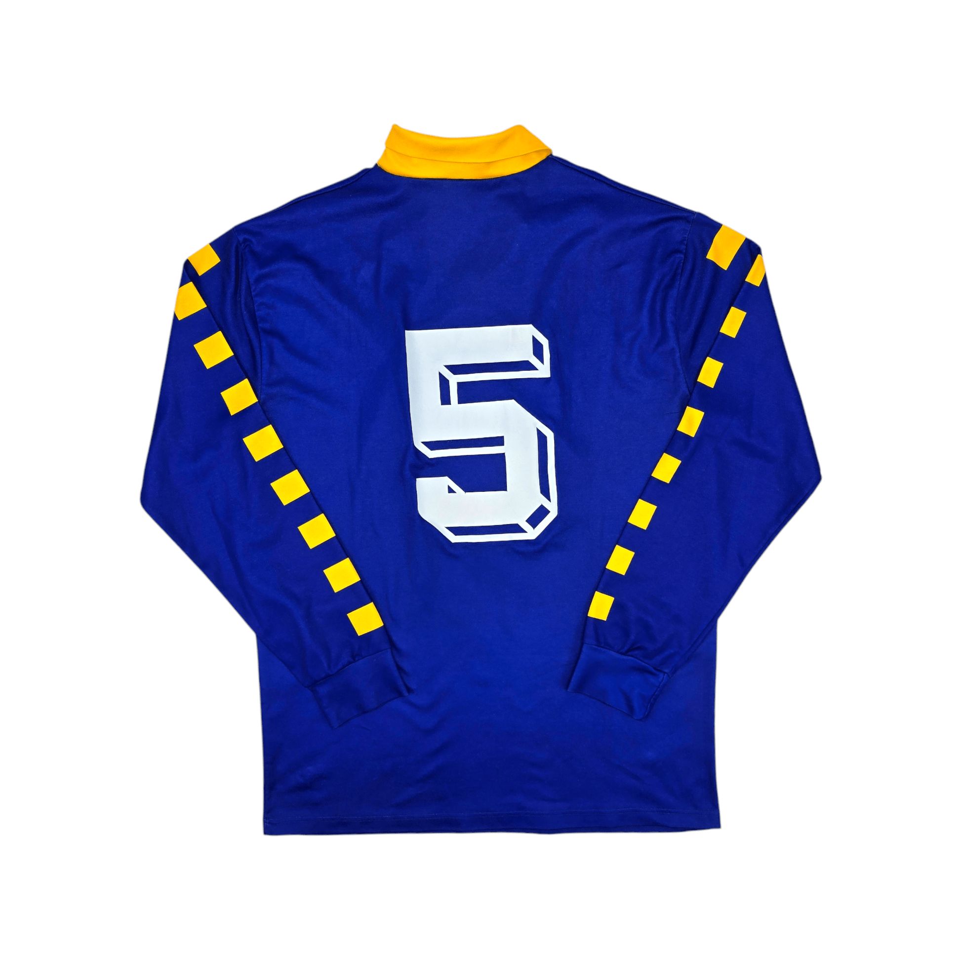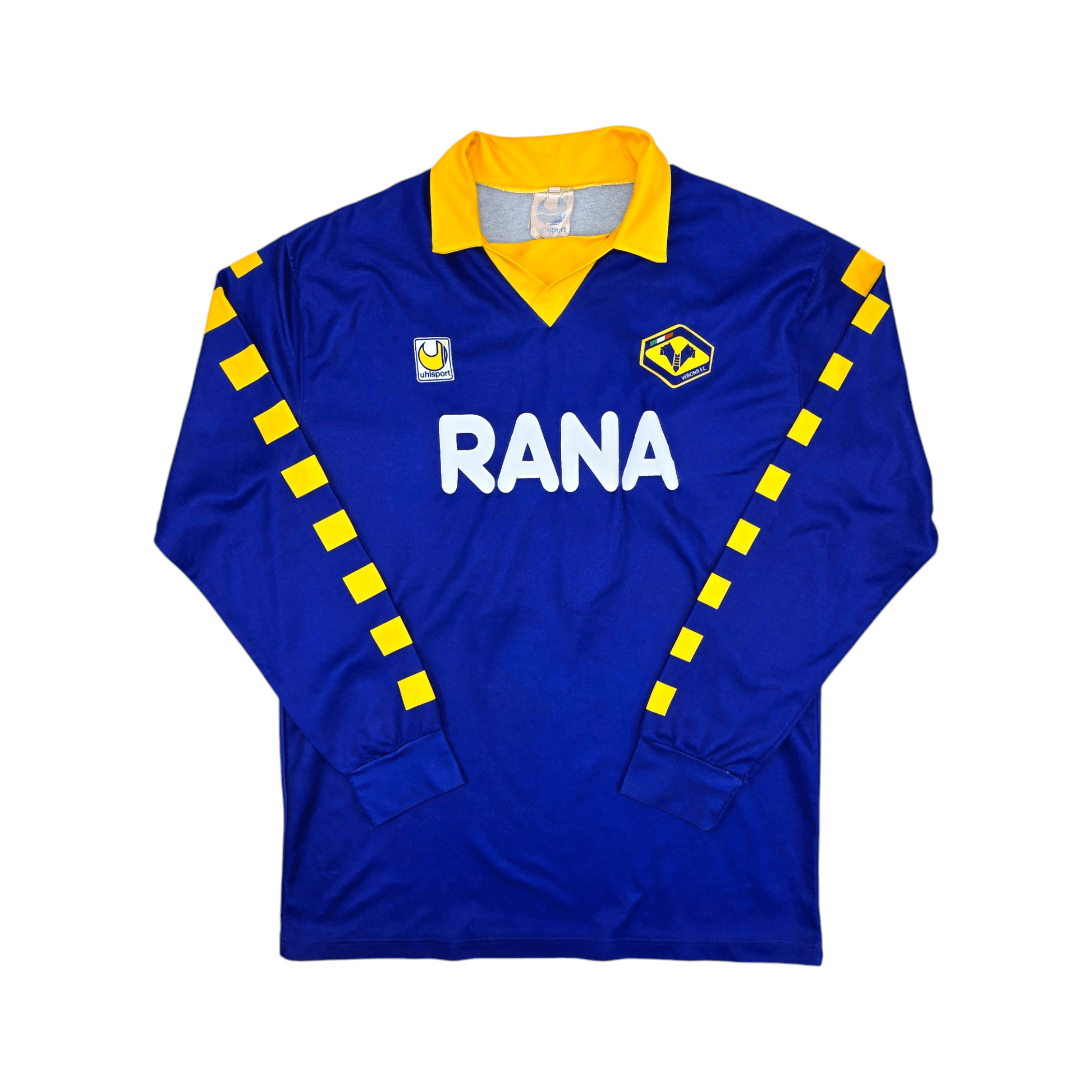 Information: Official Uhlsport Hellas Verona long sleeve home football shirt from 1991/92, as worn by ‘Gialloblu’ during their Serie-A campaign as the club sought to maintain their place in Italy's top flight. The reverse of the shirt boasts the number 5, worn that year by Luca Pellegrini, who notably represented Italy at the 1988 Olympics and made 51 appearances in his two seasons at the club. A fantastic vintage jersey, ideal for a collection of your own or the perfect gift for any football fan.