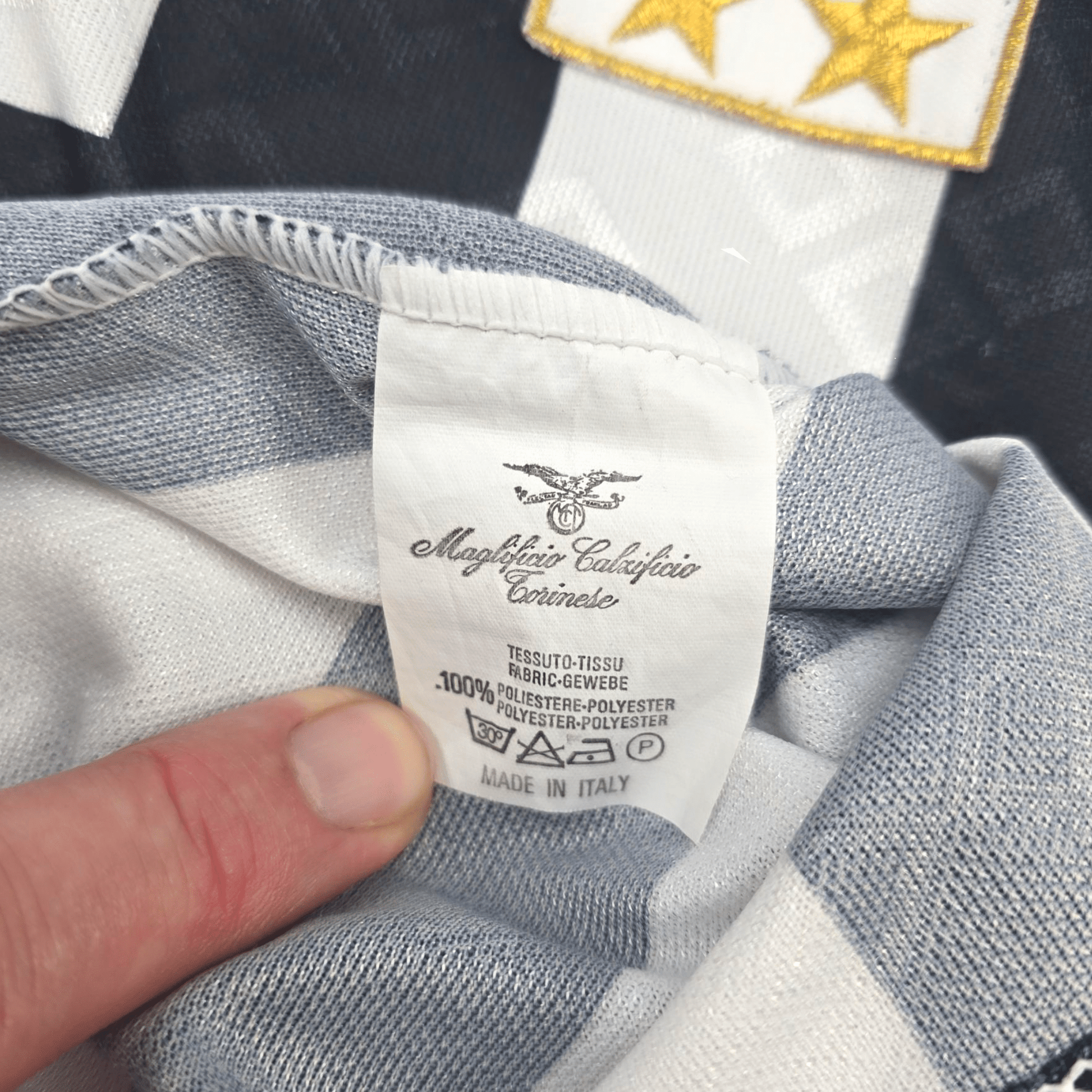 Condition: Very Good. Superb colours, material is smooth with a few bobbles, marks and small pulls. No tears or holes. Embroidered manufacturer logo & stitched scudetto stars are excellent, as is sublimated chest sponsor. Printed number to reverse is showing wear (see photo). Heavy staining to cotton cuffs, especially the left (see photo). Minor stain on the right sleeve but only visible under close inspection (see photo).