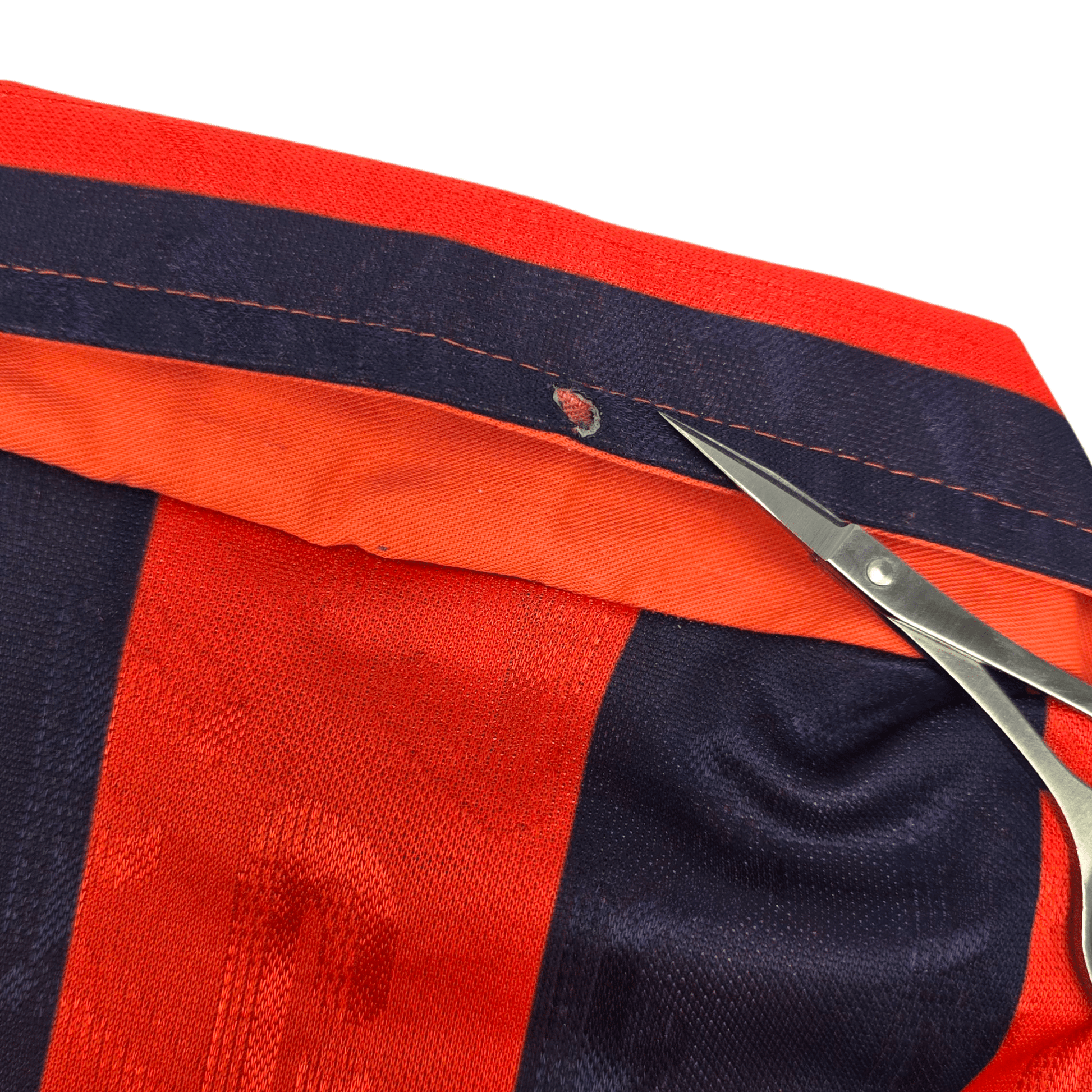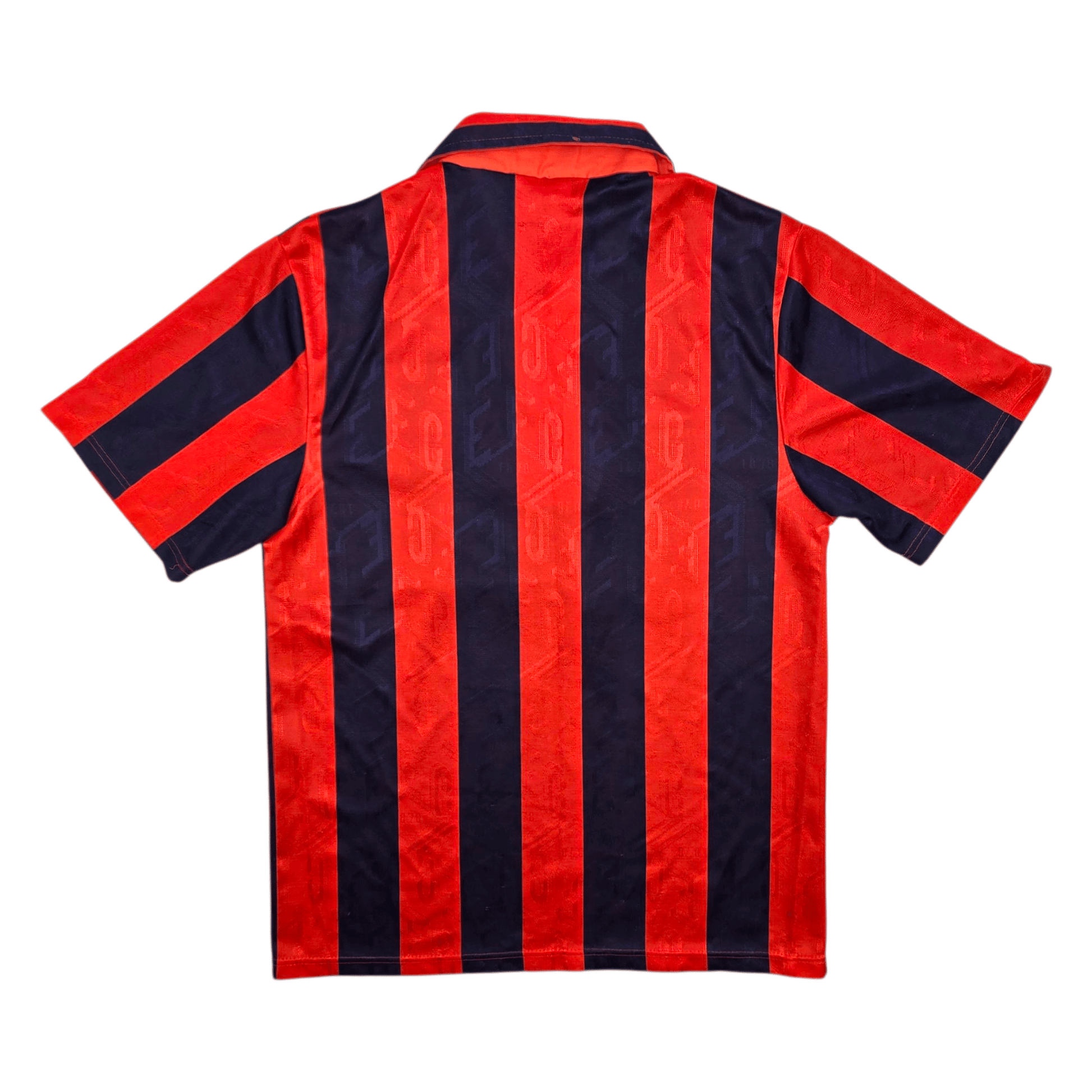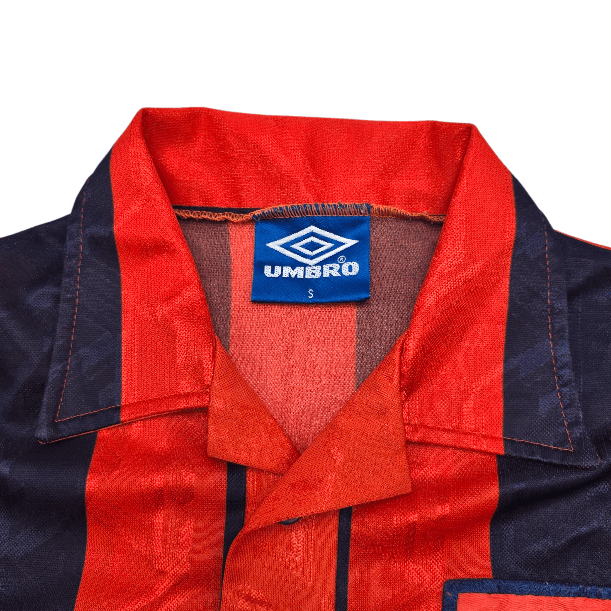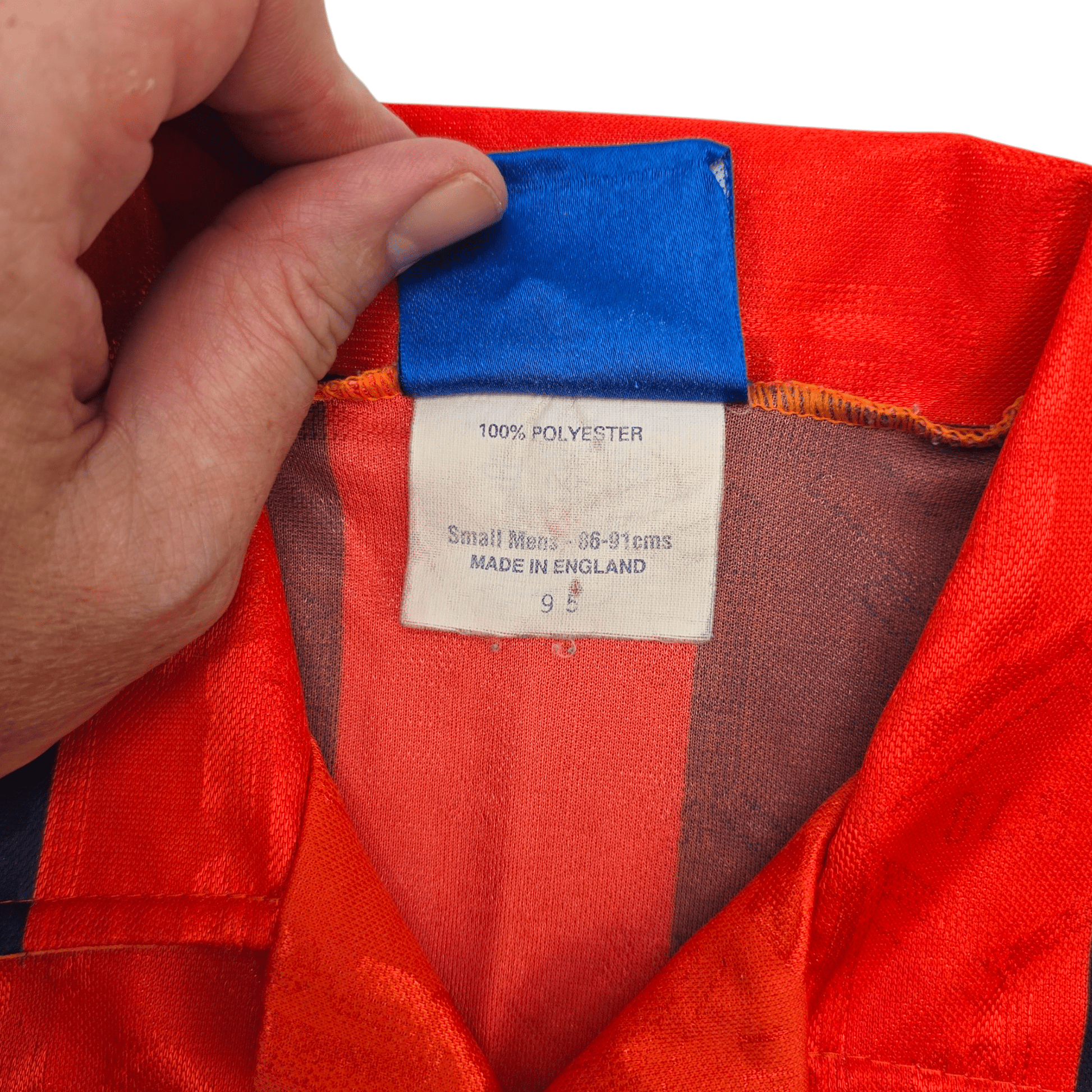 Condition: Excellent. Superb colours, material is smooth with a few bobbles, one small burn-hole to reverse of collar (see photo), no tears or marks. Embossed manufacturer logo & stitched club badge are excellent, as is flock chest sponsor. Collar, sleeves and hem are in fabulous condition.