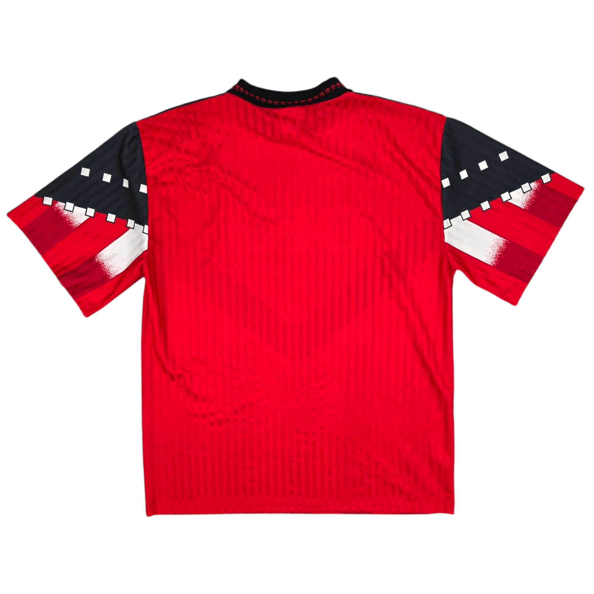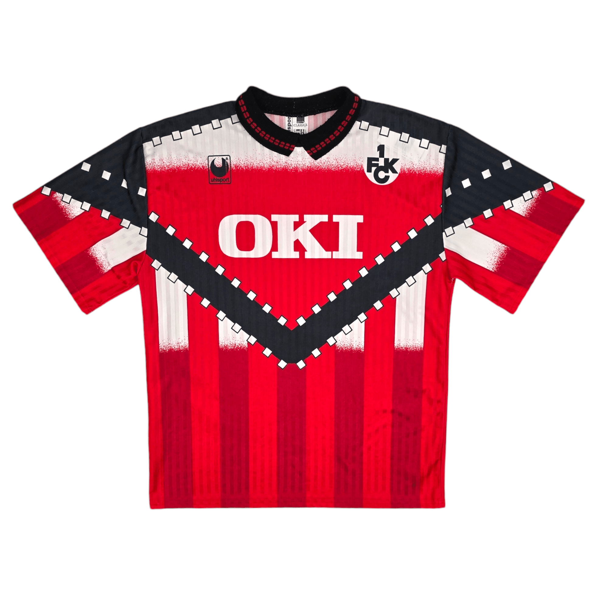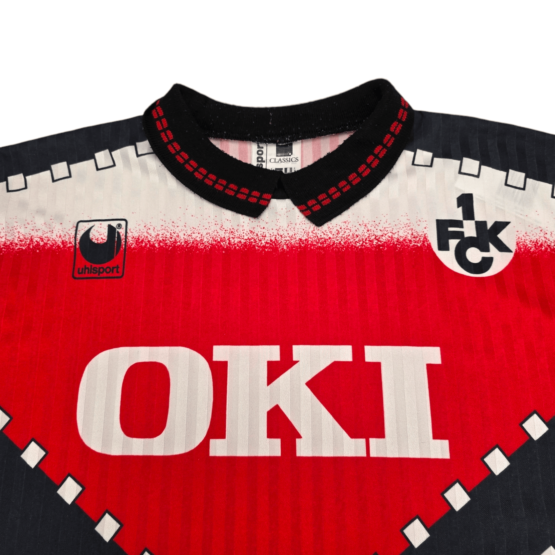 Information: Official Uhlsport Kaiserslautern home football shirt from 1993/94, as worn by 'Die Roten Teufel' when they finished as runners-up in the Bundesliga, finishing just 1 point behind champions Bayern Munich.  What a superb striking bold design - a Football Finery Favourite.  A fantastic vintage jersey, ideal for a collection of your own or the perfect gift for any football fan.