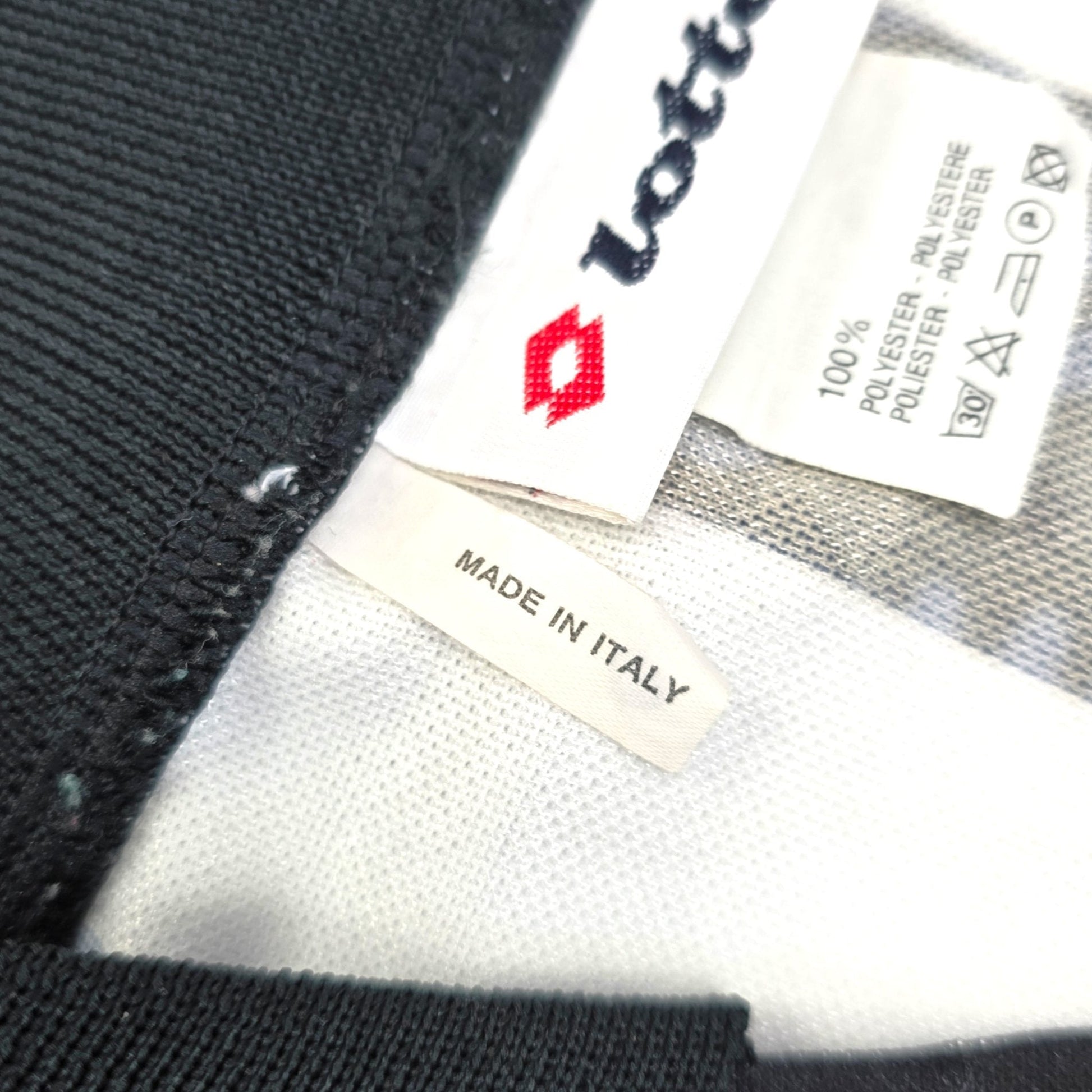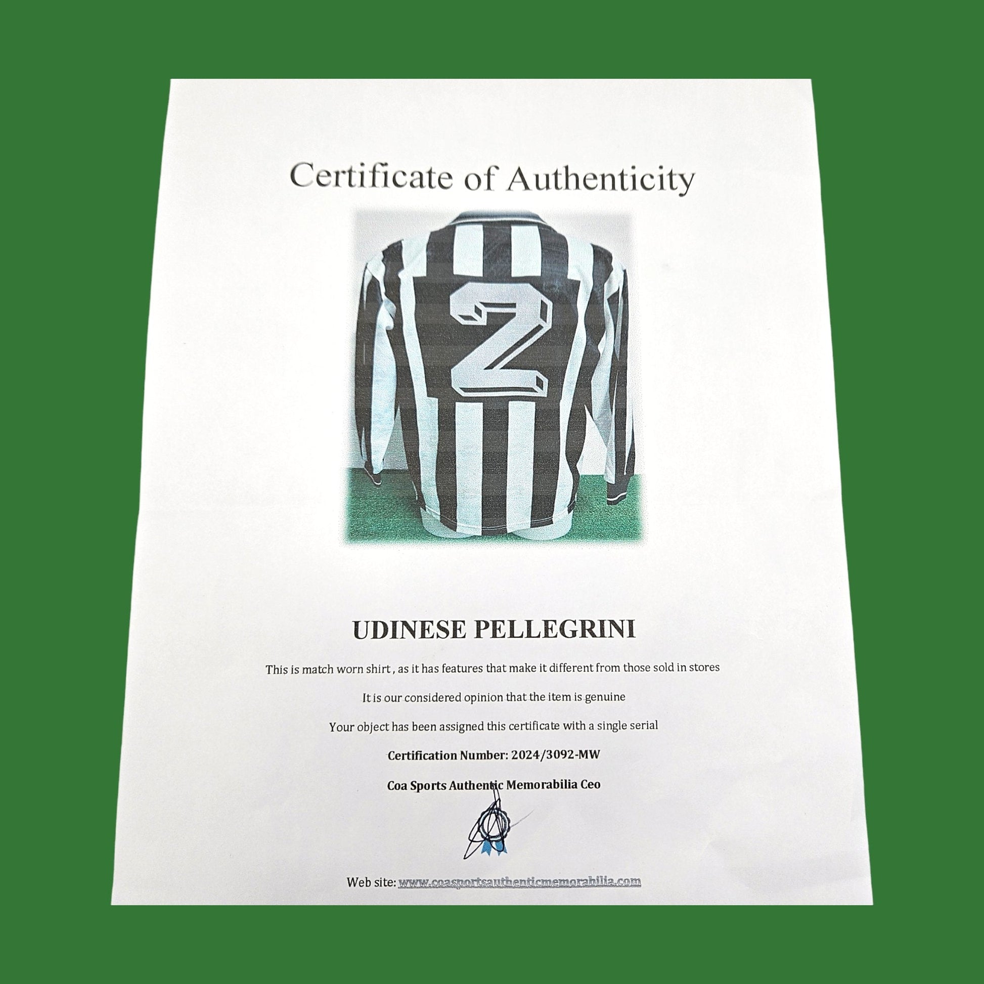Information: Official match worn Lotto Udinese long sleeve home football shirt from 1993/94, as used by ‘I Friulani’ when they achieved a 17th place finish in Serie A. Despite relegation, the club played some exciting attacking football and registered impressive wins over Roma, Parma & Napoli during the season. The reverse of the shirt boasts the nameset of versatile defender, Stefano Pellegrini, who made 78 appearances for the club, going on to play for Roma, Monza & Sampdoria amongst others. A fantastic vintage match-worn jersey, which comes with a serialised certificate of authenticity, ideal for a collection of your own or the perfect gift for any football fan.