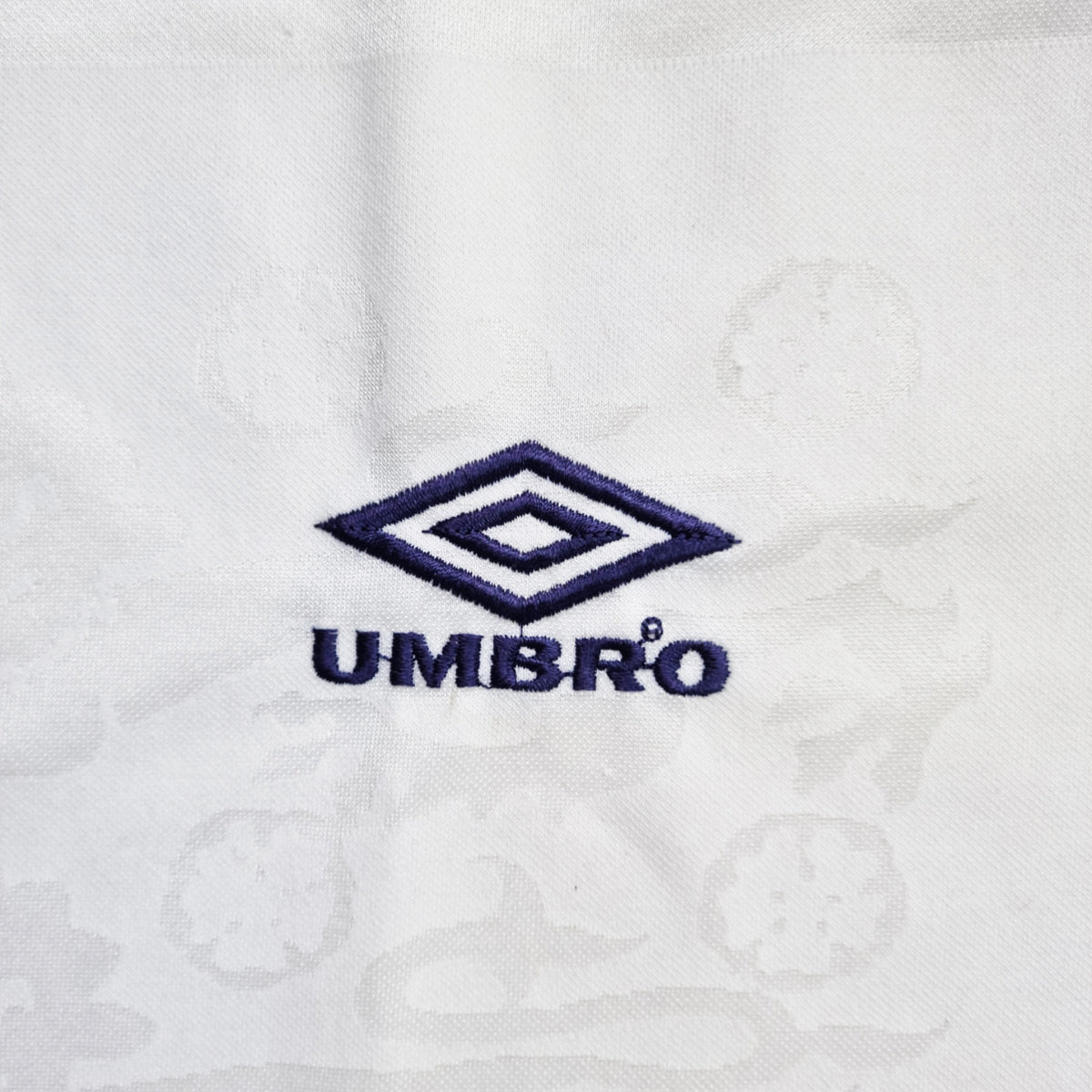Condition:  Very good.  Bright clean material, no holes, tears or markings to the material.  Some fade to navy collar.  A few bobbles across shirt.  Superb stitched team badge, embroidered manufacturer logo.  Slight deterioration of Umbro logo on front right lower hem.