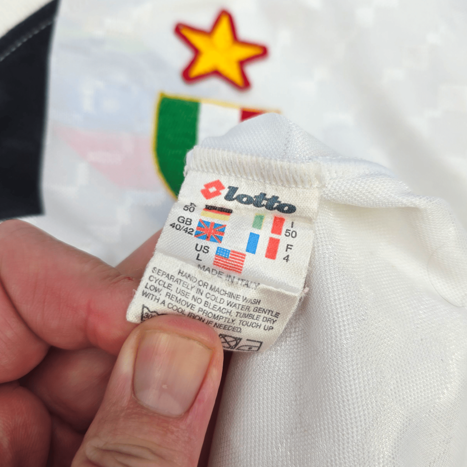 Information: Official Lotto AC Milan away football shirt, as worn by 'I Rossoneri' between 1995-1997, when the side secured the 1995/96 Serie A title under Fabio Capello before competing in the following campaign as defending champions. A fantastic vintage jersey, ideal for a collection of your own or the perfect gift for any football fan.