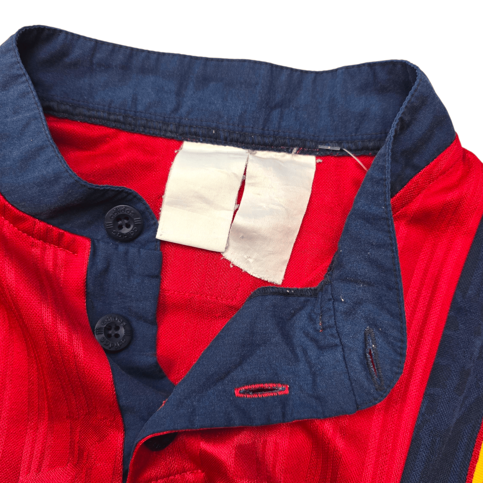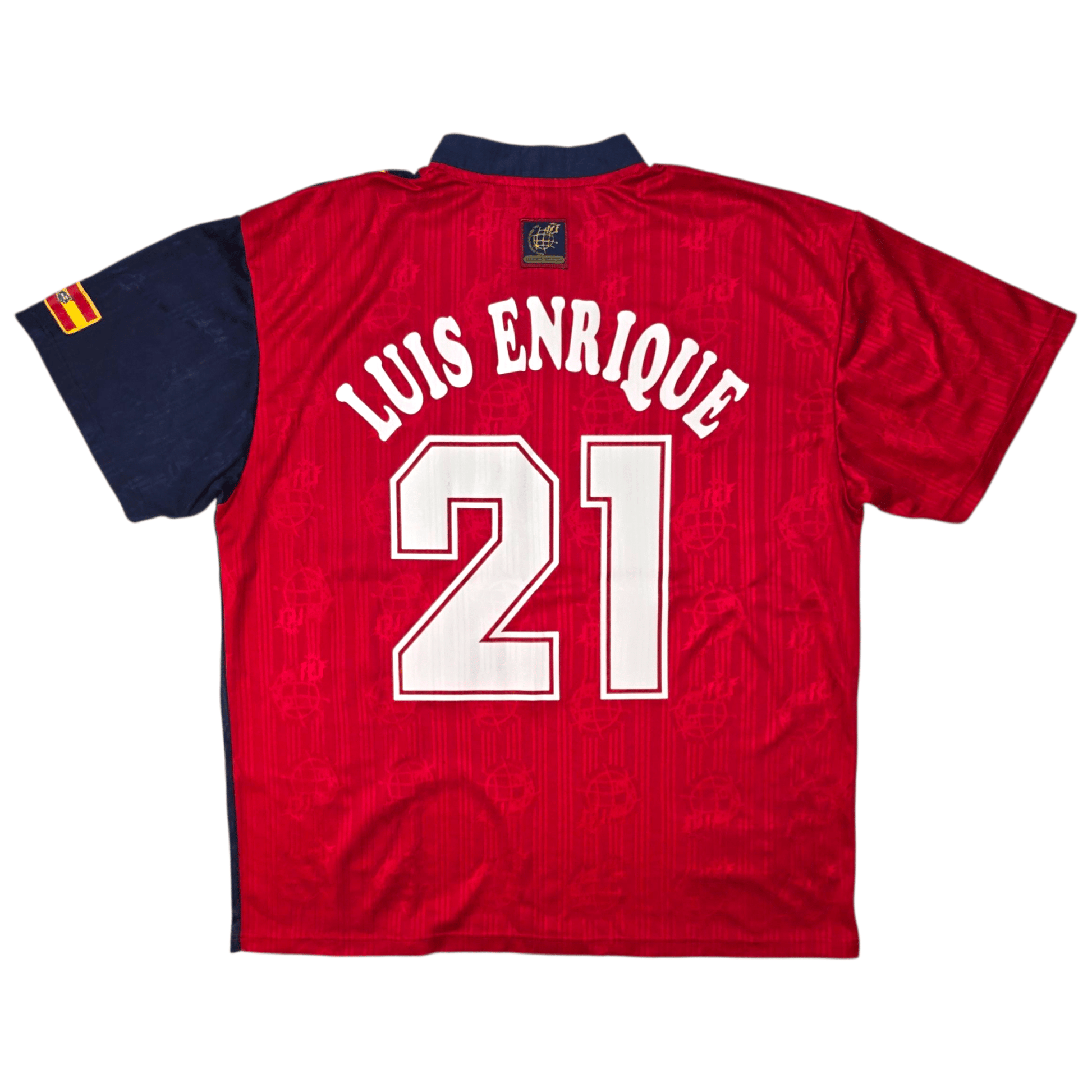 Information: Official Adidas Spain home football shirt, as worn by 'La Roja' between 1996-1998, when the side reached the quarter-finals of Euro 1996 before competing at the 1998 World Cup in France. The reverse of the shirt boasts the nameset of club legend, Luis Enrique. A fantastic vintage jersey, ideal for a collection of your own or the perfect gift for any football fan.