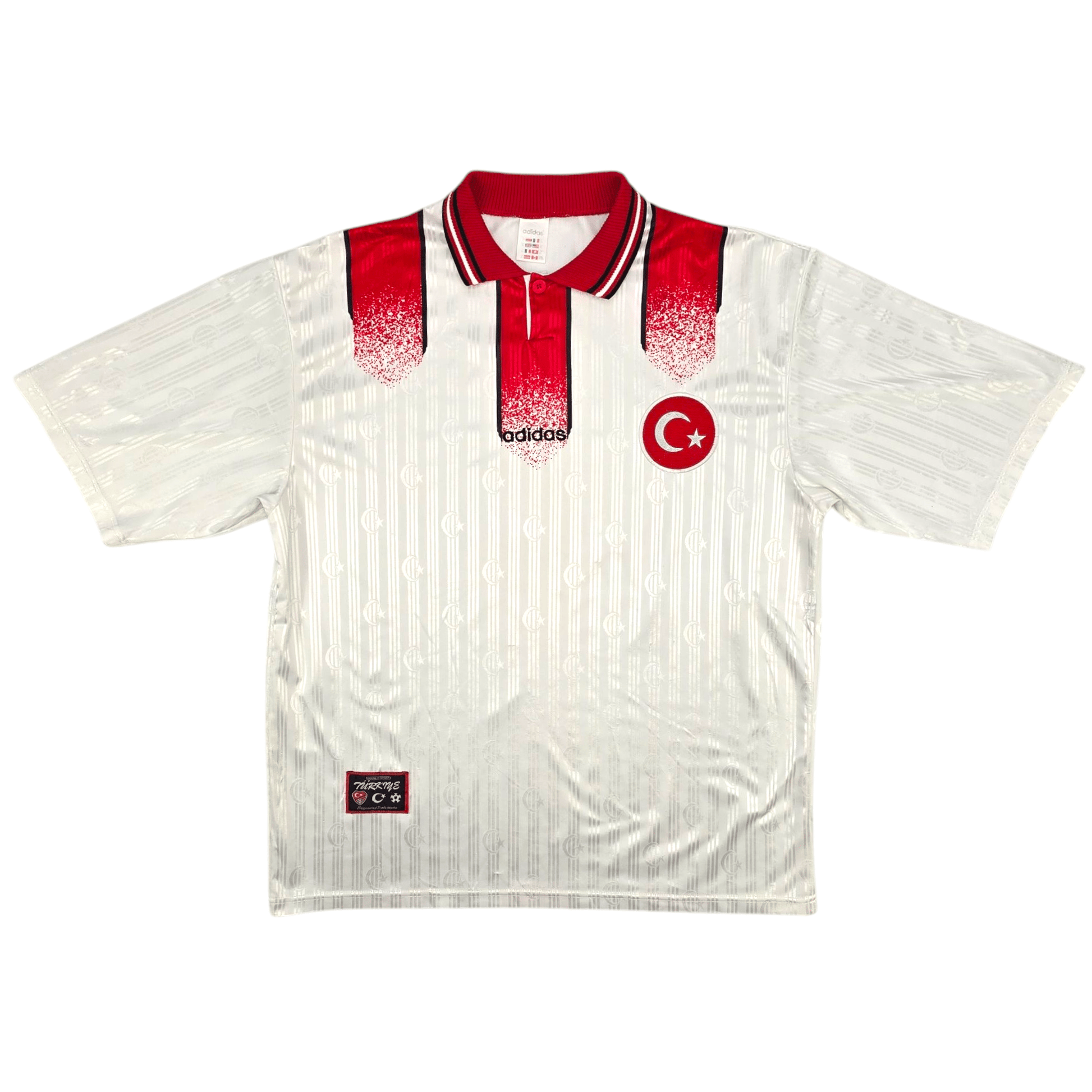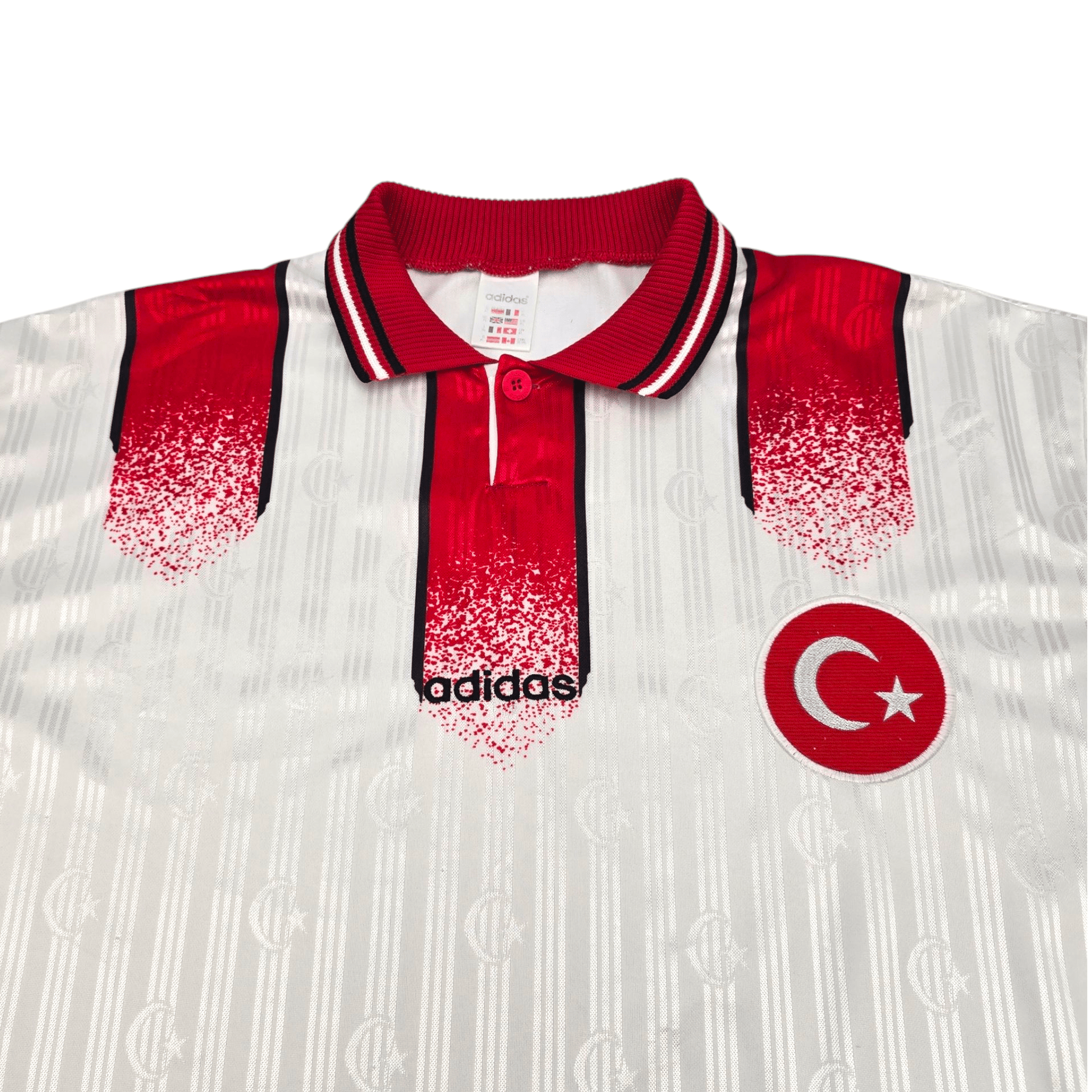 Information: Official Adidas Turkey away football shirt from 1996/98, as worn by ‘The Crescent-Stars’ during qualification for the FIFA 1998 World Cup in France, under their coach Mustafa Denizli. A fantastic vintage jersey, ideal for a collection of your own or the perfect gift for any football fan.
