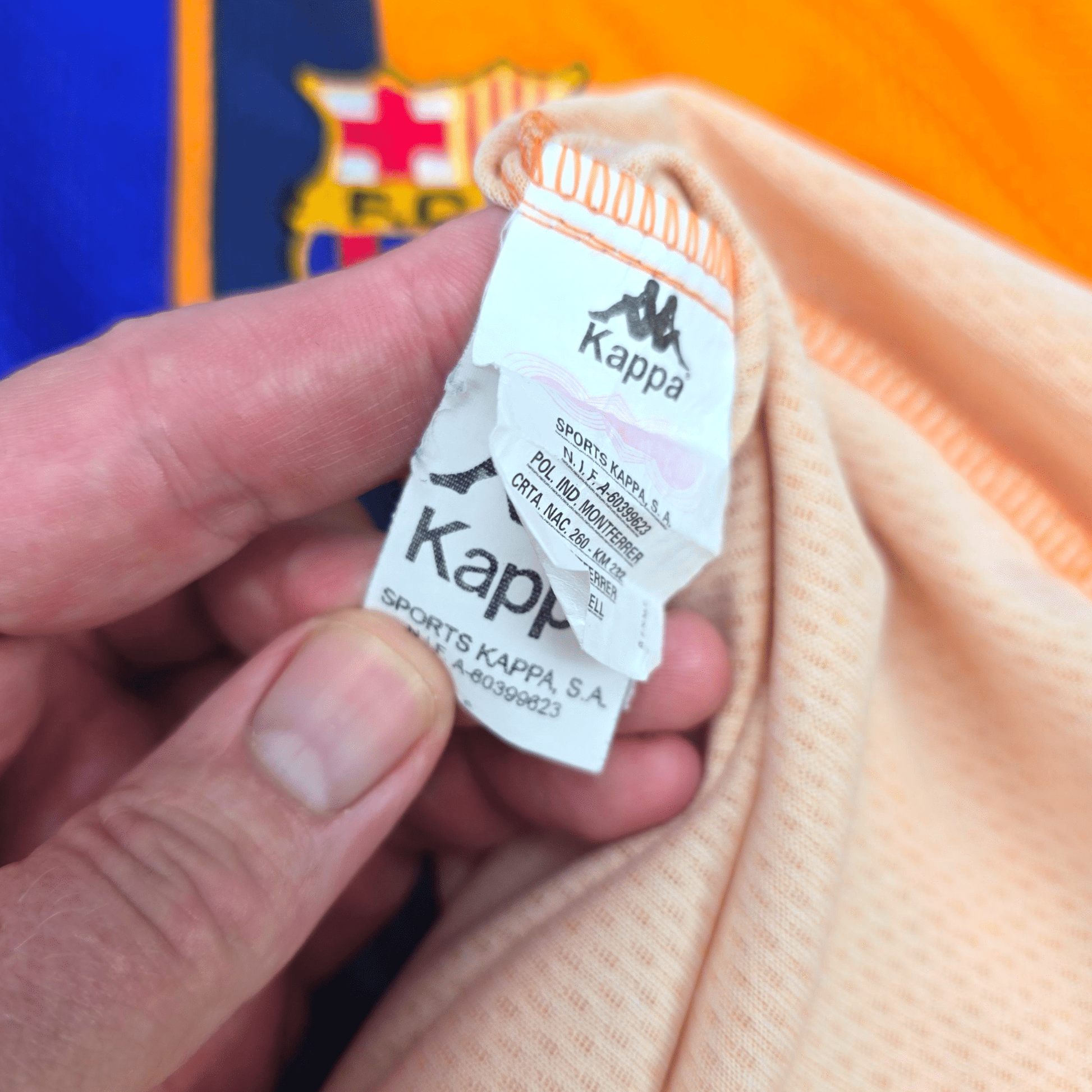 Information: Official Kappa Barcelona away football shirt, as worn by 'Barça' during the 1997/98 season, when the side won a domestic double of La Liga and Copa del Rey under Louis van Gaal. A fantastic vintage jersey, ideal for a collection of your own or the perfect gift for any football fan.