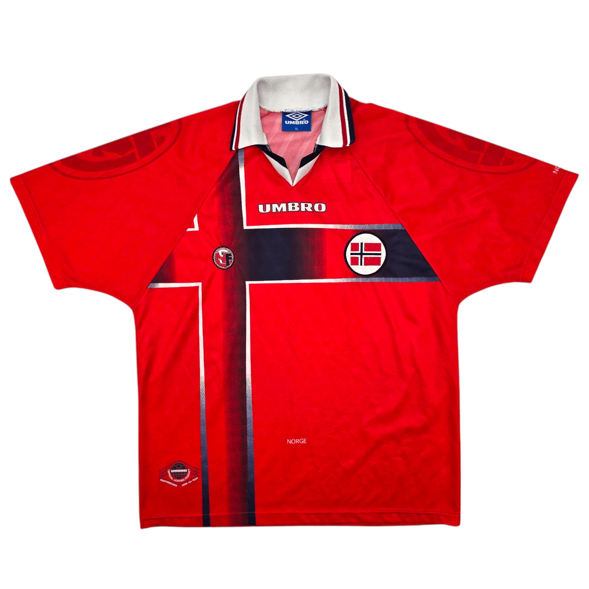 Information: Official Umbro Norway home football shirt from 1997/98, as worn by ‘Løvene’ during a successful qualification campaign for the 1998 FIFA World Cup, hosted by France.  A fantastic vintage jersey, ideal for a collection of your own or the perfect gift for any football fan.