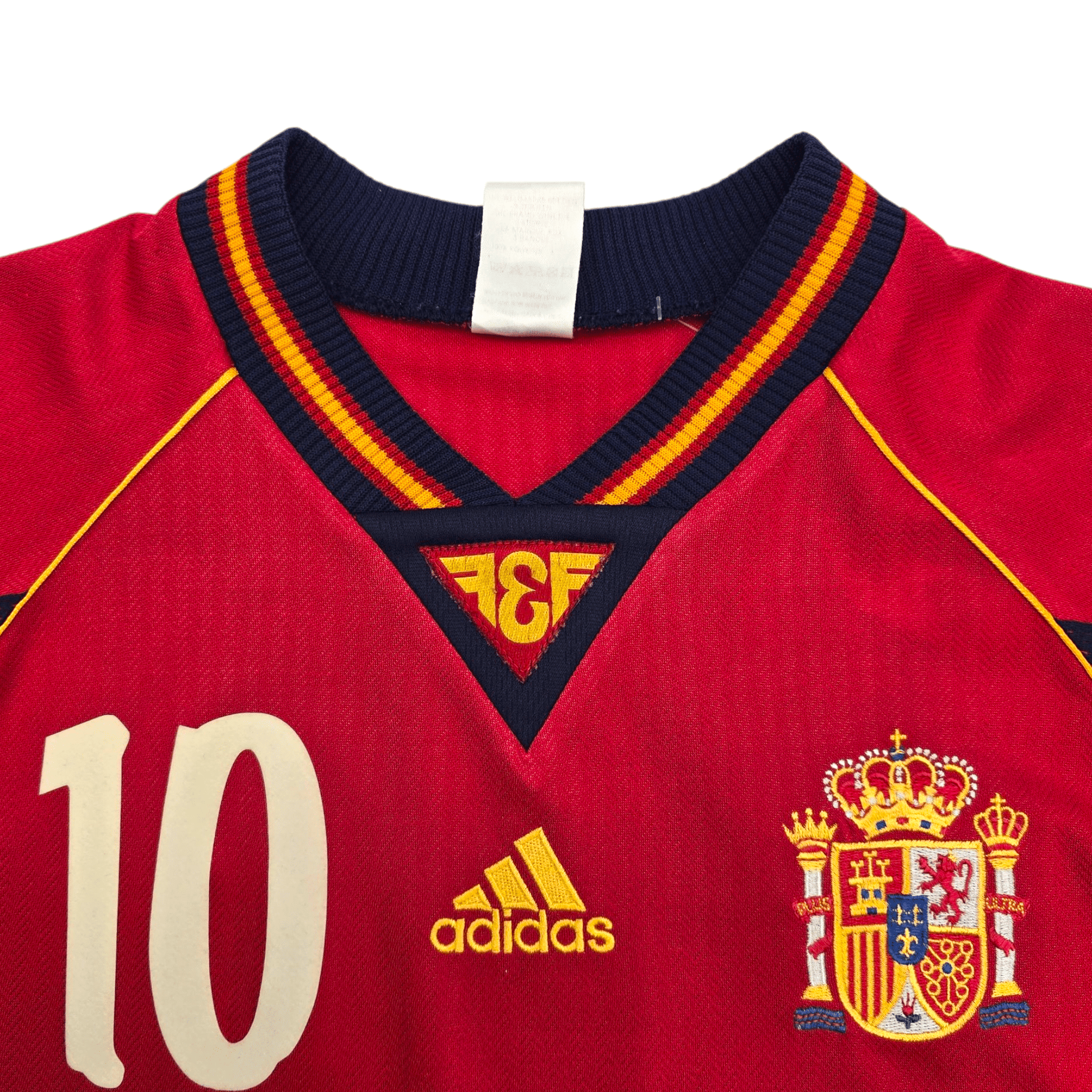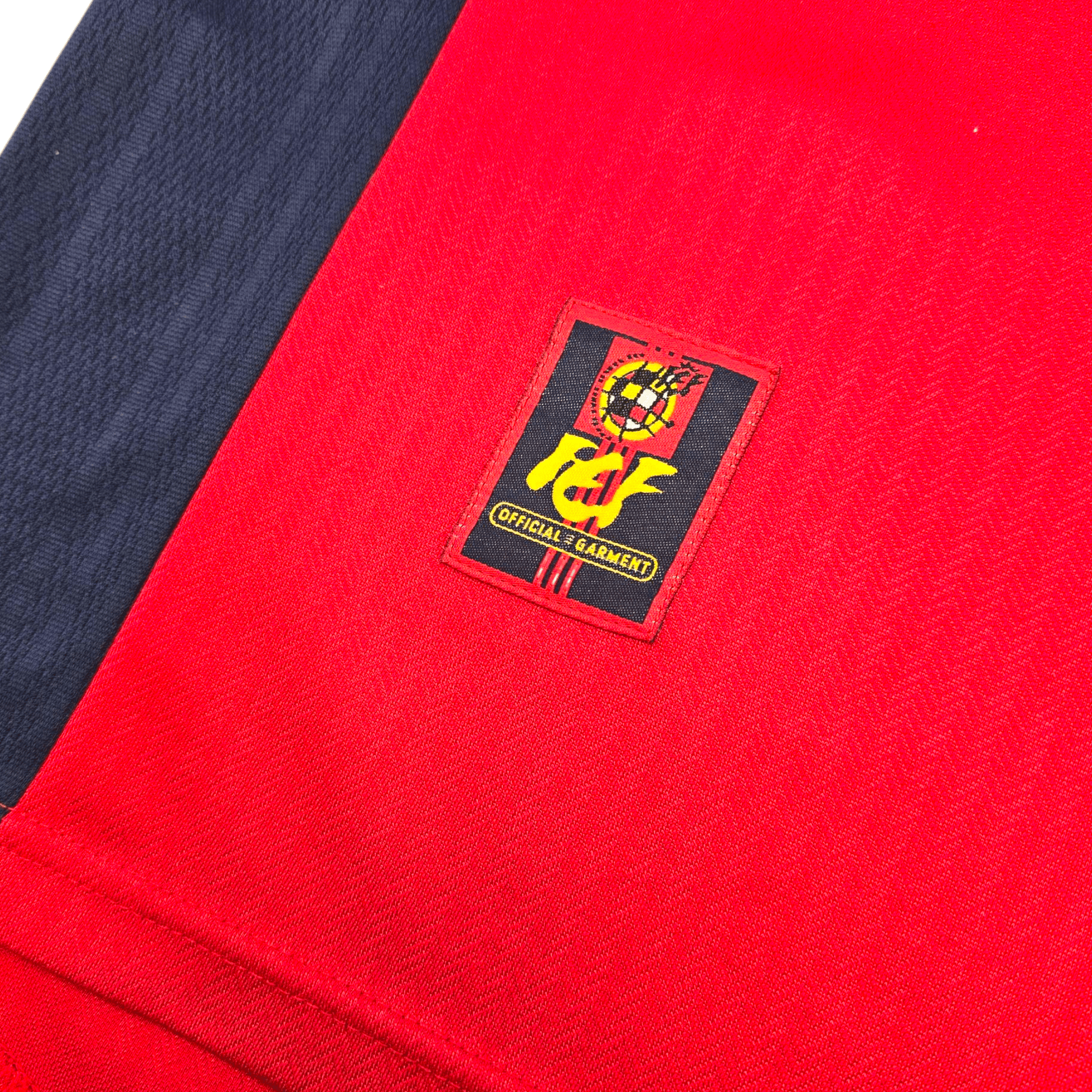 Information: Official Adidas Spain home football shirt from 1998/00, as worn by ‘La Roja’ at the 1998 FIFA World Cup when the side thrashed Bulgaria 6-1 in the final game of their opening group, but narrowly missed-out on a place in the second round behind Paraguay & Nigeria. The reverse of the shirt boasts the nameset of legendary striker, Raúl Gonzalez, who scored 44 goals in his 102 appearances for his country.  A fantastic vintage jersey, ideal for a collection of your own or the perfect gift for any football fan.