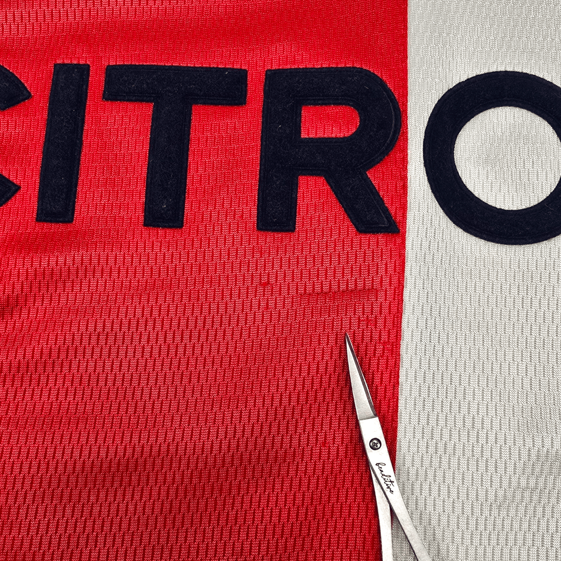 Condition: Very Good. Good colours, material is smooth with a few bobbles & small pulls, one 3cm pull to centre chest (see photo), no tears or holes. Embroidered manufacturer logo & club badge are excellent, as is flock chest sponsor. Vinyl player nameset to reverse as new. Cotton collar is slightly faded, sleeves and hem are in fabulous condition.