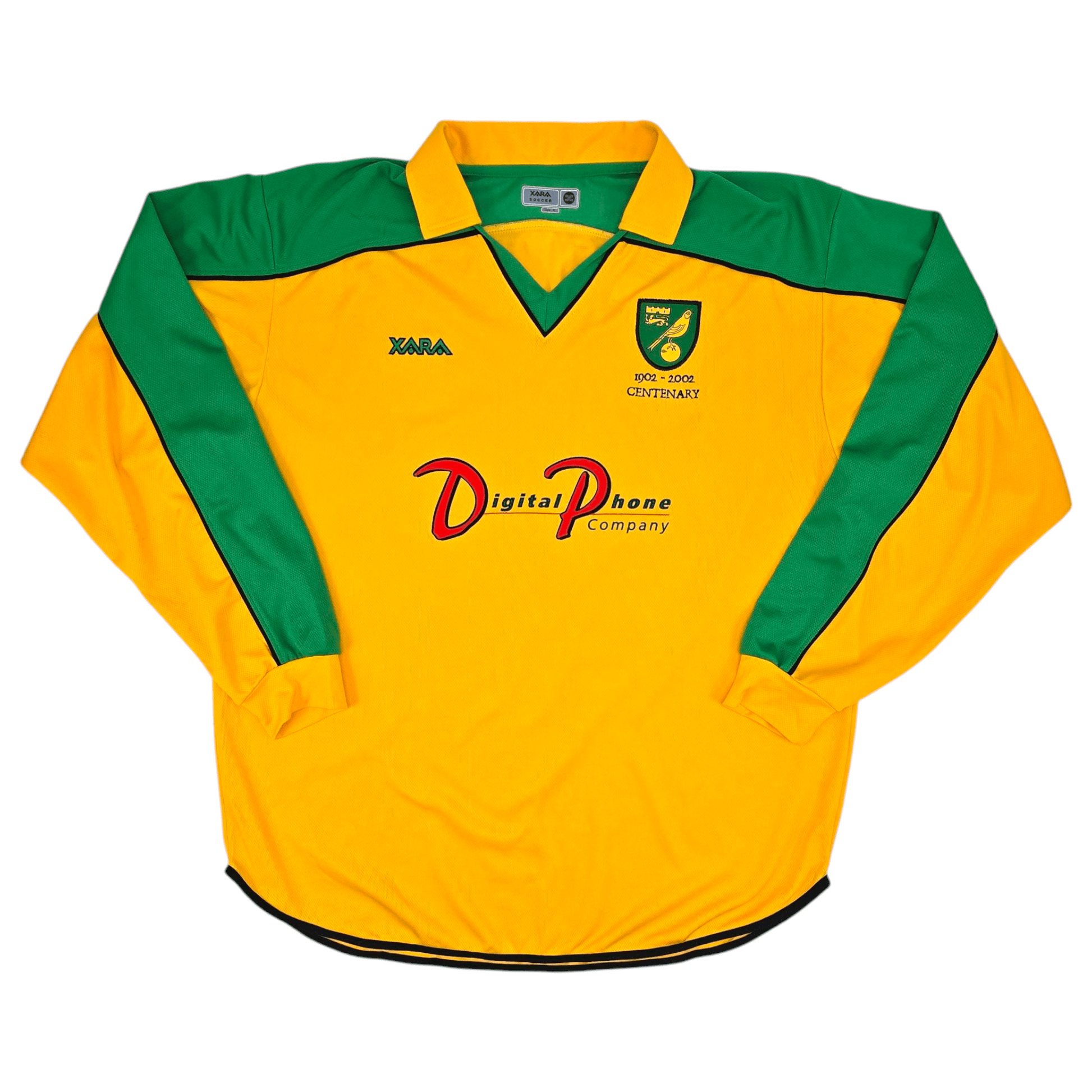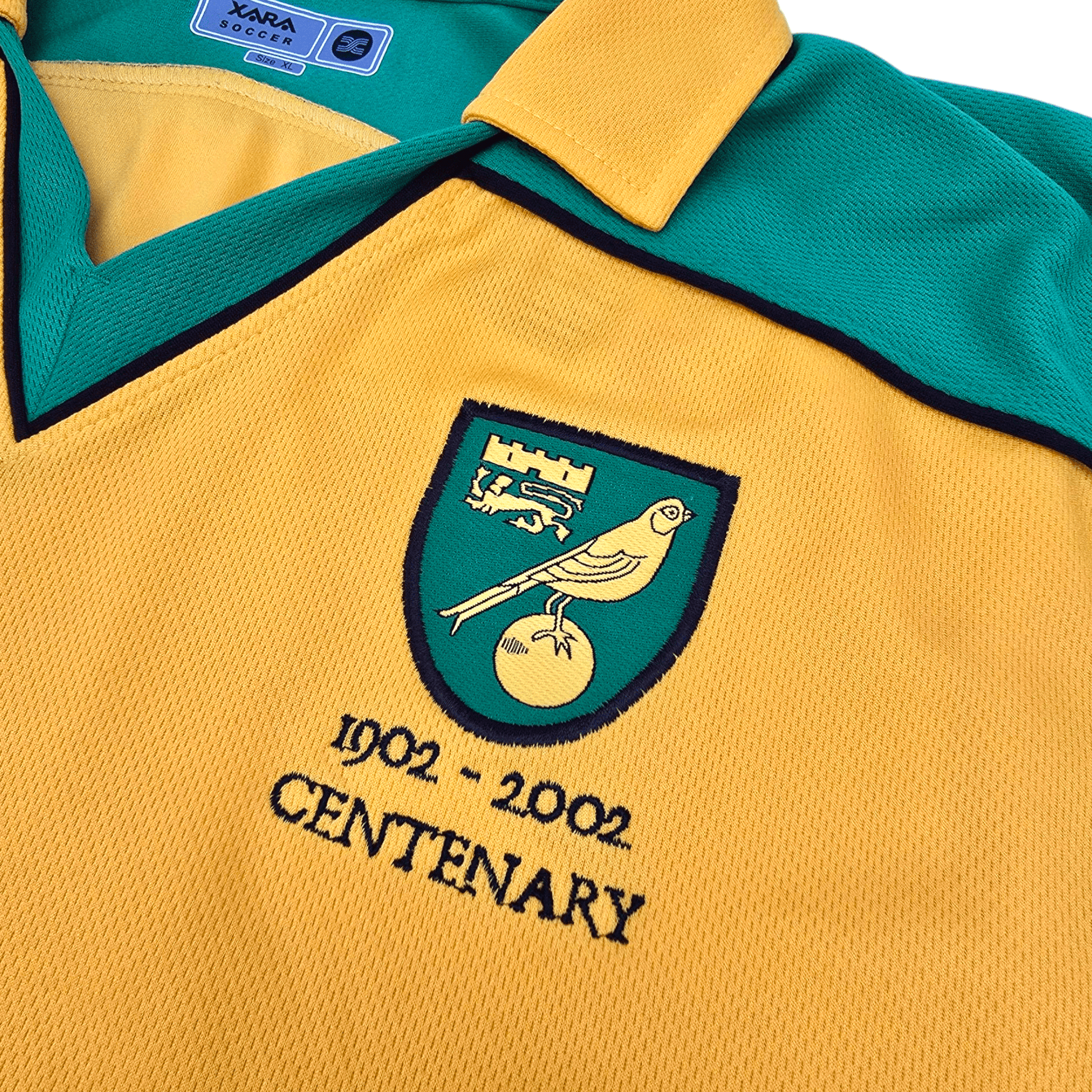 Information: Official Xara Norwich City long sleeve home football shirt from 2001/03, as worn by ‘The Canaries’ when they achieved consecutive mid-table finishes in the English First Division, under the leadership of manager Nigel Worthington. The Jersey celebrates the centenary of the Club's founding in 1902.  A fantastic vintage jersey, ideal for a collection of your own or the perfect gift for any football fan.