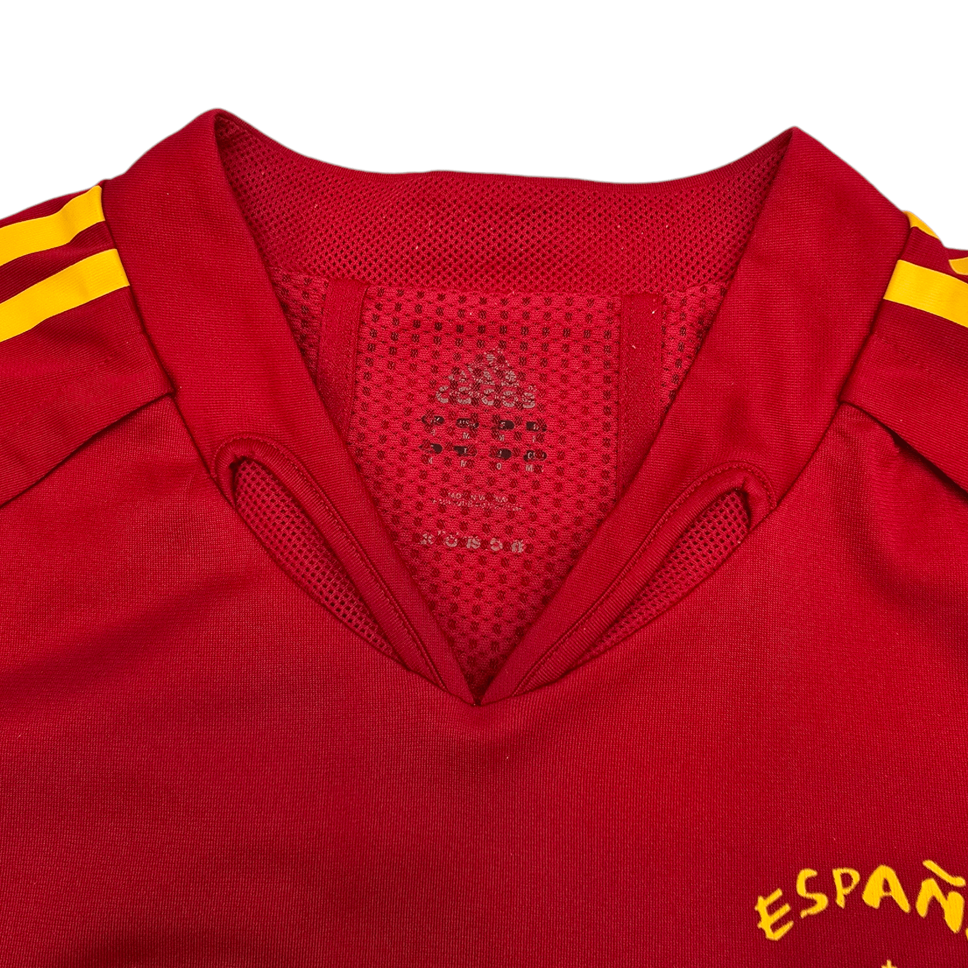 Information: Official Adidas Spain home football shirt from 2004/06, as worn by 'La Roja' when they were knocked out of the UEFA Euros 2004 in Portugal at the group stage, missing out on goal difference to eventual surprise winners Greece. The shirt is an official player issue jersey with a red mesh inner lining, known as a "dual layer" with heat pressed team badge and printed manufacturer logo. A fantastic vintage jersey, ideal for a collection of your own or the perfect gift for any football fan.