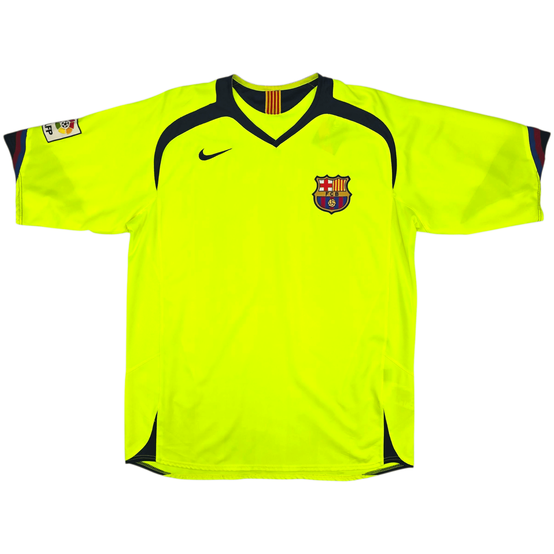 Information: Official Nike Barcelona away football shirt, as worn by 'Barça' during the 2005/06 season, famously when the club lifted the UEFA Champions League trophy in Paris. The reverse of the shirt boasts the nameset of club legend, Ronaldinho. A fantastic vintage jersey, ideal for a collection of your own or the perfect gift for any football fan.