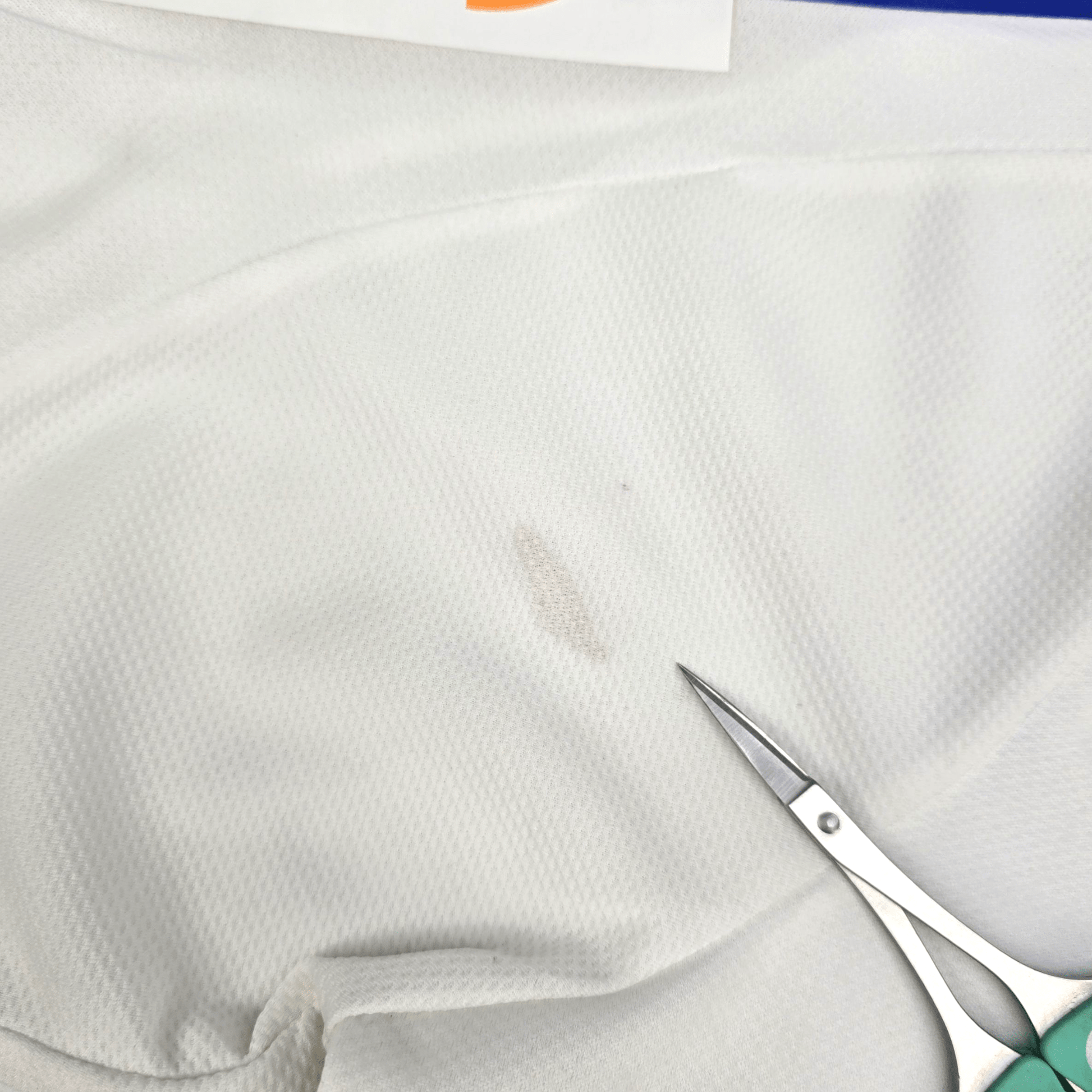 Condition: Very Good. Good colours, material is smooth with a few bobbles, small pulls & marks, some small stains, one larger stain to right sleeve (see photo), no tears or holes. Vinyl manufacturer logo & embroidered club badge are excellent. Vinyl sponsor patch to left sleeve shows minor damage (see photo). Wear to printed 'Formotion' transfer on hem. Stitched club badge to reverse is superb. Collar, sleeves and hem are in fabulous condition.