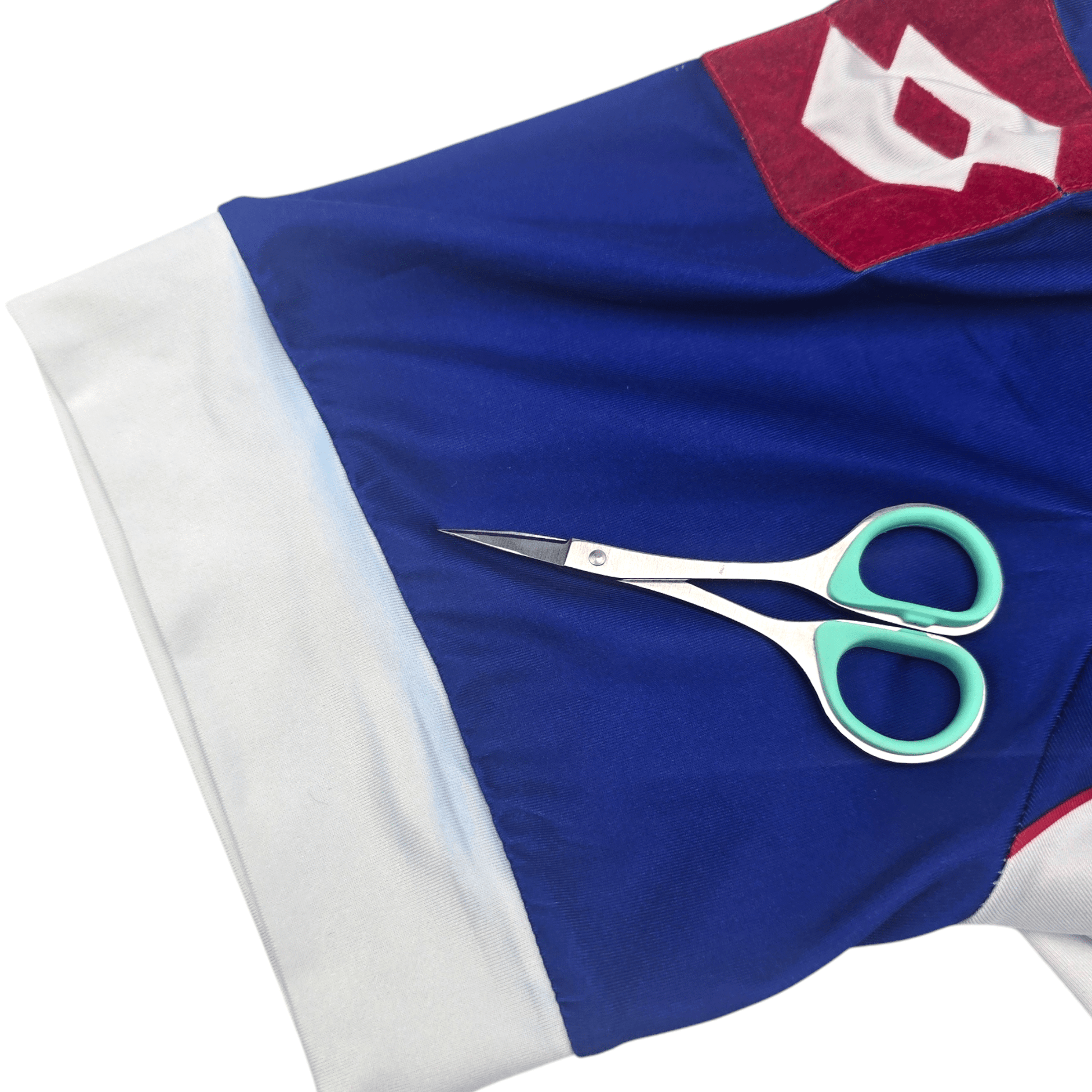 Condition: Very Good. Good colours with faint colour run on sleeves (see photos). Material is smooth and bobble-free, with some light marks on both sides, no pulls or holes. Embossed manufacturer logo and stitched club badge are excellent, as is vinyl chest sponsor.  Some wear and cracking to Lotto sleeve patches.  Vinyl player nameset on reverse in good condition.  Collar, sleeves and hem are excellent.