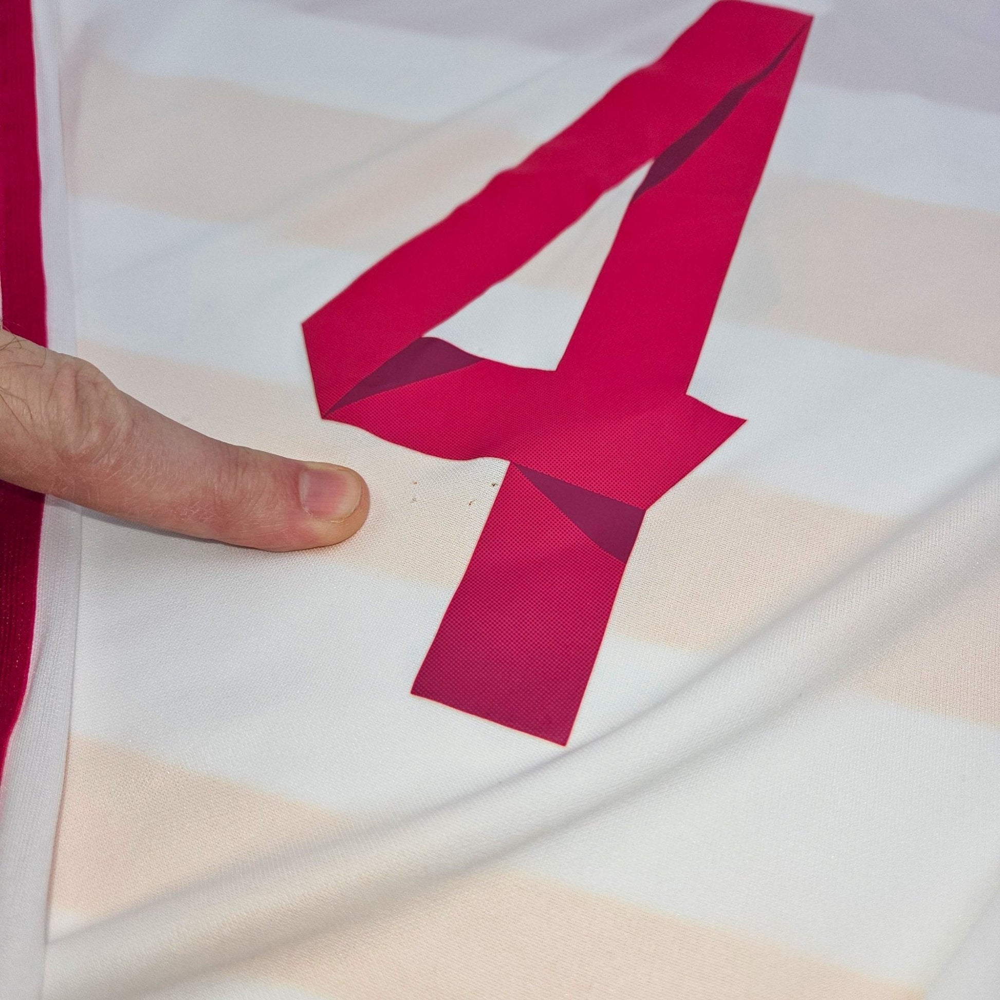 Condition:  Excellent.  Pristine colours, material is smooth with no bobbling.  A couple of very faint marks and a few tiny pin holes where material has snagged on reverse below player number (see photos). Excellent embroidered manufacturer logo.  Near mint vinyl player number and team badge.  Collar, sleeves and hems are perfect.