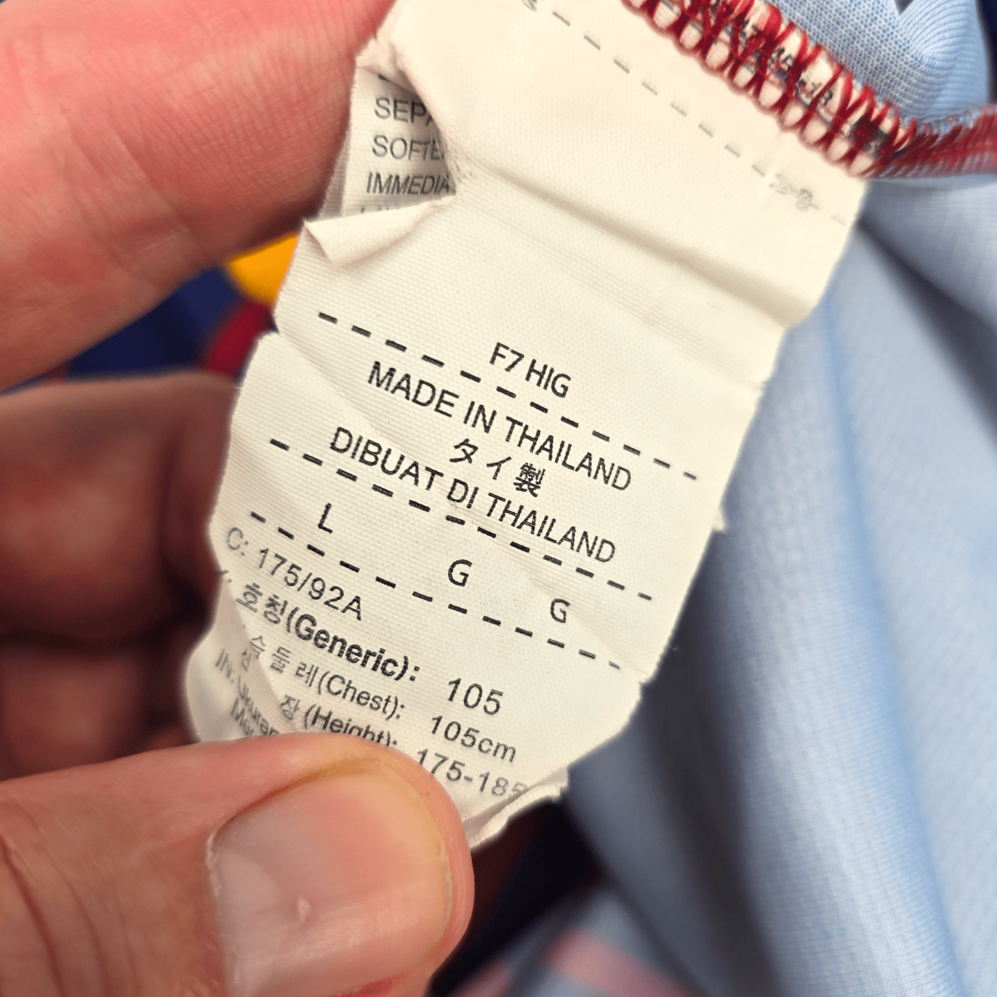 Condition: Very Good. Superb colours, material is smooth with a few tiny bobbles, no pulls, tears or holes. Embroidered manufacturer logo & stitched club badge are excellent. Vinyl chest sponsor has some very light cracking, but is still 100% complete. Light wear to vinyl sleeve sponsor (see photo). Nike official patch to lower hem is missing (see photo), however our checks of the material, stitching, labels, badges, sponsor and logos give us 100% confidence this shirt is 100% authentic. Vinyl player nameset to reverse is as new, Collar, sleeves and hem are in fabulous condition.