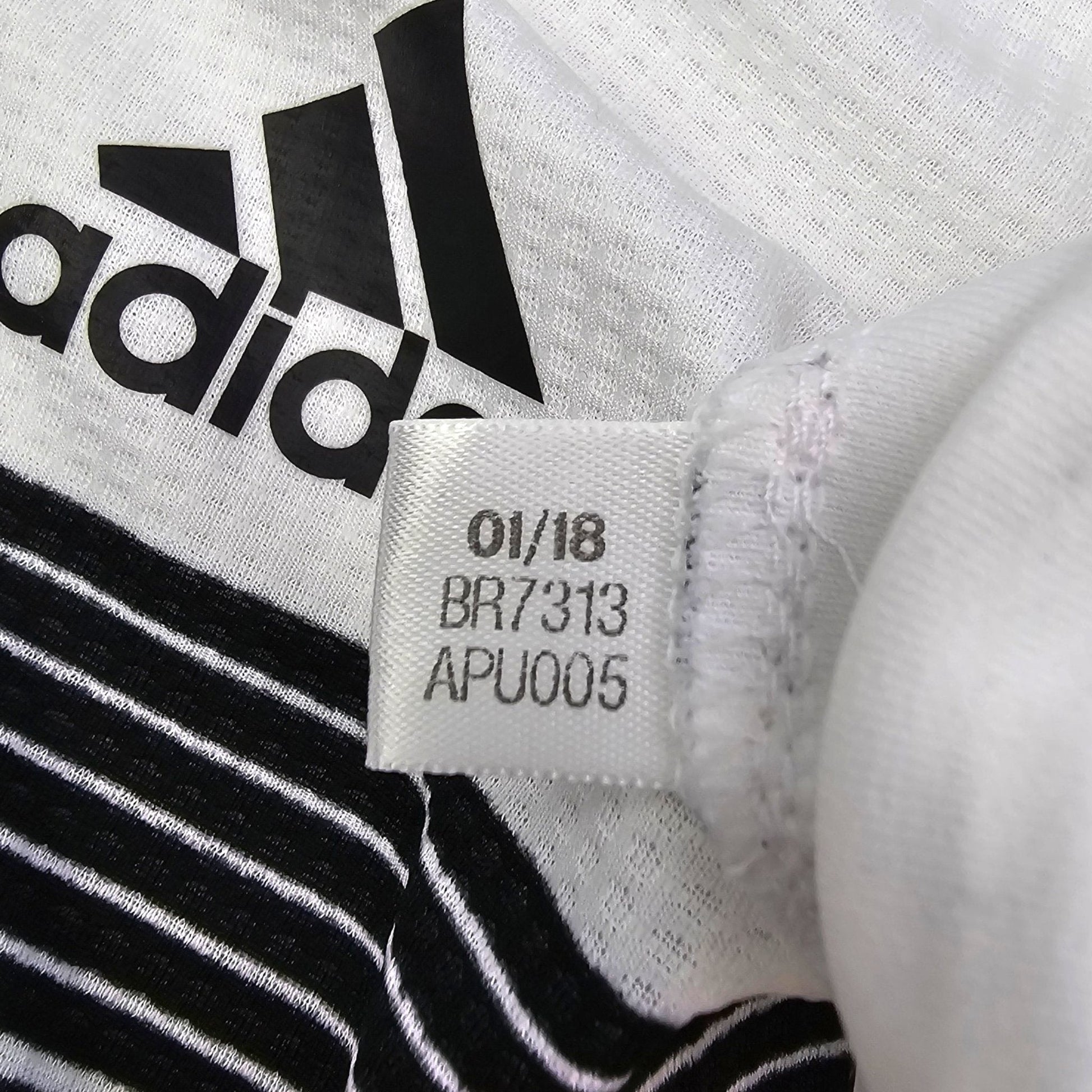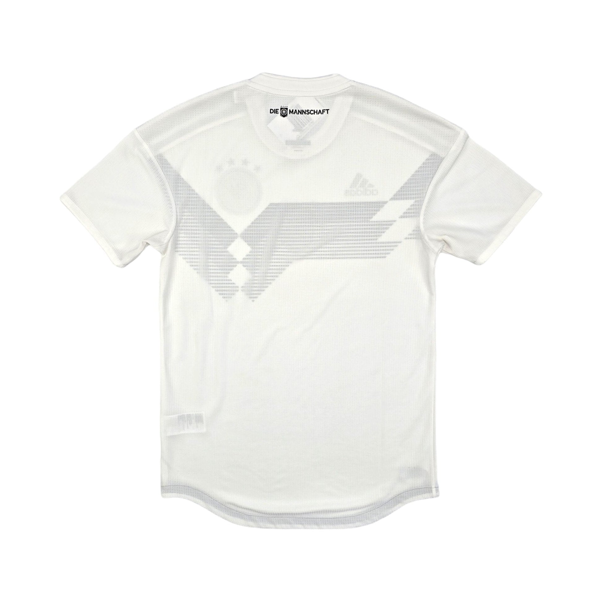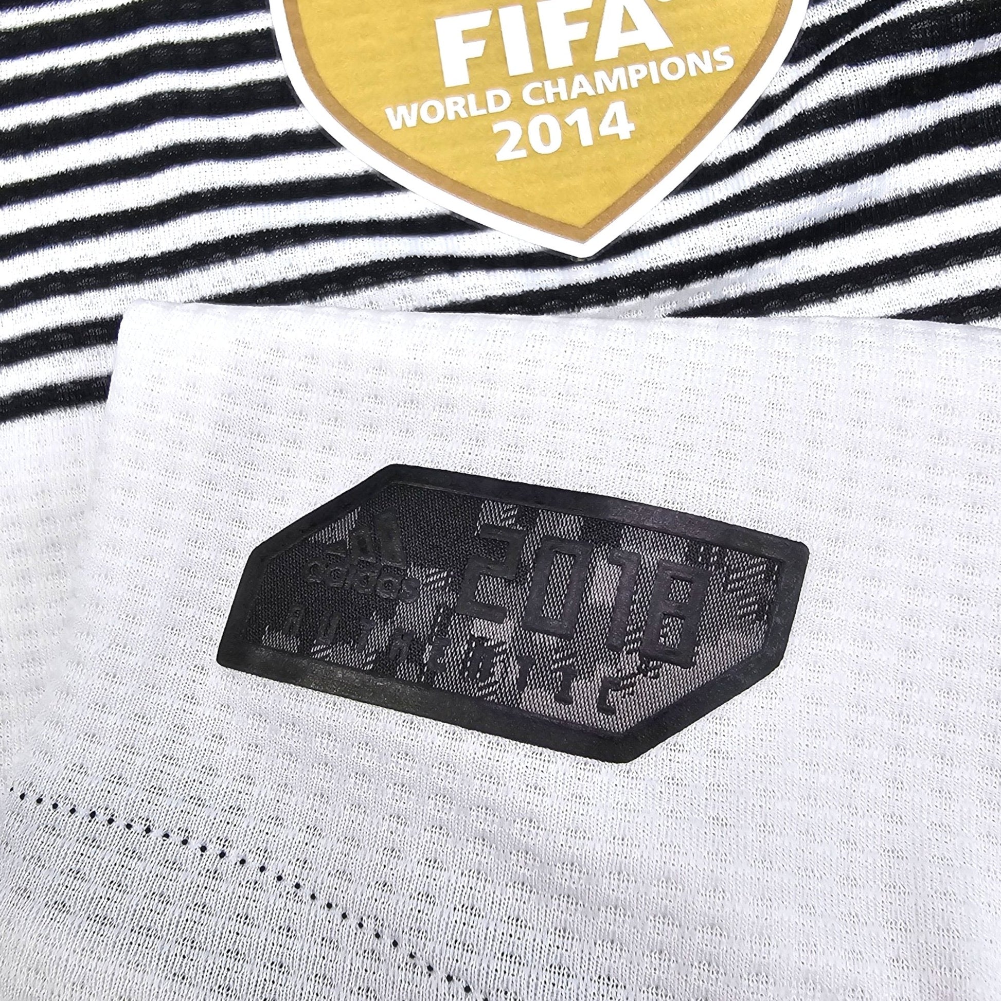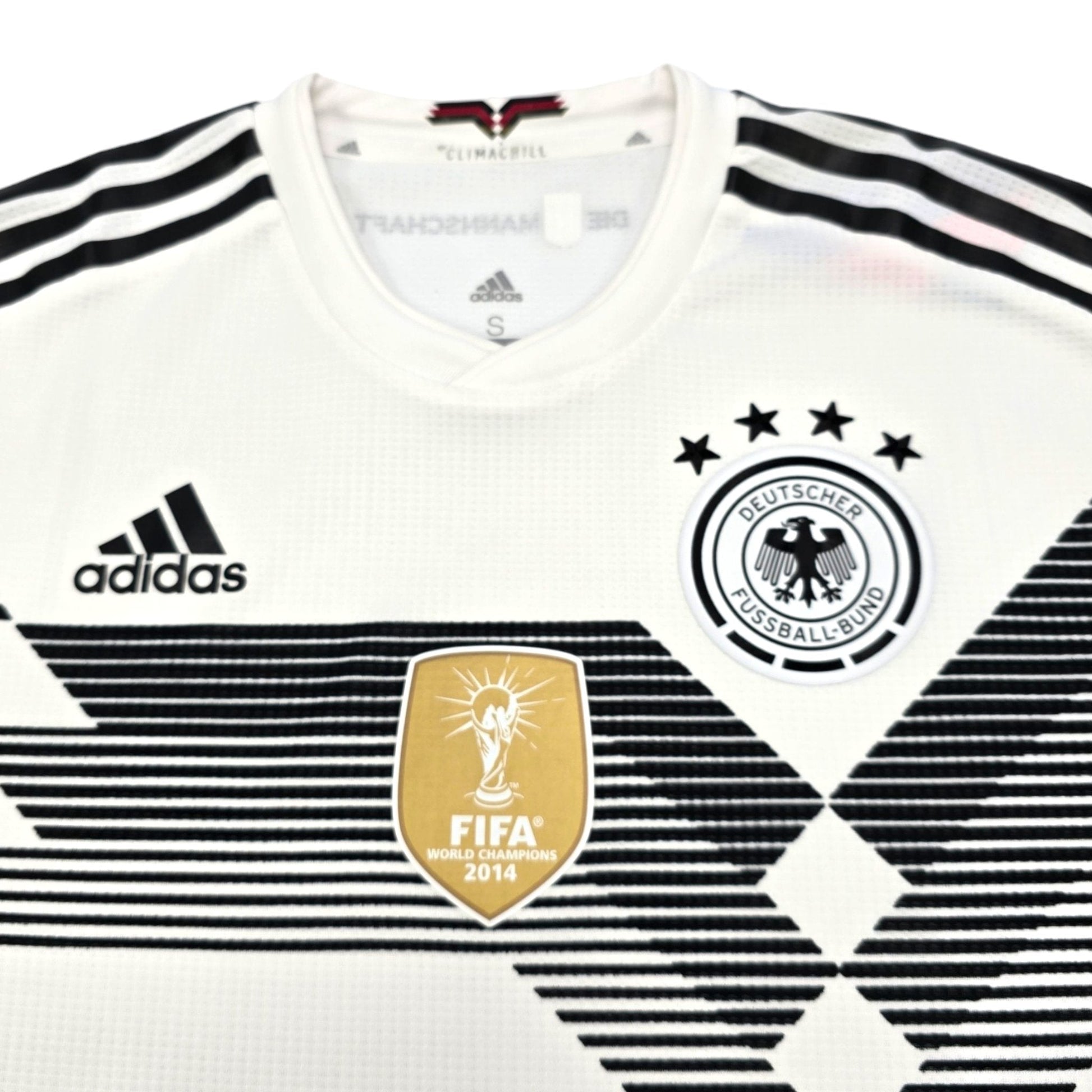 Information: Official Adidas Germany home football shirt from 2018/19, as worn by ‘Die Mannschaft’ during their three group stage games at the 2018 FIFA World Cup, as they sought to retain their trophy in Russia. Despite victory against Sweden, thanks to a spectacular late Tony Kroos strike, defeats to both Mexico & South Korea saw the Germans take an early exit, finishing bottom of Group F. This is the official player version jersey, which uses 'Climachill' technology to cool the body by dissipating heat and wicking away moisture. A fantastic jersey, ideal for a collection of your own or the perfect gift for any football fan.
