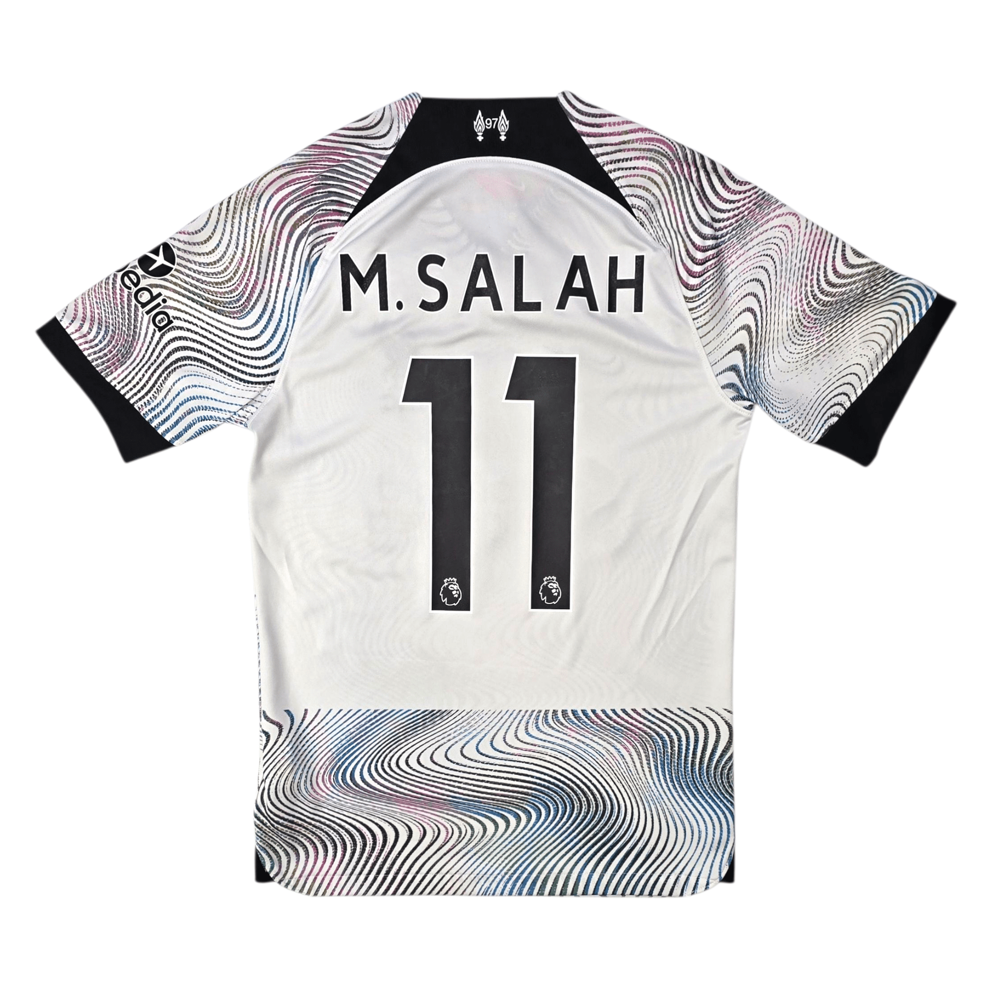 Information: Official Nike Liverpool away football shirt, as worn by 'The Reds' during the 2022/23 season. The reverse of the shirt boasts the nameset of club legend, Mohamed Salah. A fantastic jersey, ideal for a collection of your own or the perfect gift for any football fan.