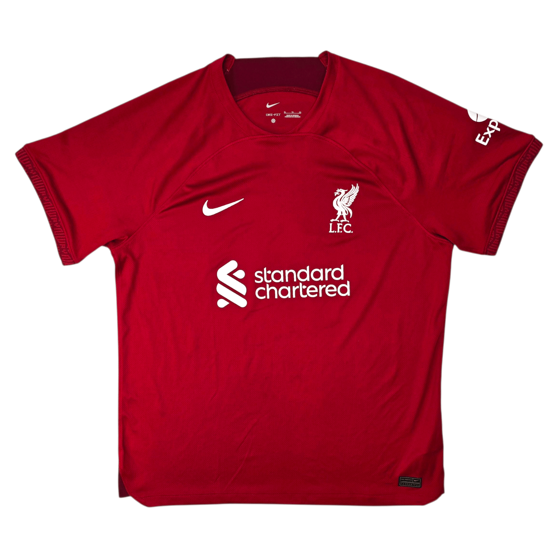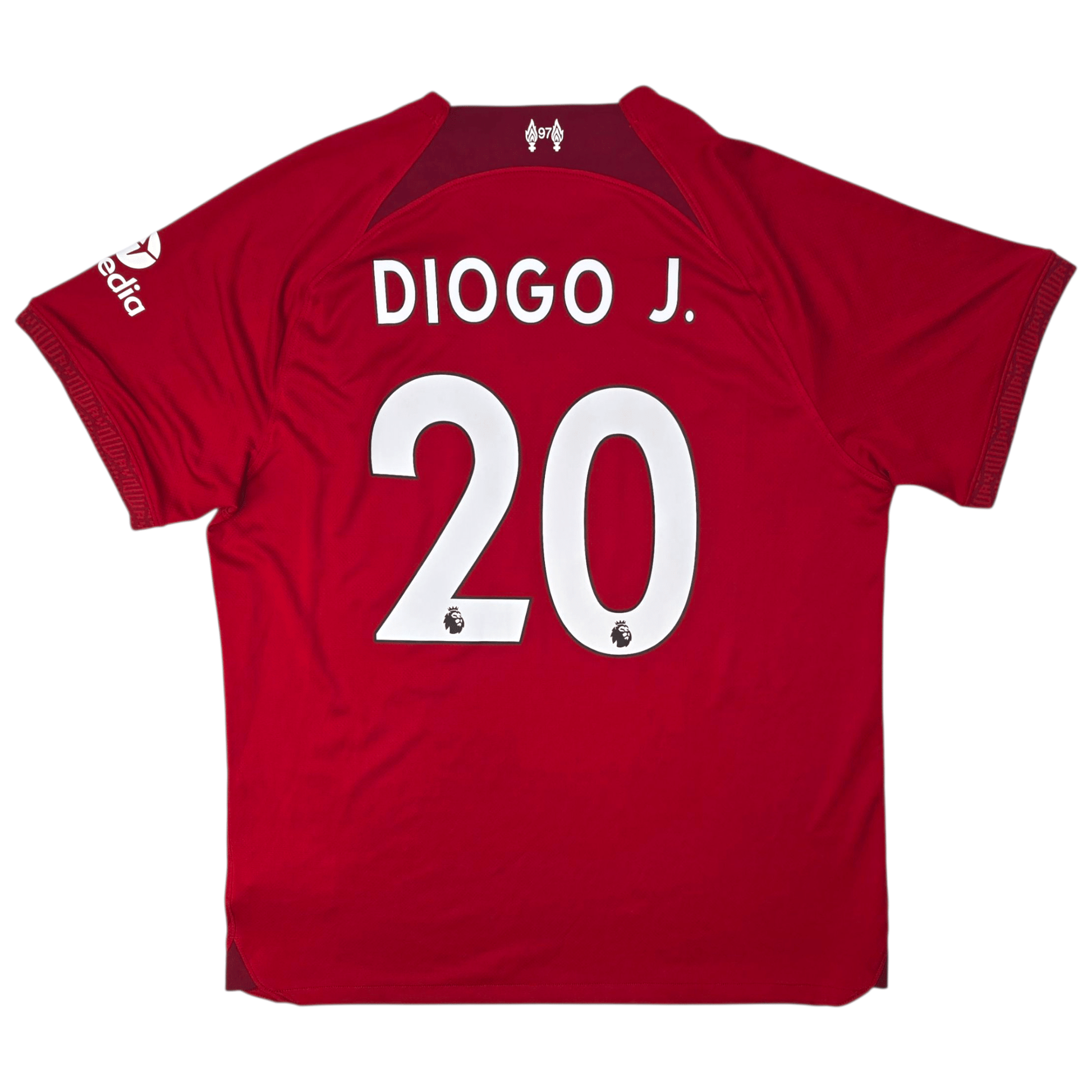 Information: Official Nike Liverpool home football shirt, as worn by 'The Reds' during the 2022/23 season, when the side pushed for Champions League qualification and mounted a late surge in the Premier League table. The reverse of the shirt boasts the nameset of club legend, Diogo Jota. A fantastic jersey, ideal for a collection of your own or the perfect gift for any football fan.