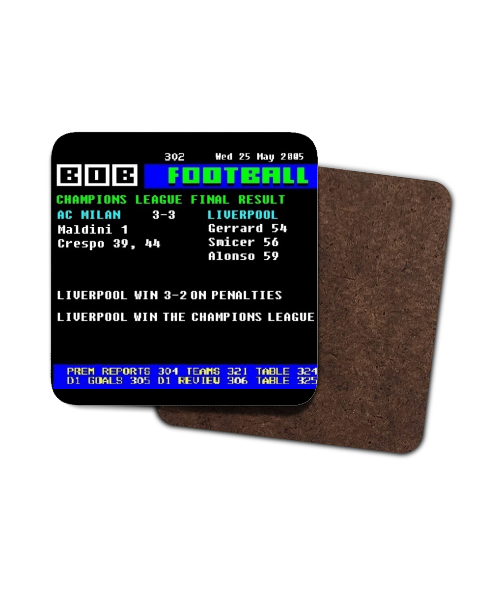 A Ceefax style coaster celebrating Liverpool's Champions League win in 2005.
