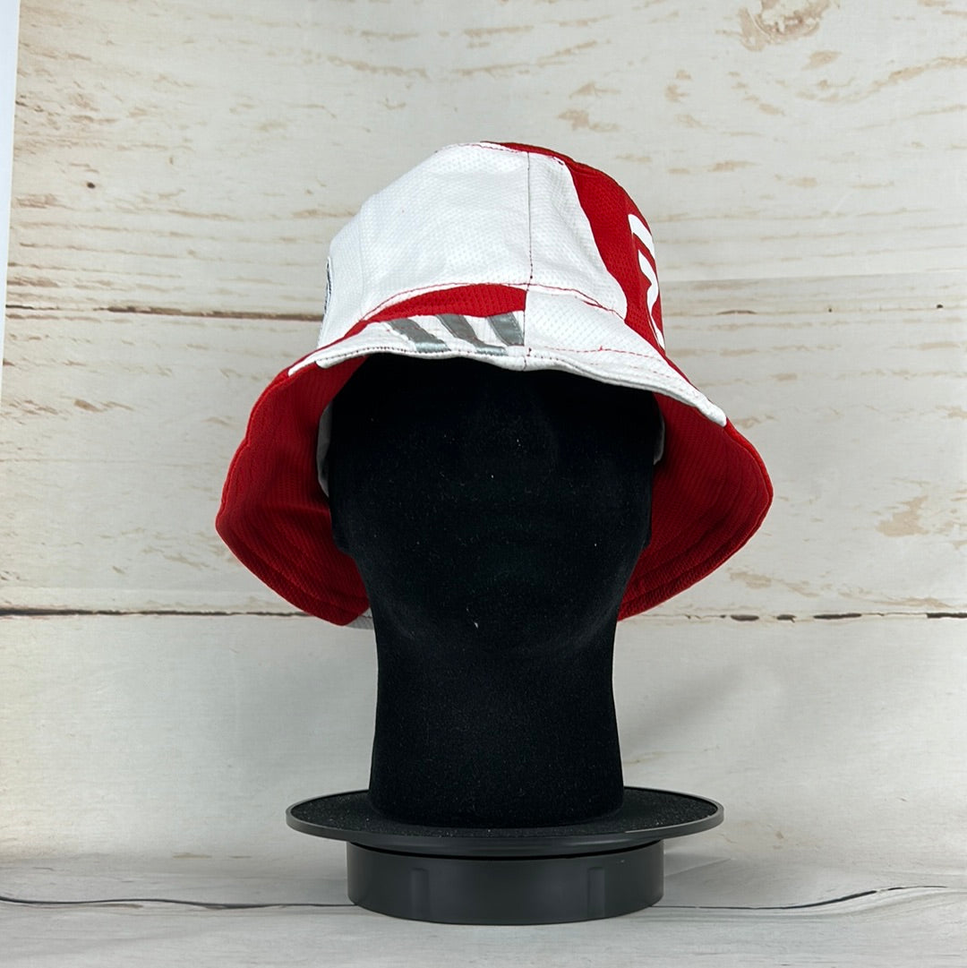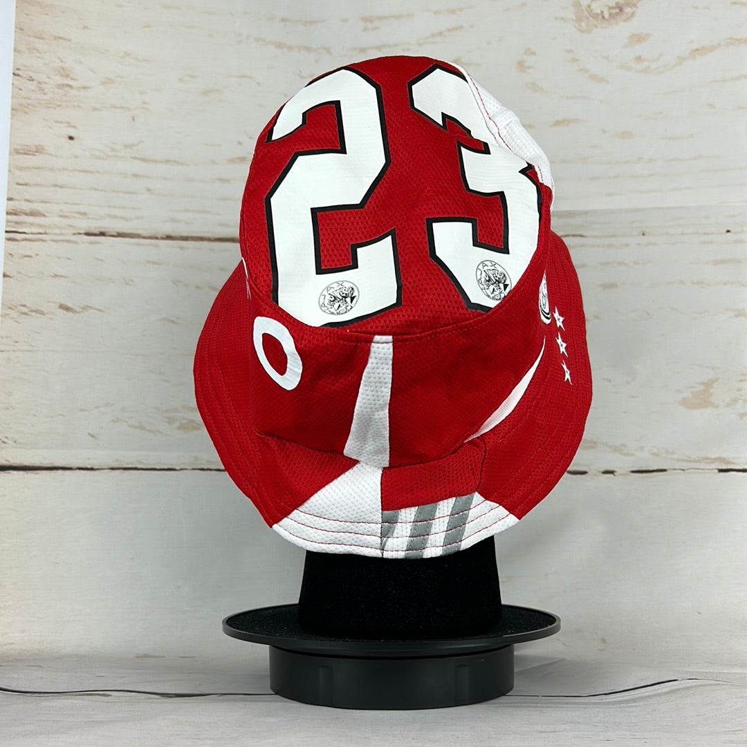 Bucket Hat Info: A custom upcycled bucket hat made from an authentic Ajax Amsterdam 2021-2022 home shirt. The red and white bucket hat features; the white 'Ziggo' sponsor and the Ajax badge. It has the white 3-stars printed on the brim. And the number '23' print is on the top of the hat.