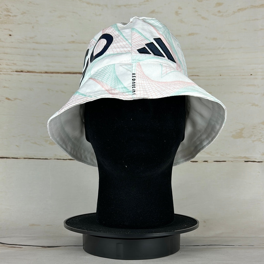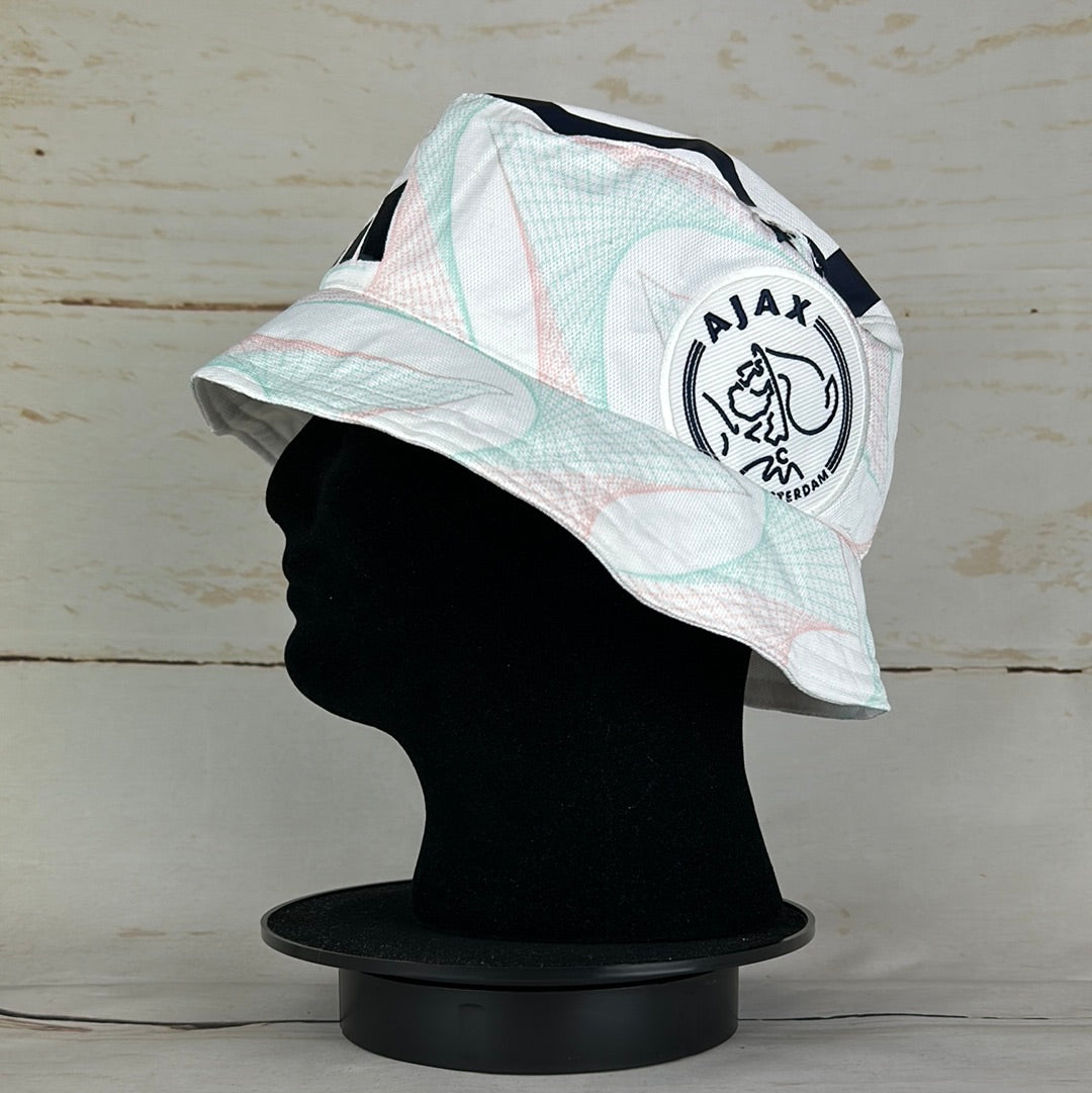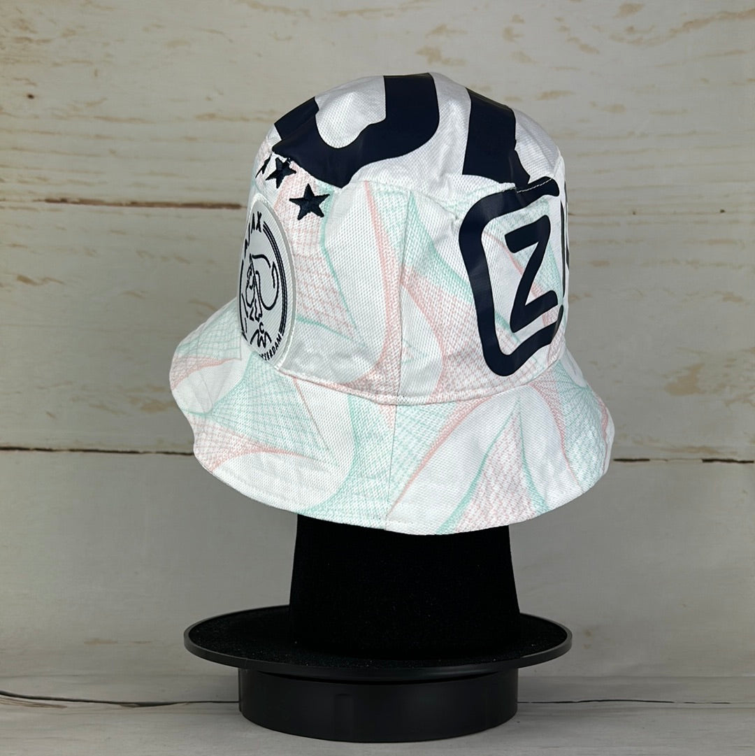 Bucket Hat Info: A custom upcycled bucket hat made from an authentic Ajax Amsterdam 2023-2024 away shirt. The white bucket hat features; the turquoise and pink overlayed pattern on the white base seen on this seasons away shirt, an Ajax 2-star badge and the navy 'Ziggo' sponsor on the side. The hat also has part of the number '10' print on the top.