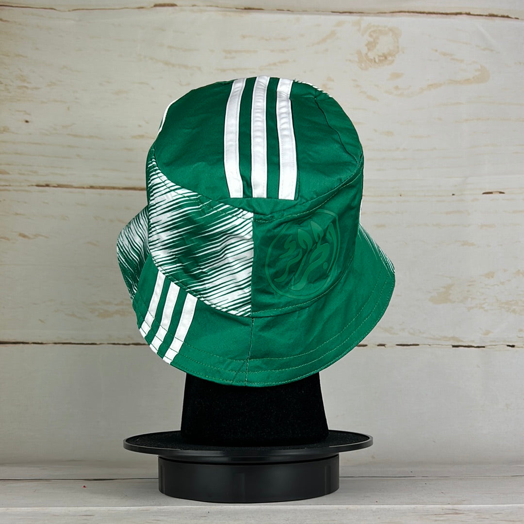 Bucket Hat Info: A custom Algeria 2022 home shirt bucket hat. This is made from a white and green home shirt which has the Algeria badge on the side with the gold Adidas logo on the brim.