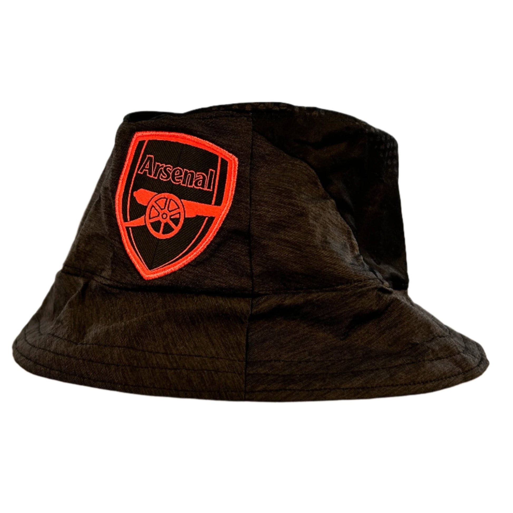 Bucket Hat Info: An Arsenal 2017/18 away shirt upcycled by the team into a unique bucket hat. The hat looks great with the bright pink shirt details set off well against the black. The hat has the Arsenal badge on the side and Puma logo.