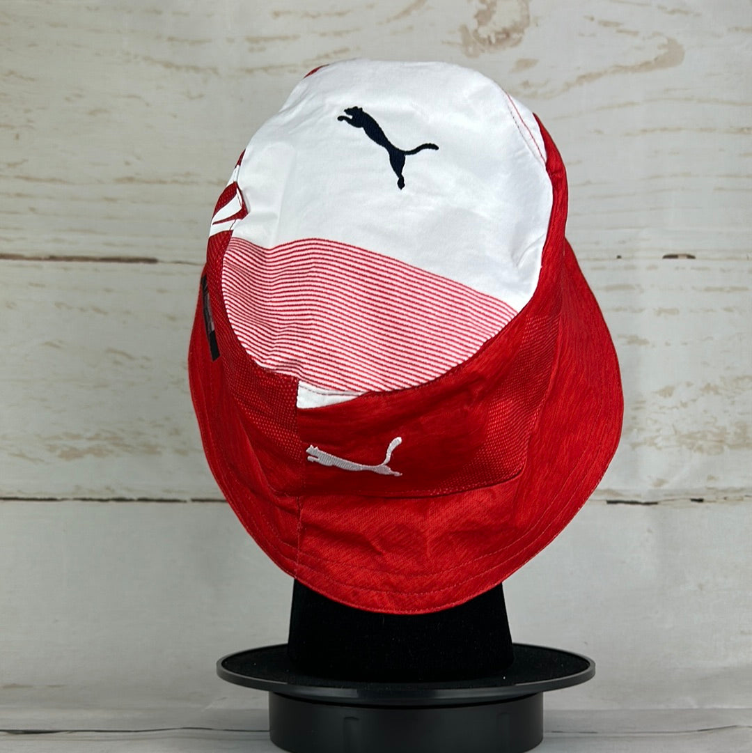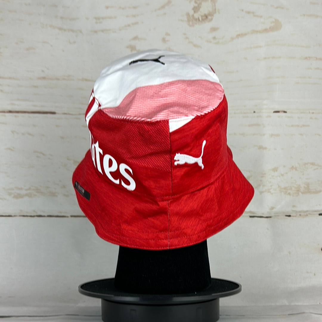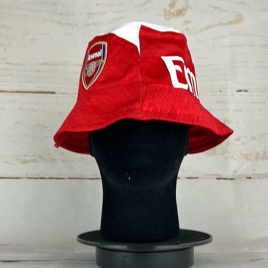 Bucket Hat Info: A custom bucket hat from a 2018/2019 Arsenal home shirt. This Arsenal bucket hat has the Emirates sponsor on the side as well as the Arsenal badge. The Puma logo is on the top.