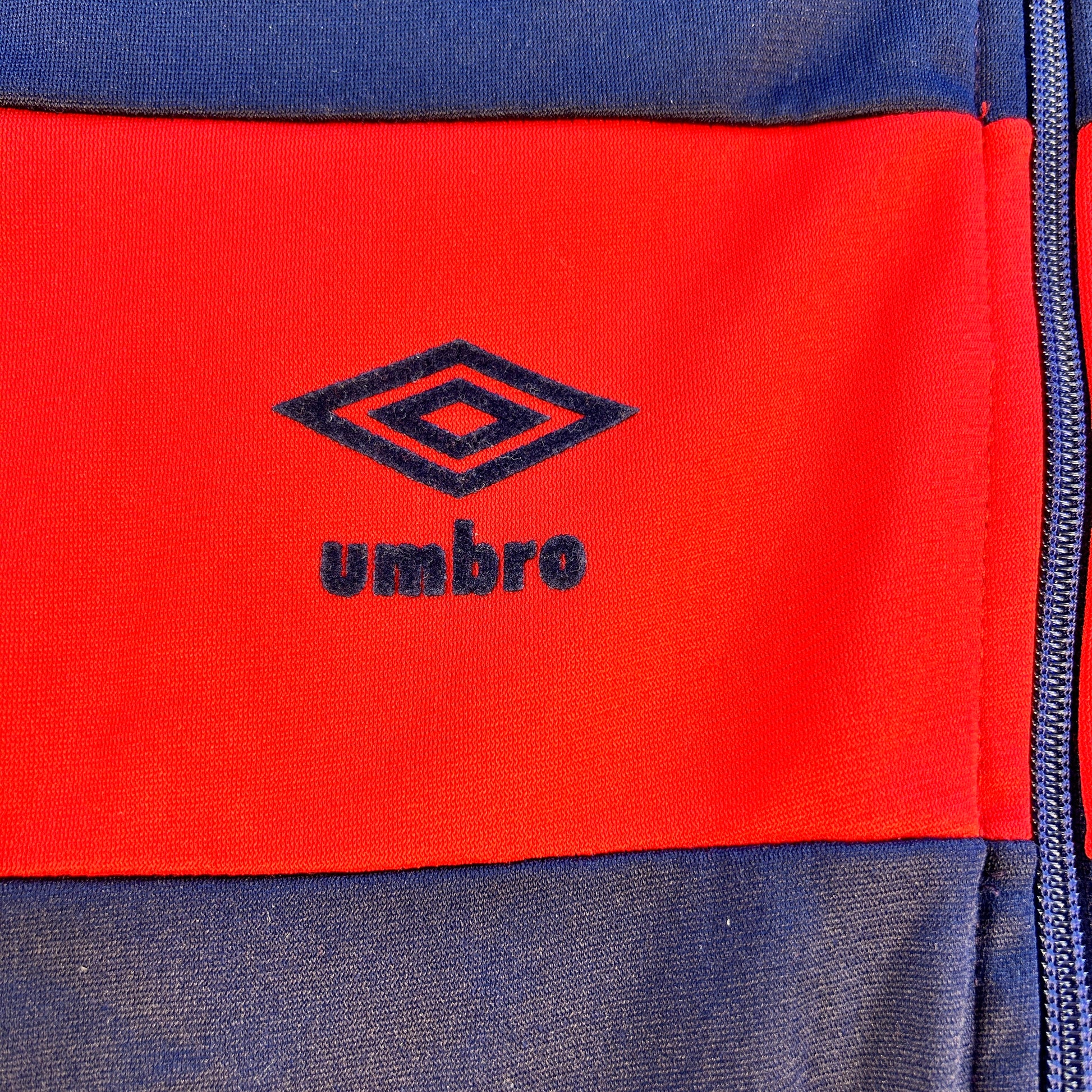 Condition: 8.5/10. The jacket is in very good condition. The zipper is missing, and there are slight signs of wear. The felt UMBRO logo is excellent.