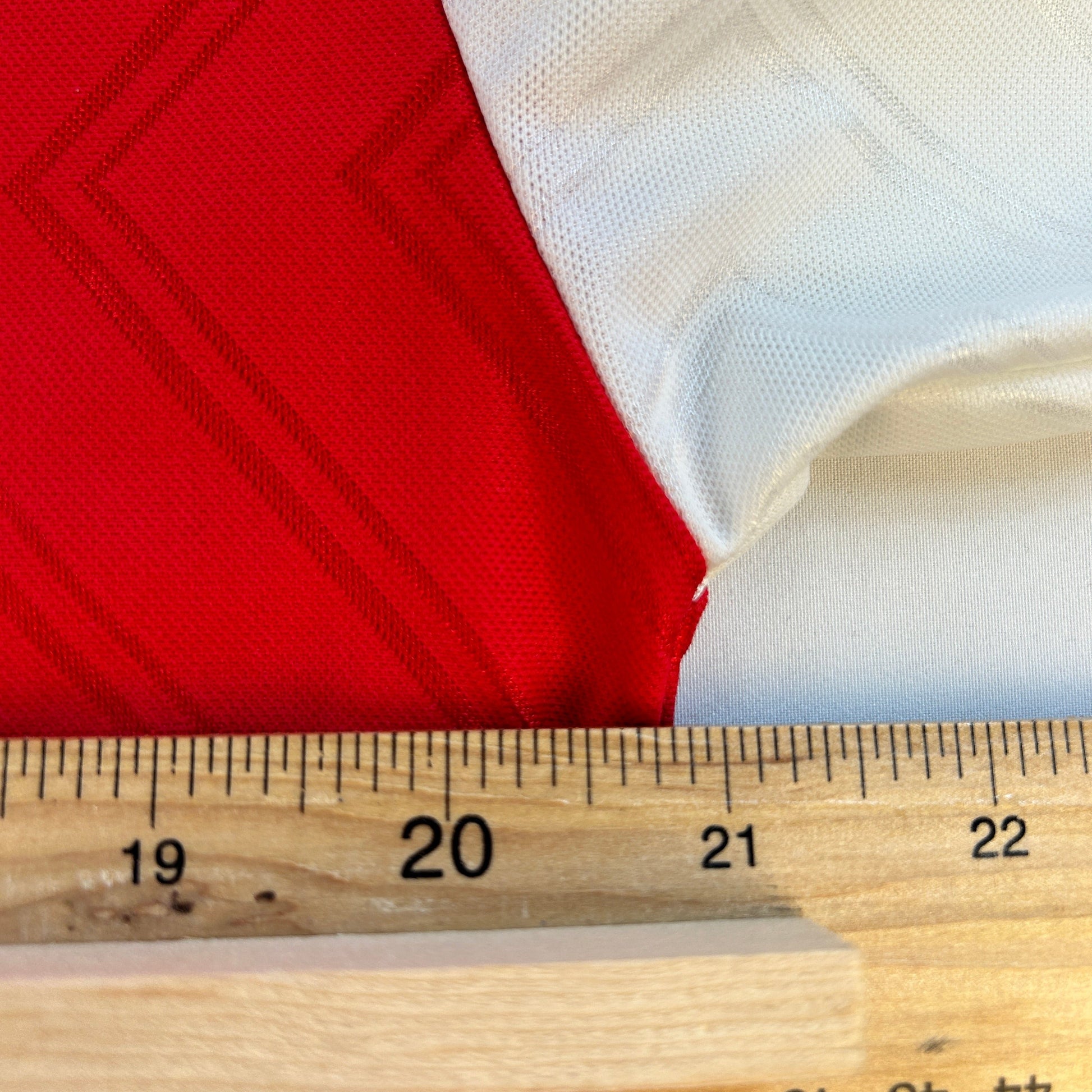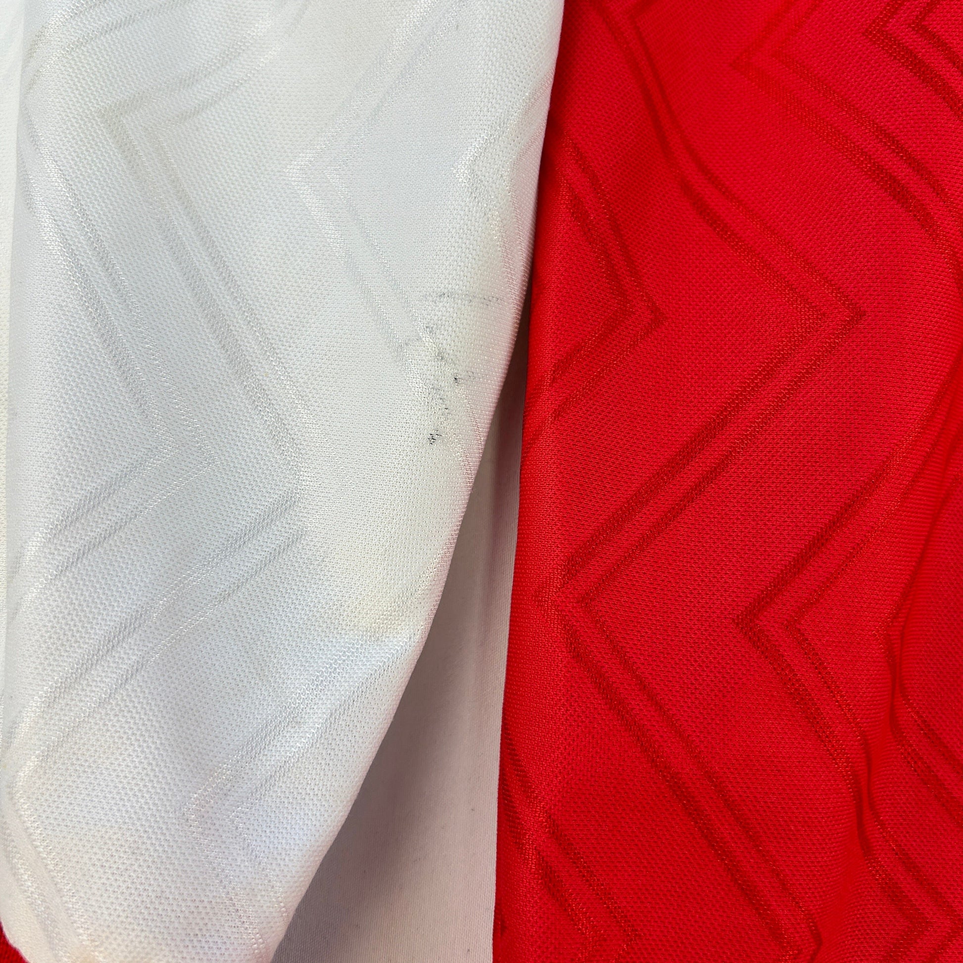Shirt info: A red home shirt matching the same season's away shirt. The shirt has the Gunners and Arsenal badge as a part of the material.