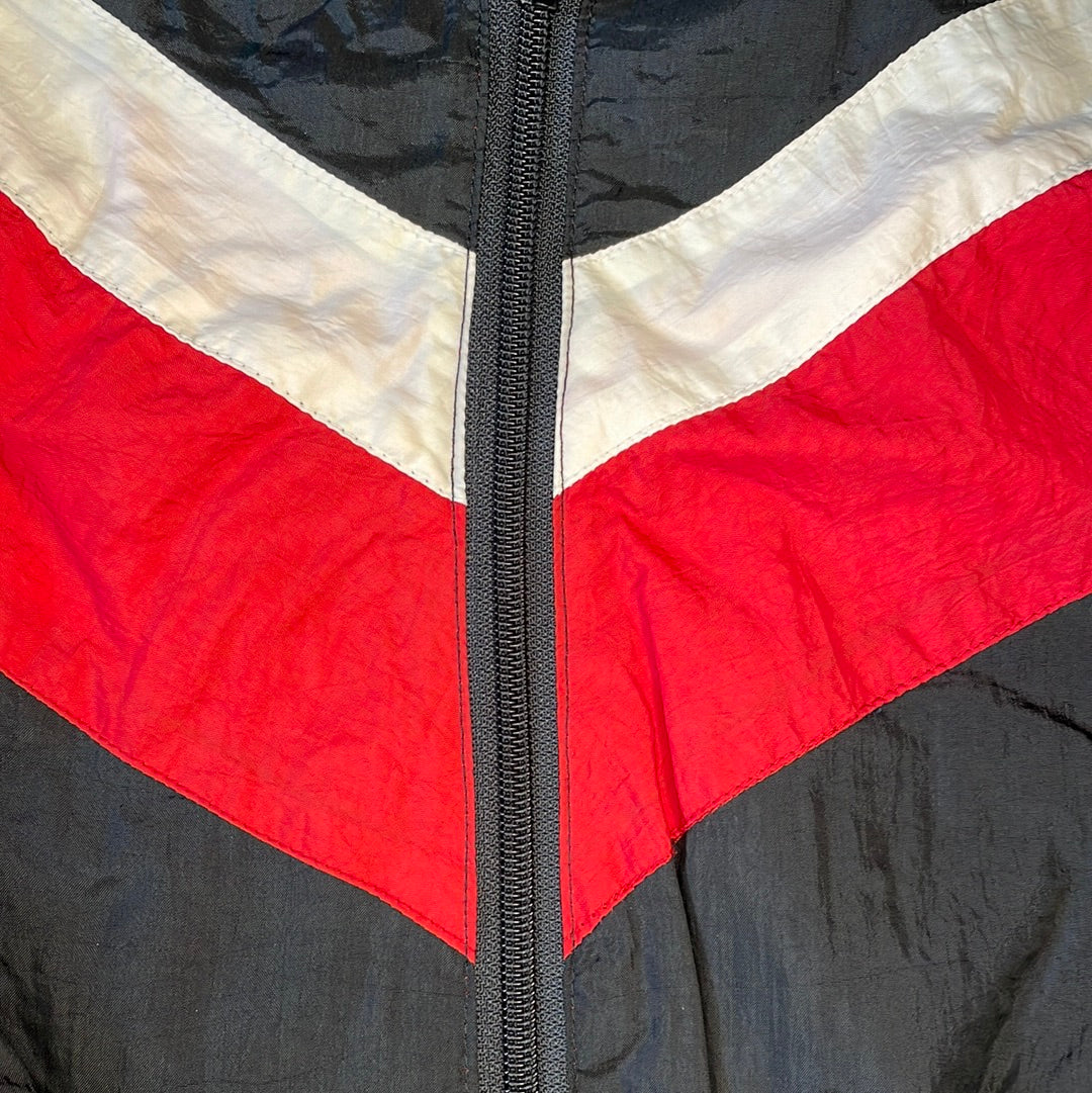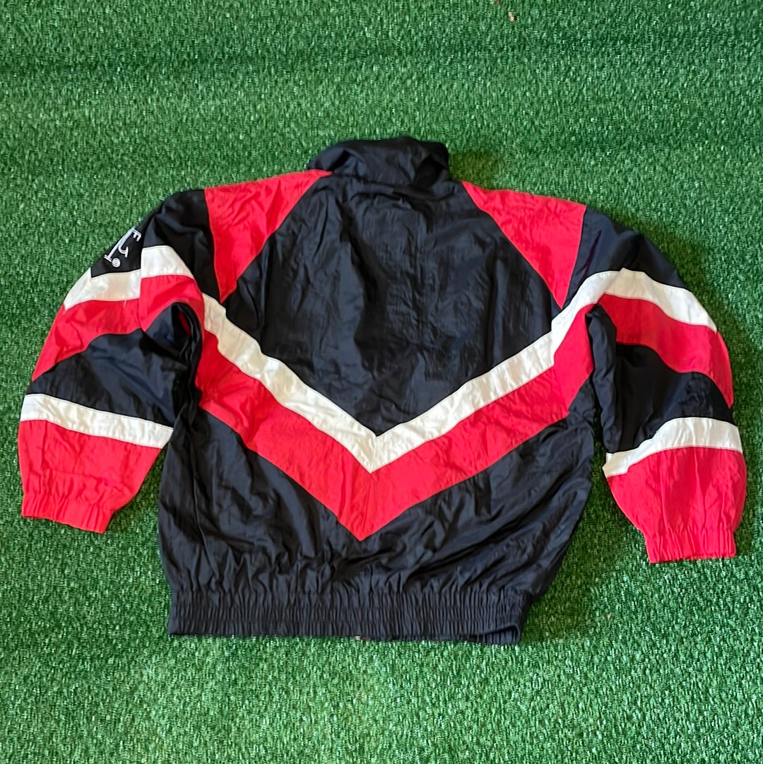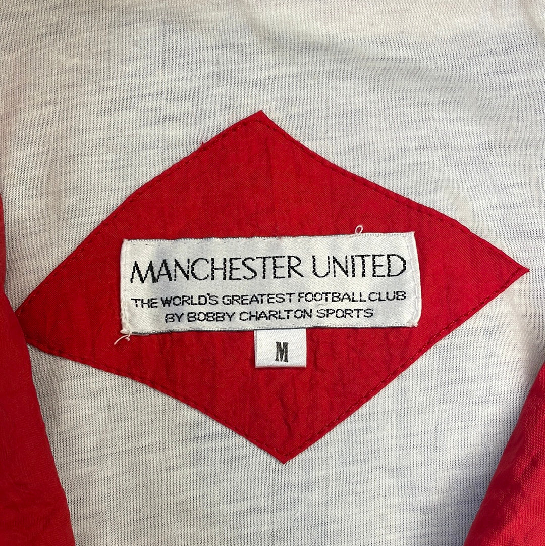 Item: What a piece of history this is. A jacket from a range of sportswear by Manchester United and Bobby Charlton. Traditional red black and white colours and in-house-made. It is estimated to be in the late 80s or early 90s range.