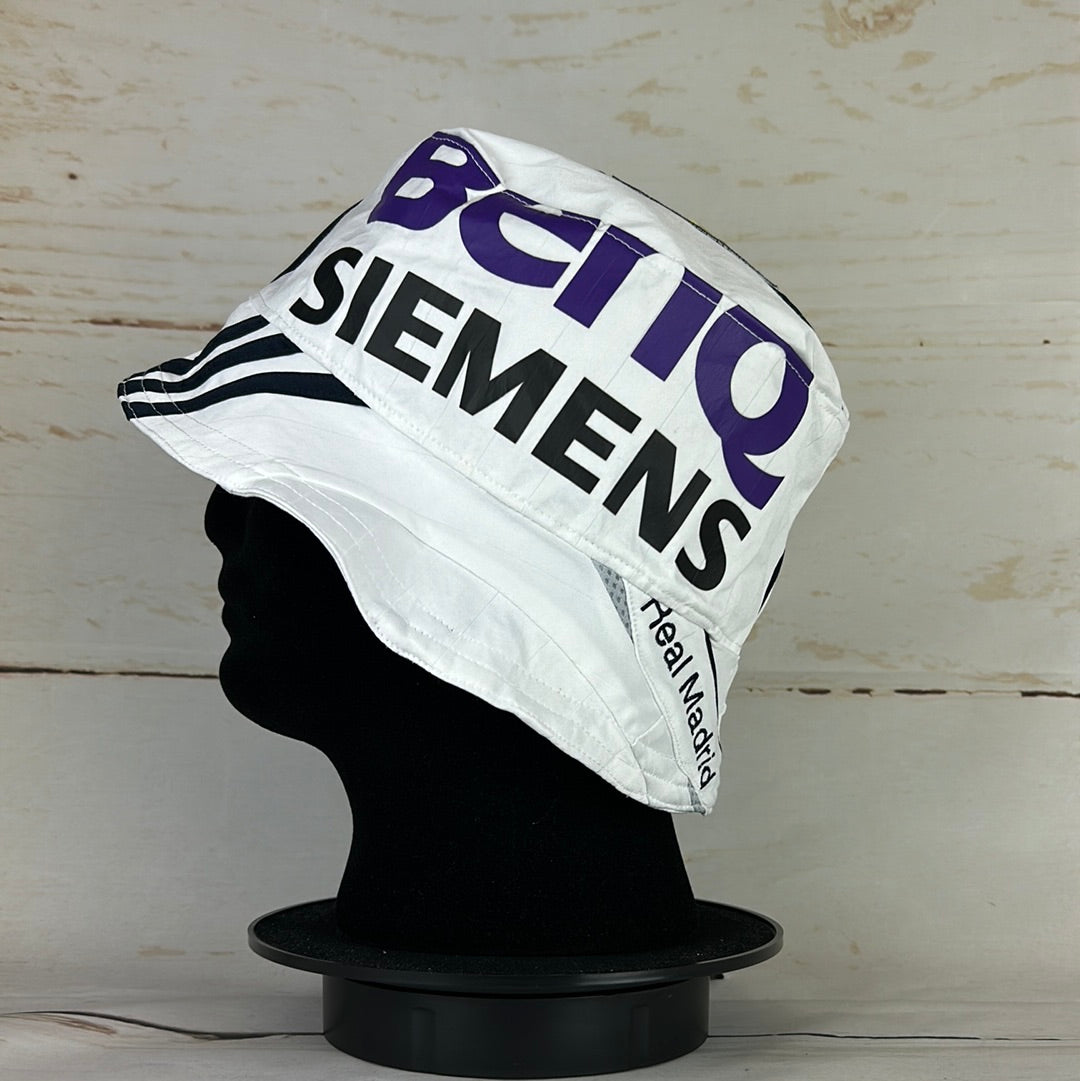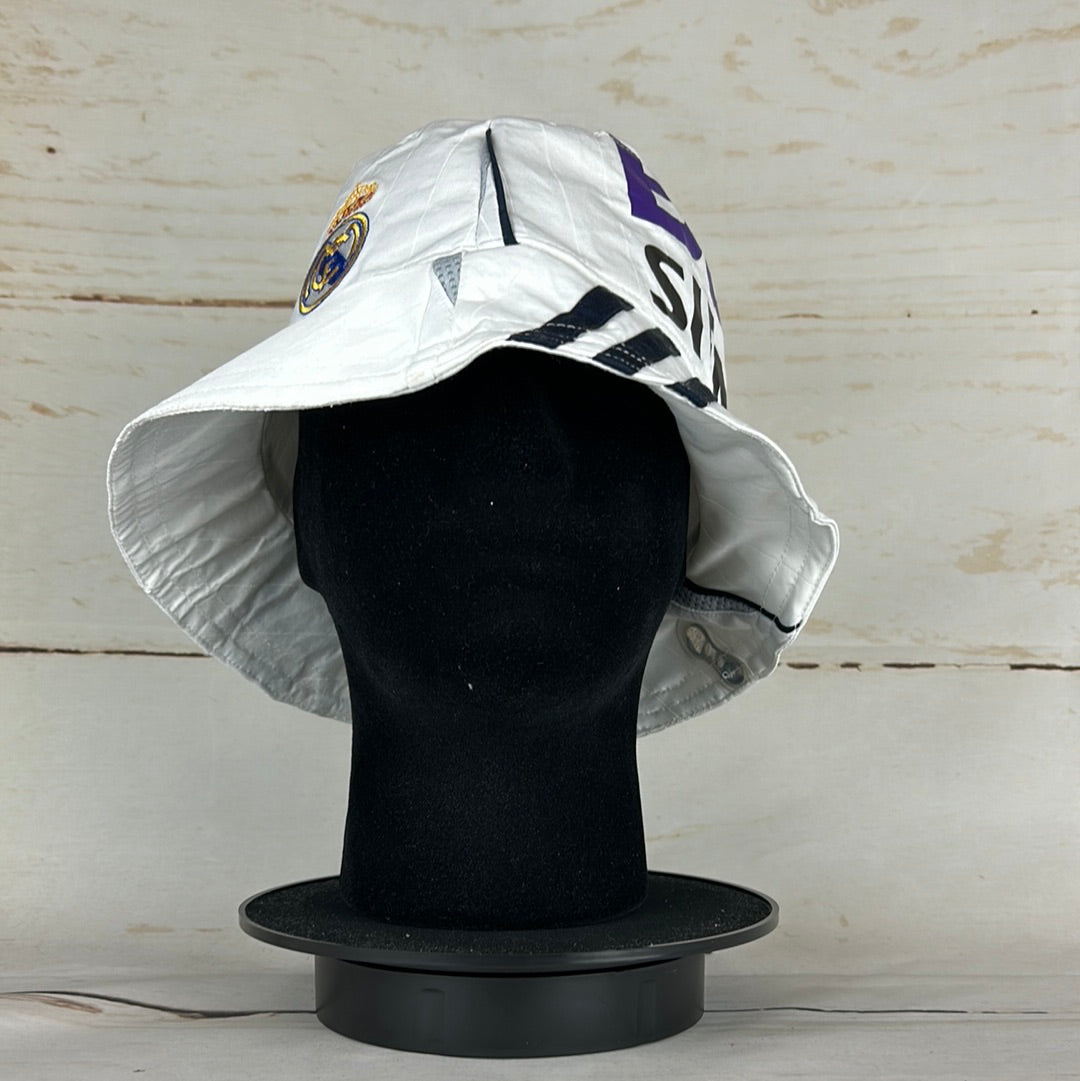 Bucket Hat Info: A custom upcycled Real Madrid 2006-2007 bucket hat made from an authentic Real Madrid shirt. The white bucket hat features; the Real Madrid badge, a black Adidas embroidered logo, the 'BenQ Siemens' sponsor and the 'Fifa Award Best Club XX Century' badge on the side. The hat has the black Adidas 3-striping with the 'LFP' sleeve patch on the top. The 'Real Madrid' stitching, Adidas 3-stripe pattern and 'TeamGeist' logo are on the brim.