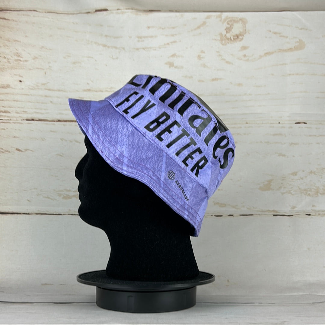 Bucket Hat Info: A custom upcycled Real Madrid 2023-2024 away bucket hat made from an authentic Real Madrid shirt. The purple bucket hat features; the Real Madrid badge, a black Adidas logo and the 'Emirates Fly Better' sponsor on the side. The hat has the 'Aeroready' logo on the brim and part of the number '11' print on the top.