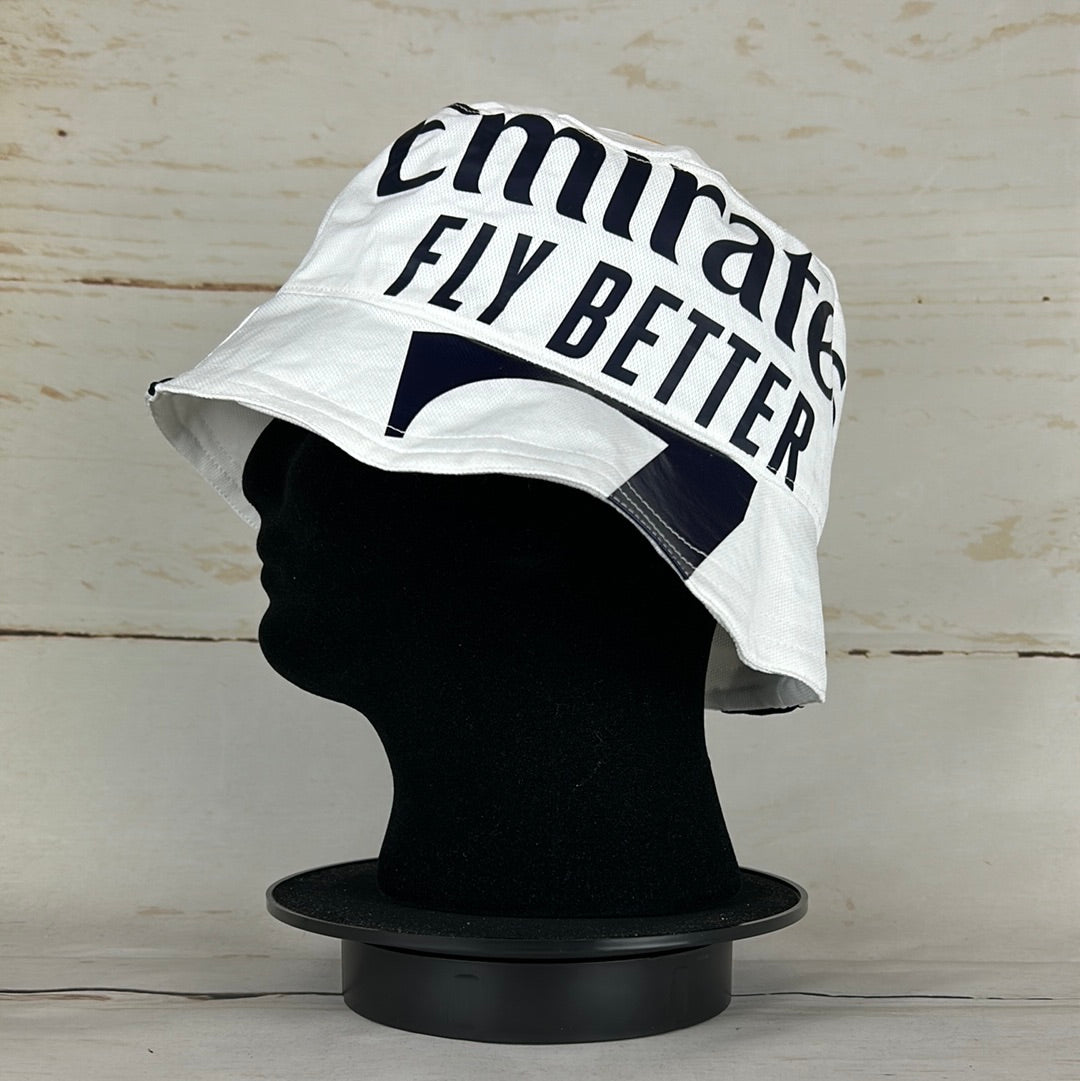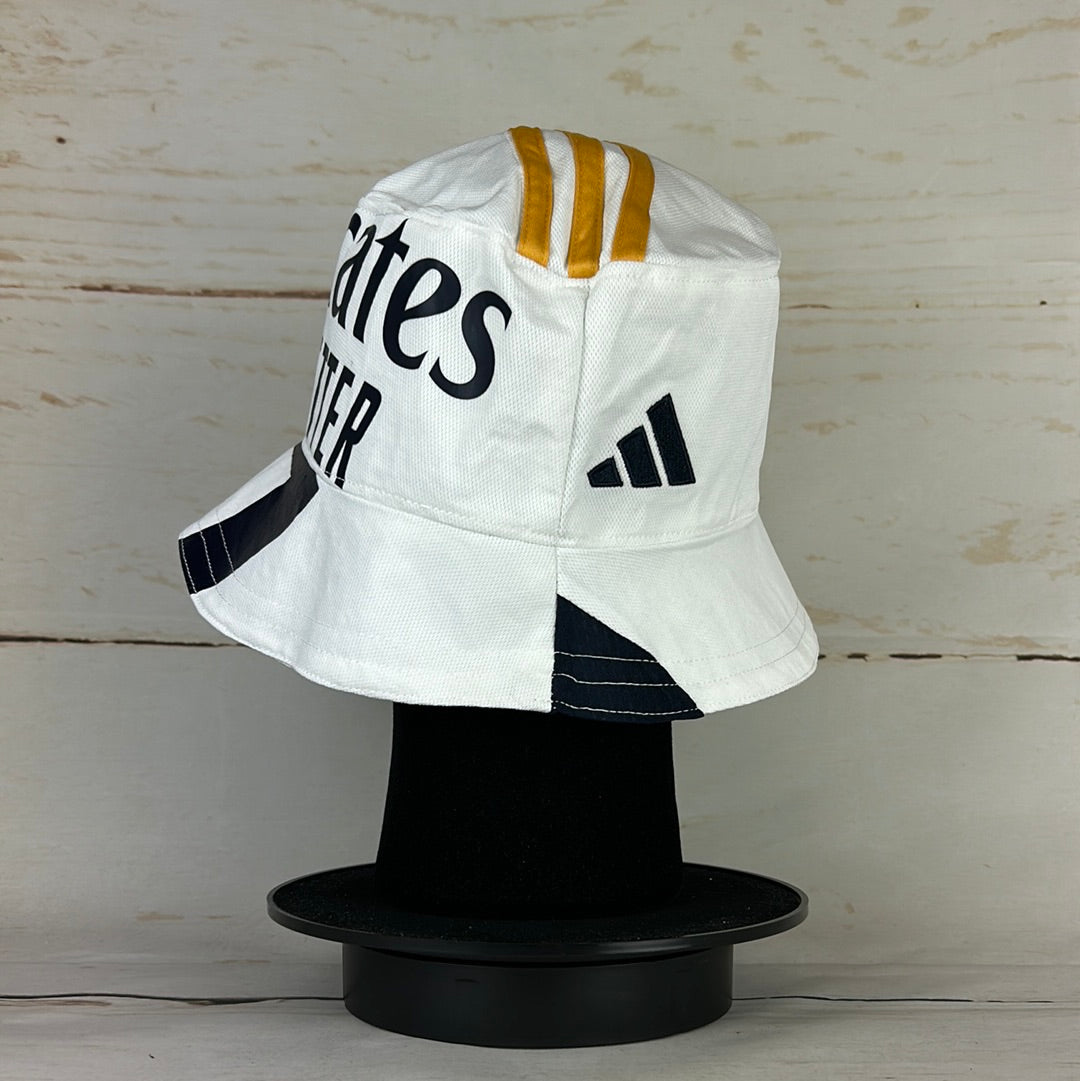 Bucket Hat Info: A custom upcycled Real Madrid 2023-2024 bucket hat made from an authentic Real Madrid shirt. The white bucket hat features; the Real Madrid badge, a black Adidas logo, the 'Emirates Fly Better' sponsor and part of a number '7' print on the side. The hat has the gold 3-stripe Adidas pattern on the top.