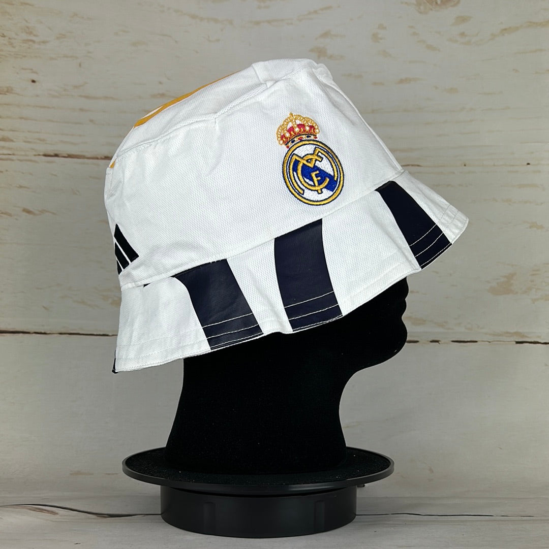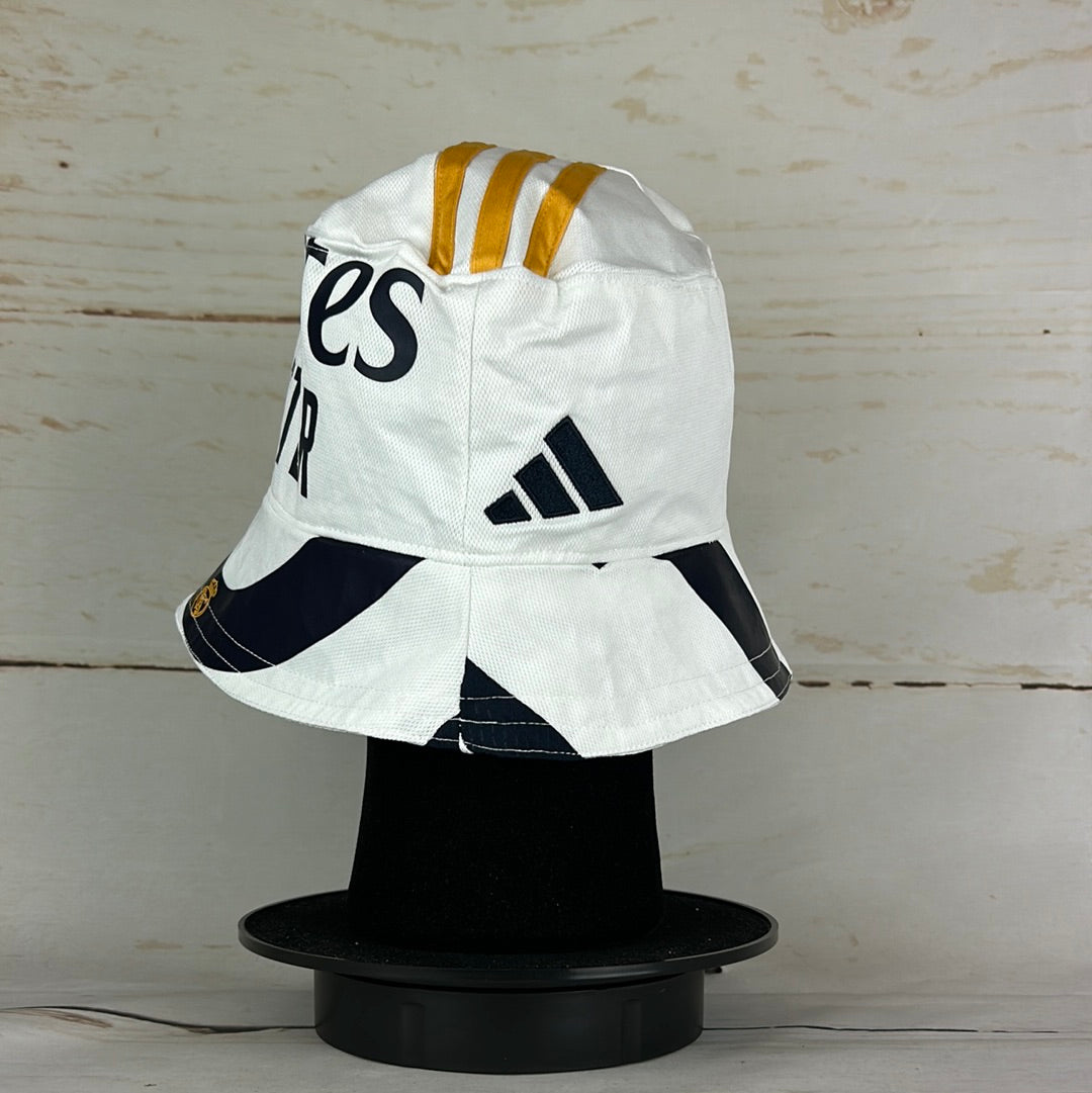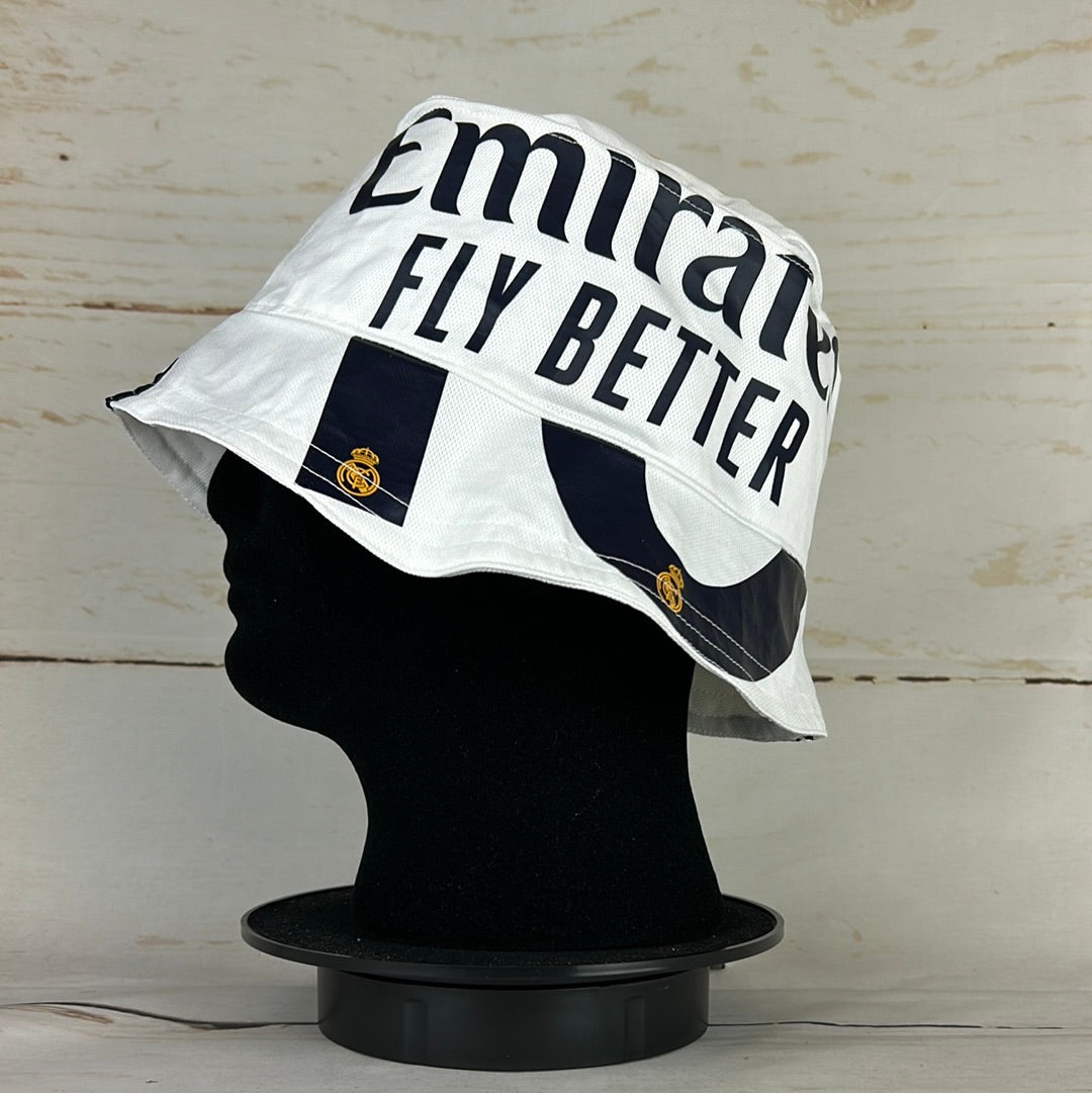 Bucket Hat Info: A custom upcycled Real Madrid 2023-2024 bucket hat made from an authentic Real Madrid shirt. The white bucket hat features; the Real Madrid badge, a black Adidas logo, the 'Emirates Fly Better' sponsor and part of a number '10' print on the side. The hat has the gold 3-stripe Adidas pattern on the top.
