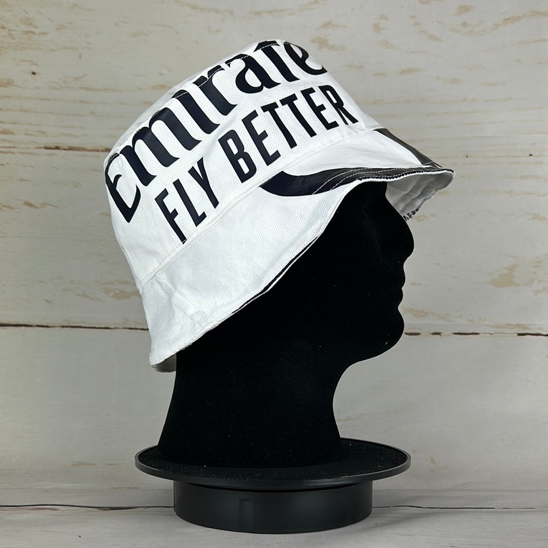 Bucket Hat Info: A custom upcycled Real Madrid 2023-2024 bucket hat made from an authentic Real Madrid shirt. The white bucket hat features; the Real Madrid badge, a black Adidas logo, the 'Emirates Fly Better' sponsor and part of a number '9' print on the side. The hat has the gold 3-stripe Adidas pattern on the top.