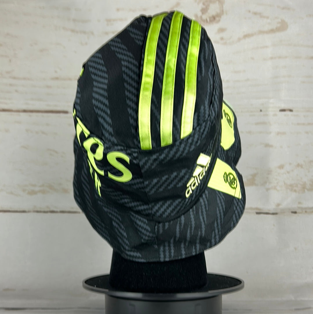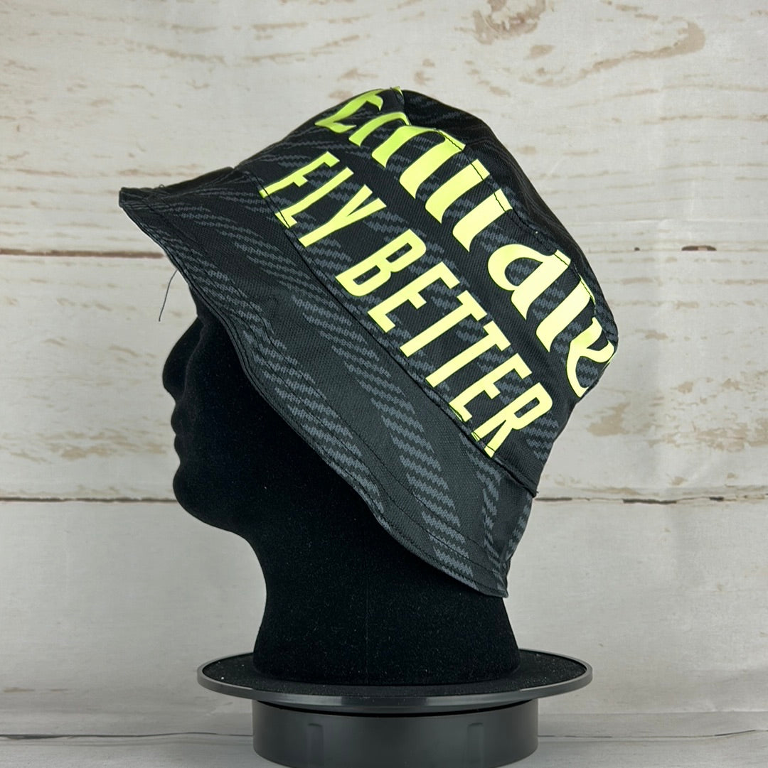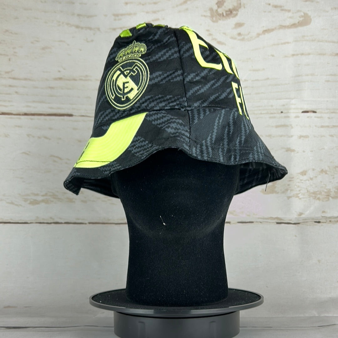 Bucket Hat Info: A custom Real Madrid away shirt bucket hat from the 2022/2023 season. It is a black bucket hat with light green detailing. The design includes the Real Madrid badge, Adidas logo, Emirates sponsor and the 3 Adidas stripes.