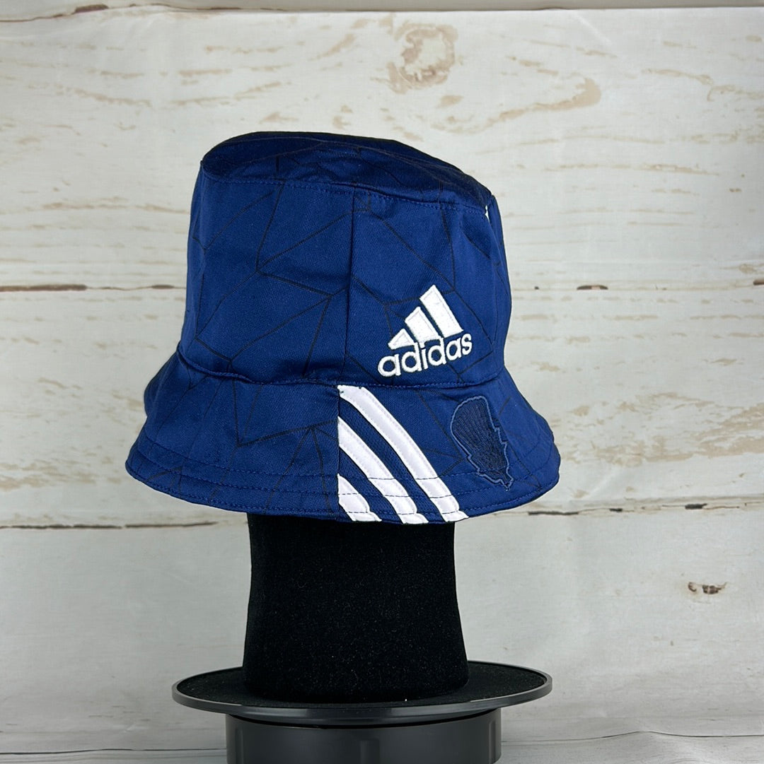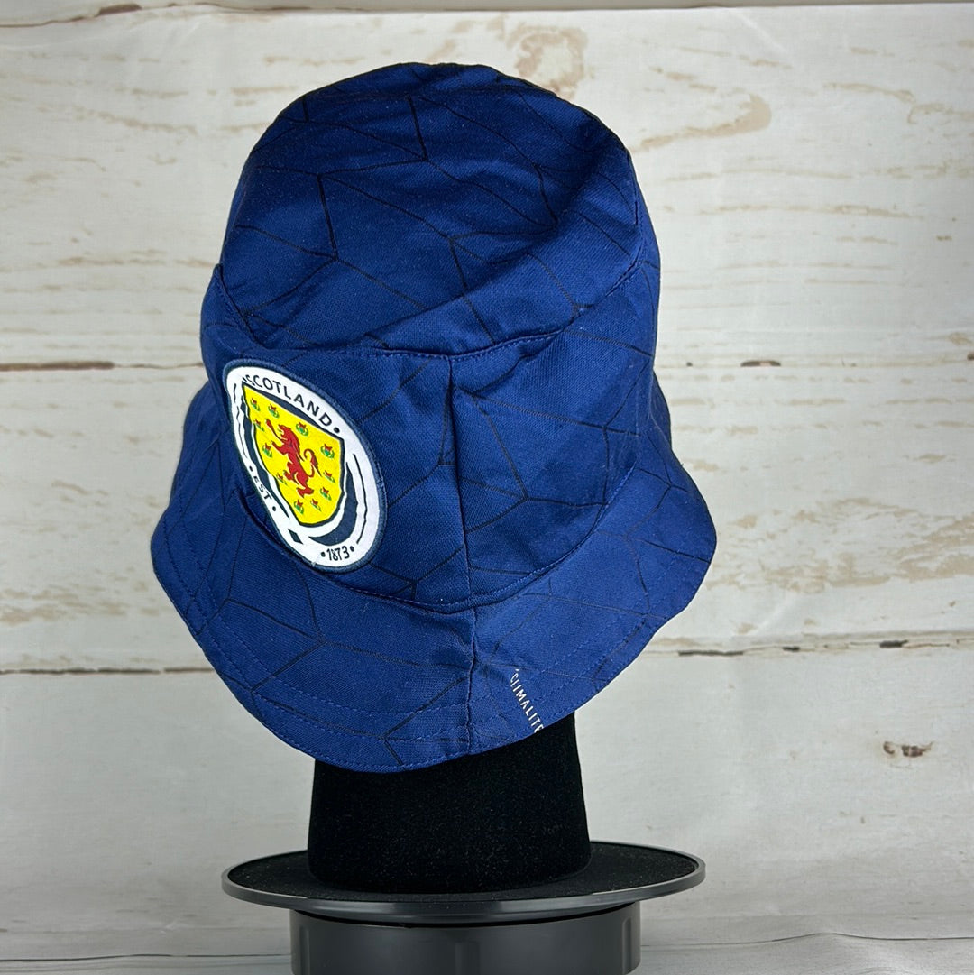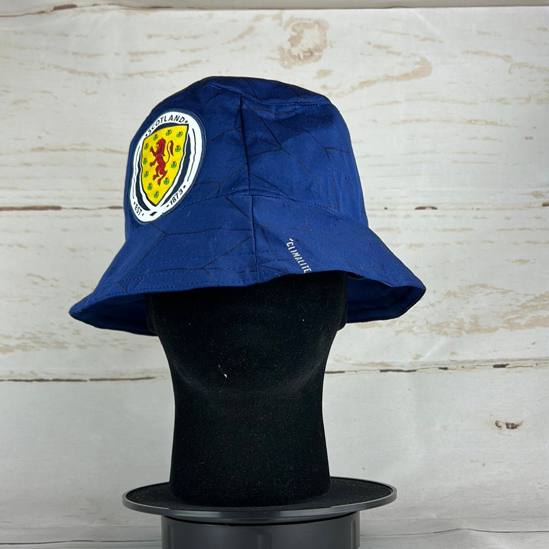Bucket Hat Info: A custom Scotland bucket hat made from a 2018 home shirt. The side of the bucket hat has the Scotland badge and Adidas logo. the brim has the thistle and 3 Adidas stripes.