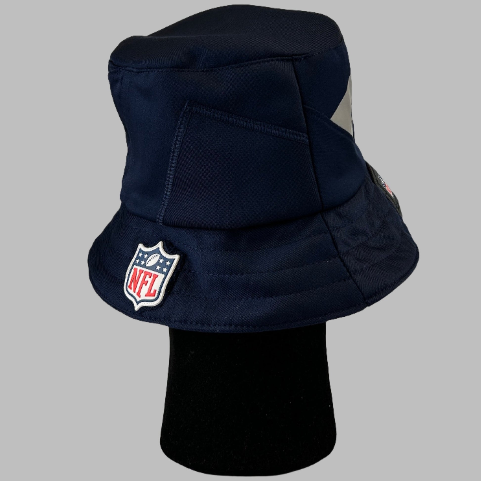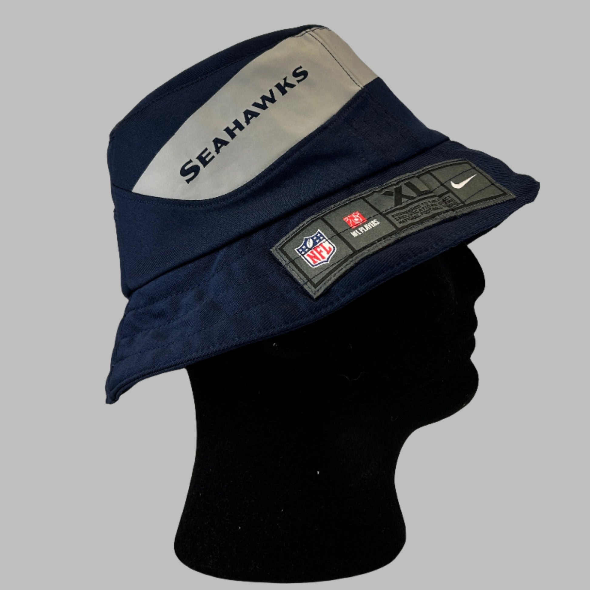 Bucket Hat Info: A custom upcycled Seattle Seahawks NFL jersey. The hat has the Seahawks from the shoulder in the design. It also has the jock tag and NFL logo on the brim.