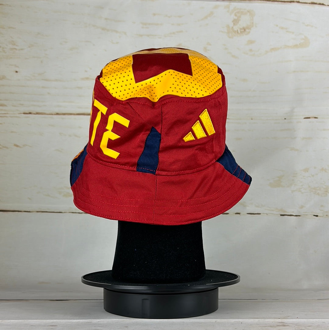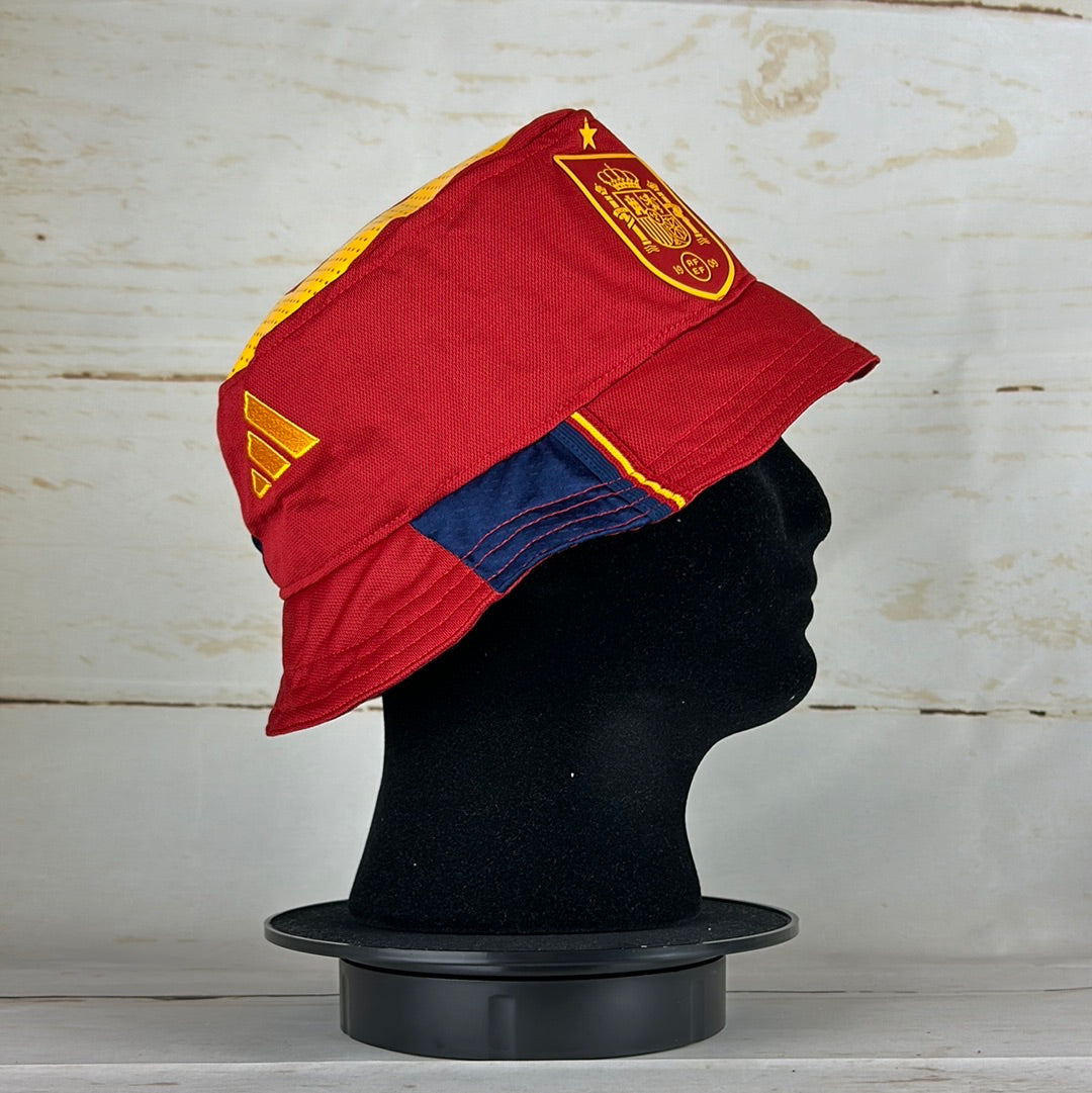 Bucket Hat Info: A custom upcycled bucket had made from an authentic Spain 2022-2023 home shirt. The red bucket hat features; the Spain badge, gold Adidas logo and the navy Adidas 3-stripe sleeve pattern on either side. The top features the gold '21' number from the front of the shirt.
