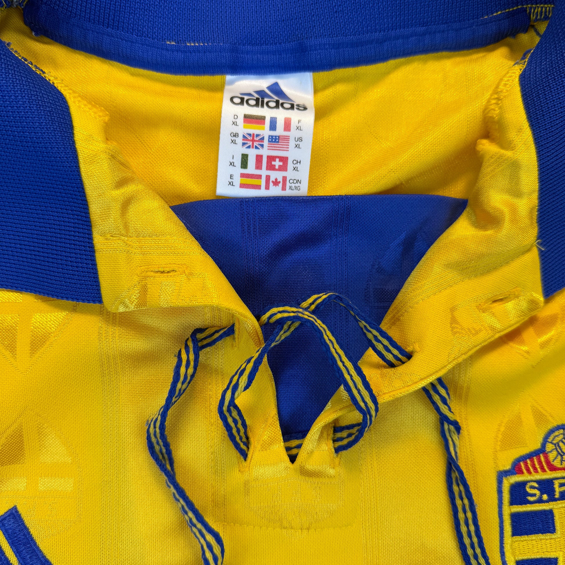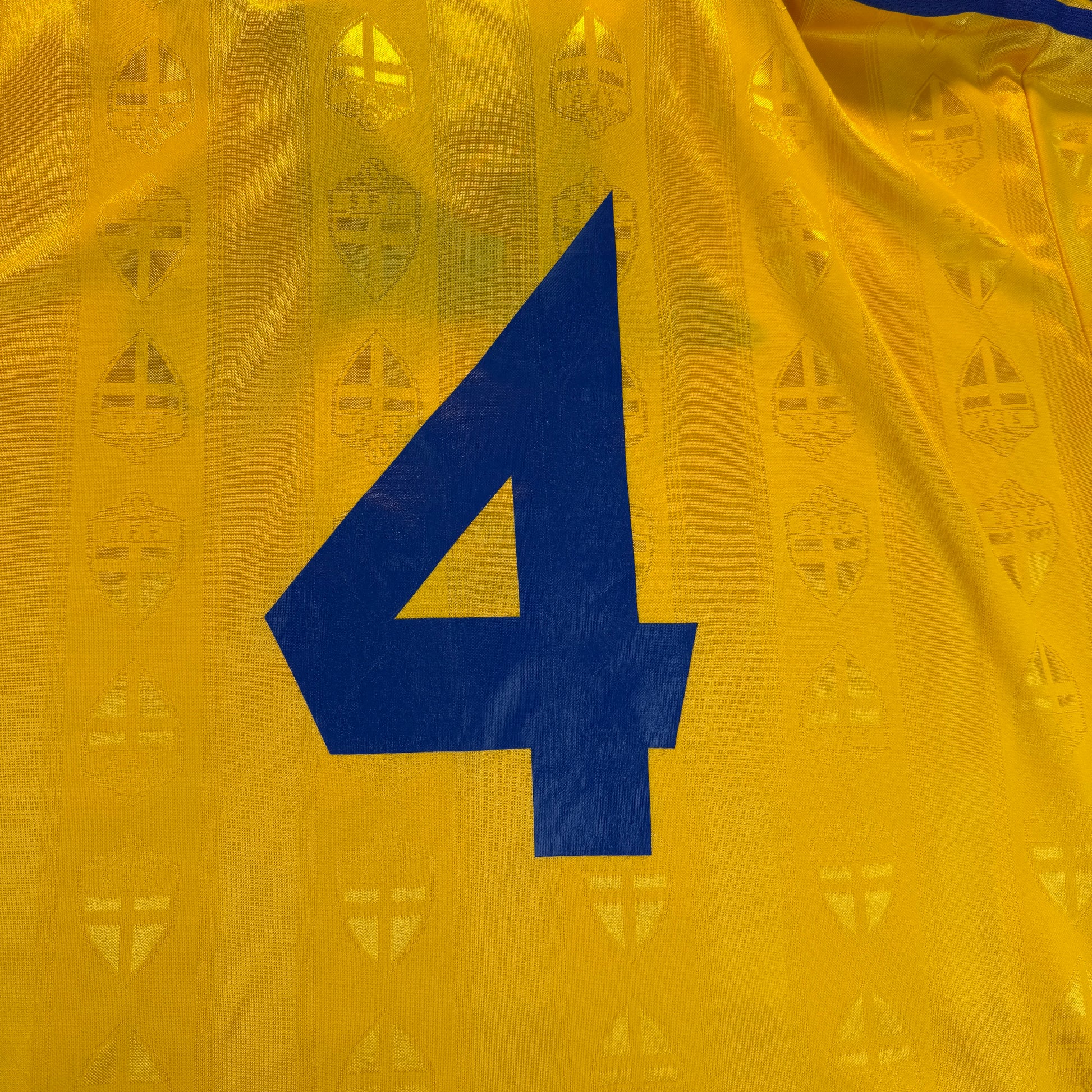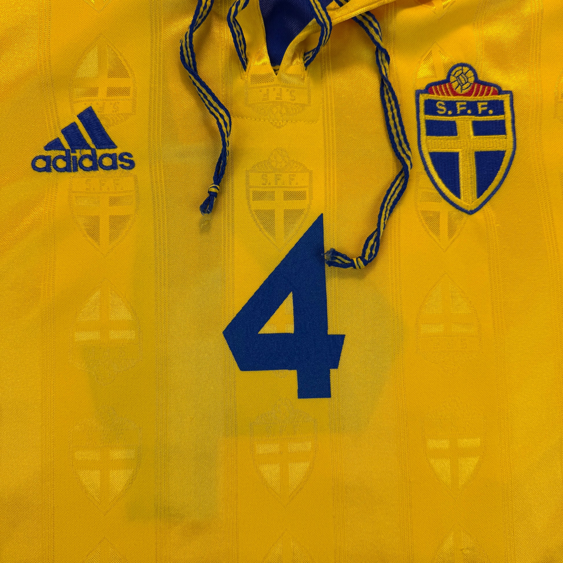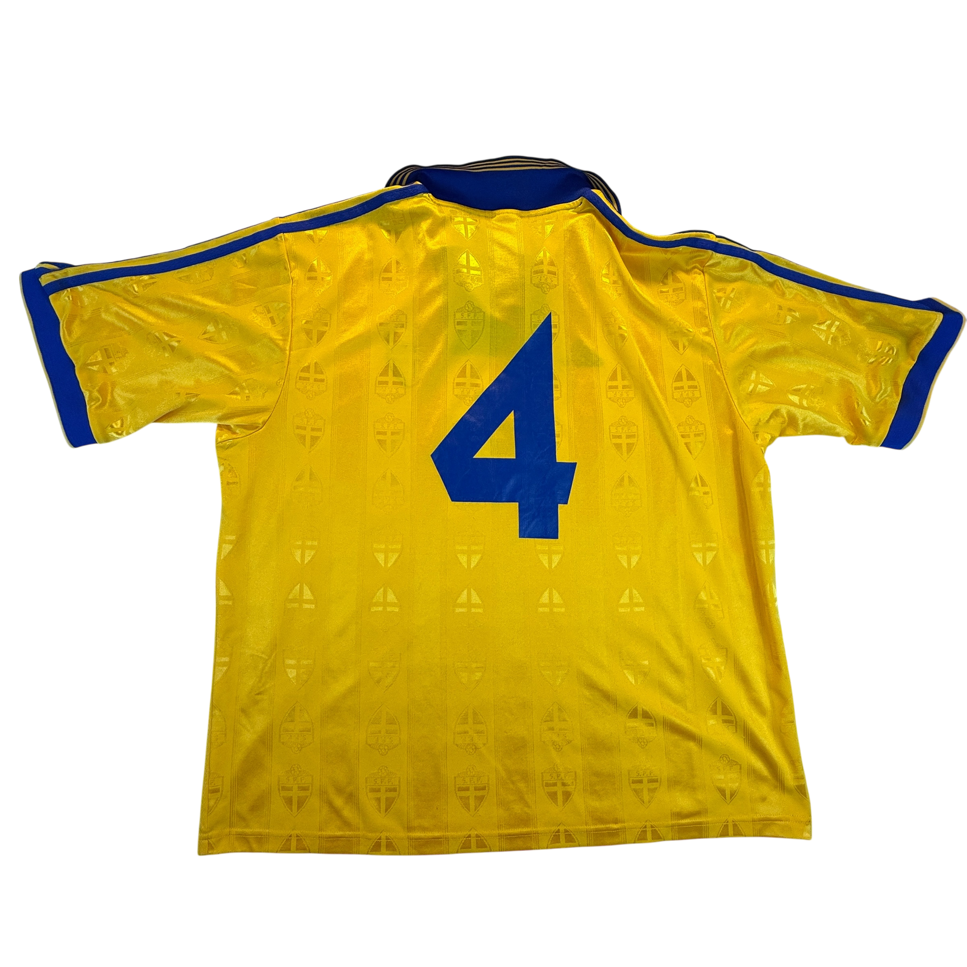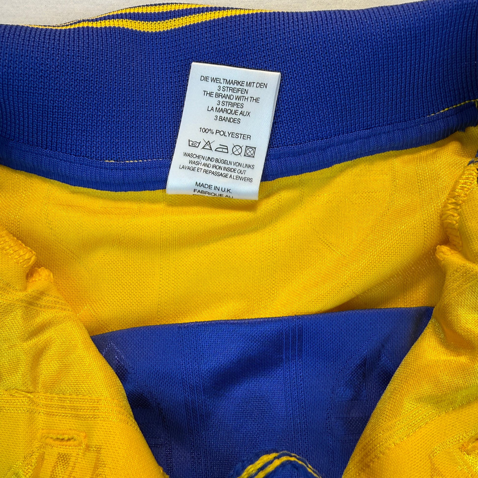 Shirt info: An Adidas player issue shirt for Sweden in 1998. The shirt has a fully embroidered Sweden badge, correct for a player-issued shirt. There are no signs of the shirt being match worn, and there is no prominence to suggest it was worn for a game.