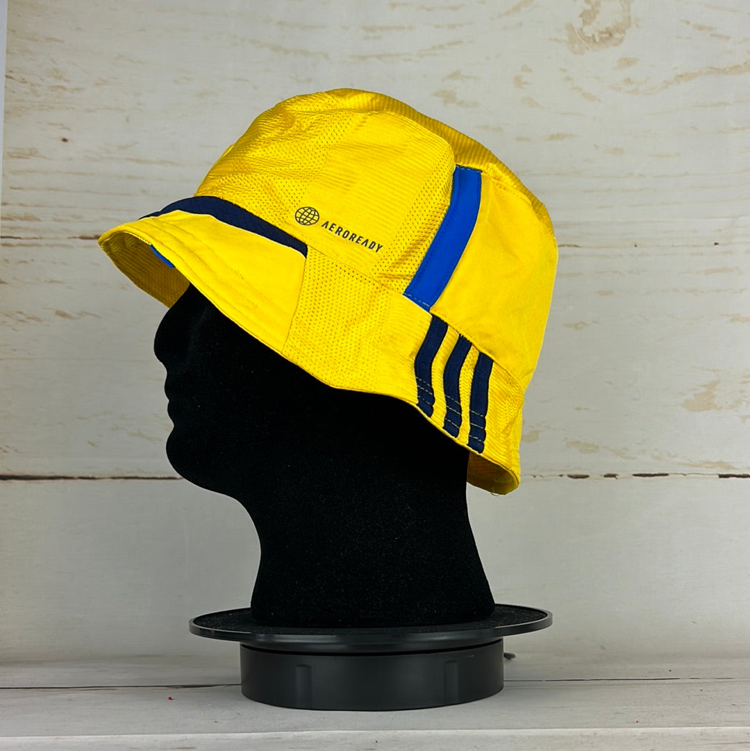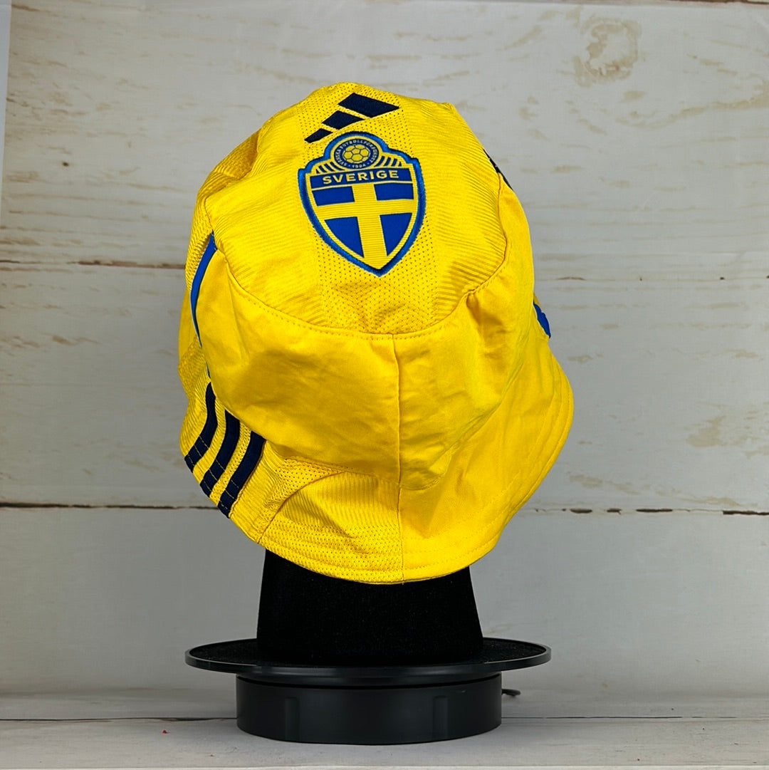 Bucket Hat Info: A custom Sweden 2022 home shirt bucket hat. This is made from a yellow and blue home shirt which has the Sweden badge and Adidas logo on the top, and the number 9 on the side.
