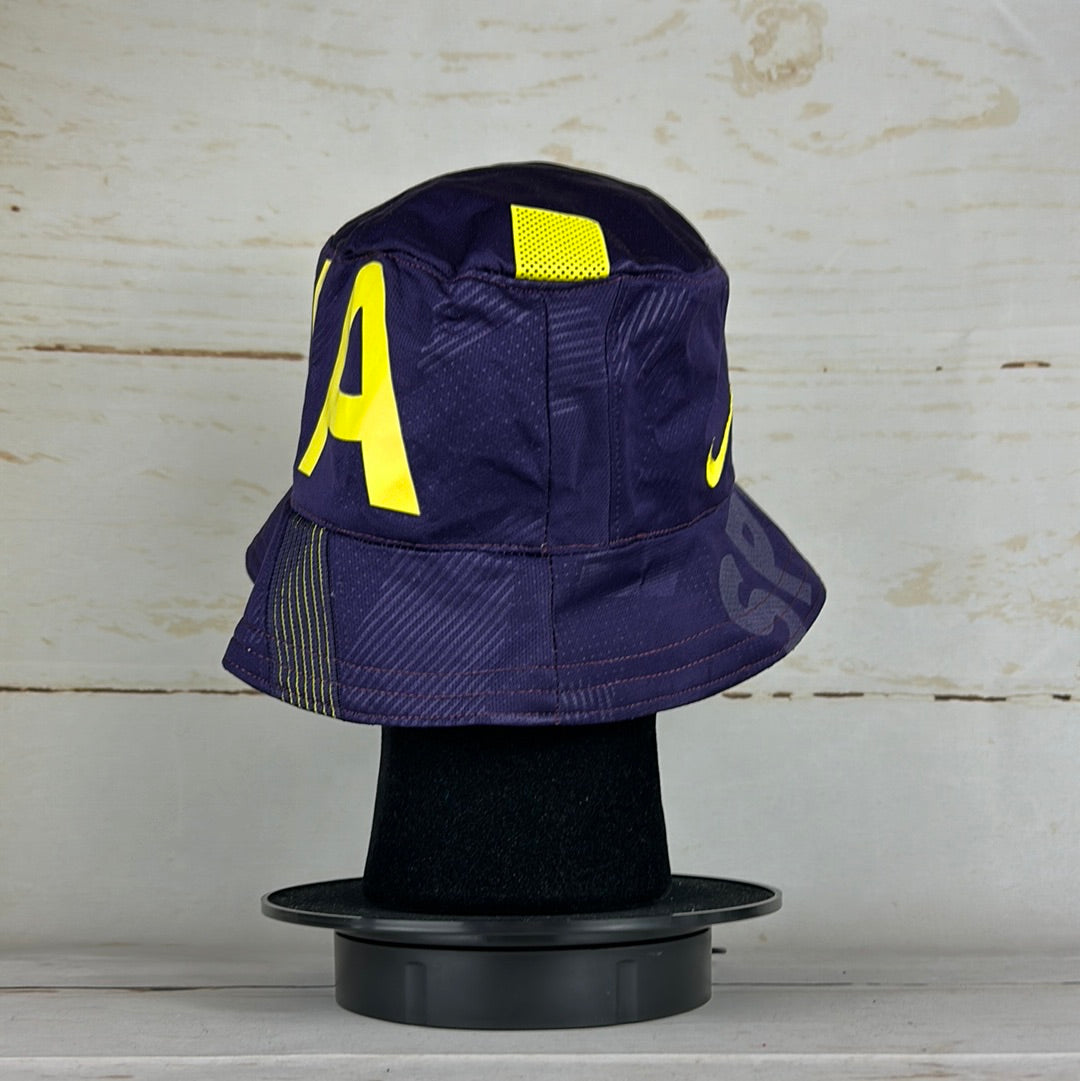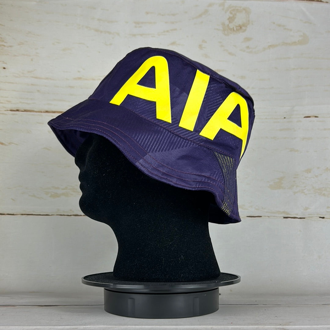 Bucket Hat Info: A custom Tottenham Hotspur football bucket hat made from a purple 2017/2018 football shirt. The plain design has a yellow AIA sponsor and yellow Nike tick on the side with the Tottenham badge on the front. The 'Spurs' text is on the brim. The top of the hat has two square yellow sections from the shirt either side.