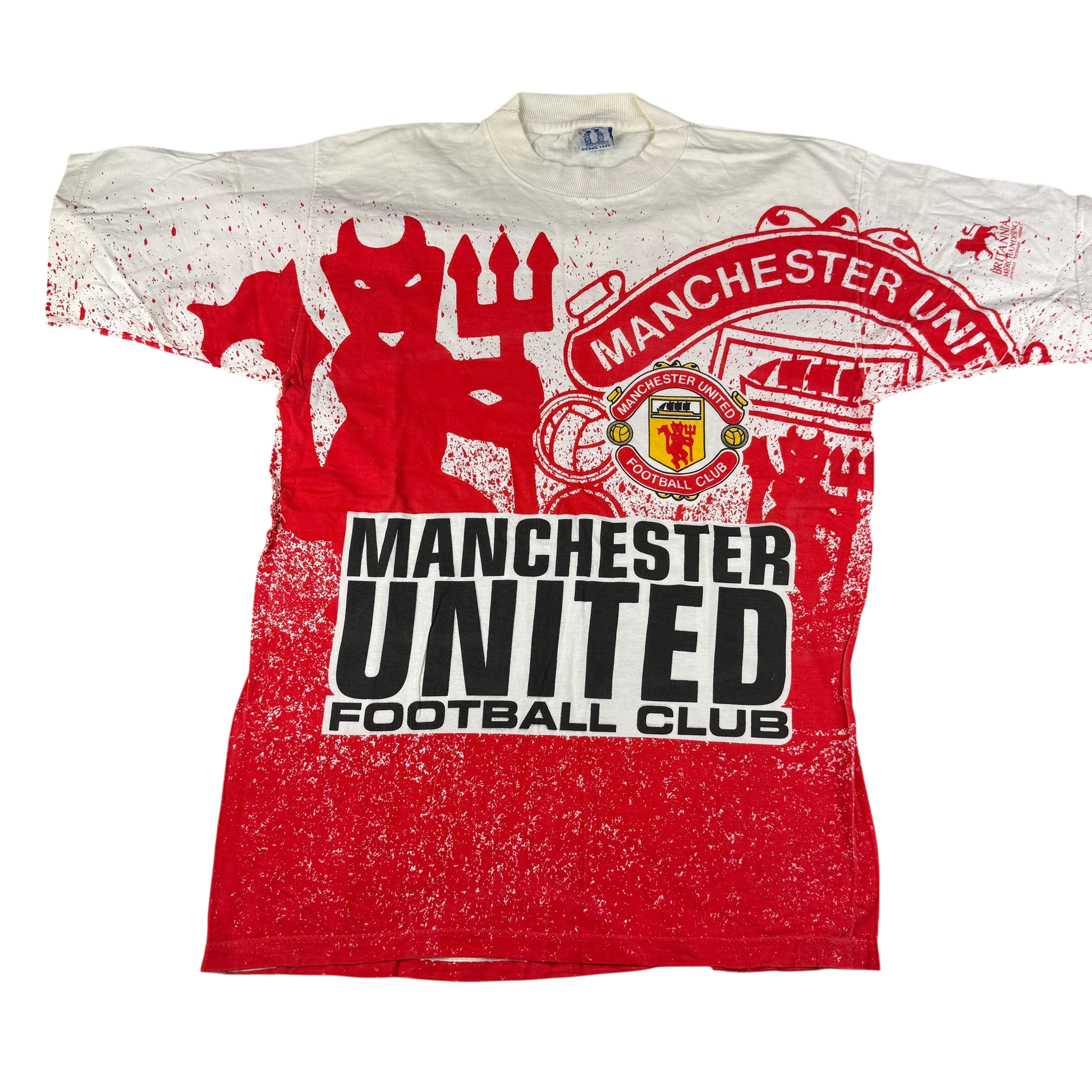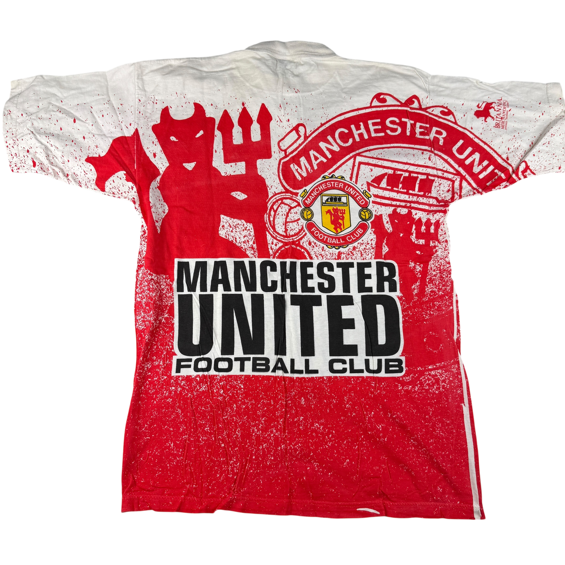 Shirt info: A vintage Manchester United t-shirt with an all-over print. The shirt was made by Britannia Merchandising.