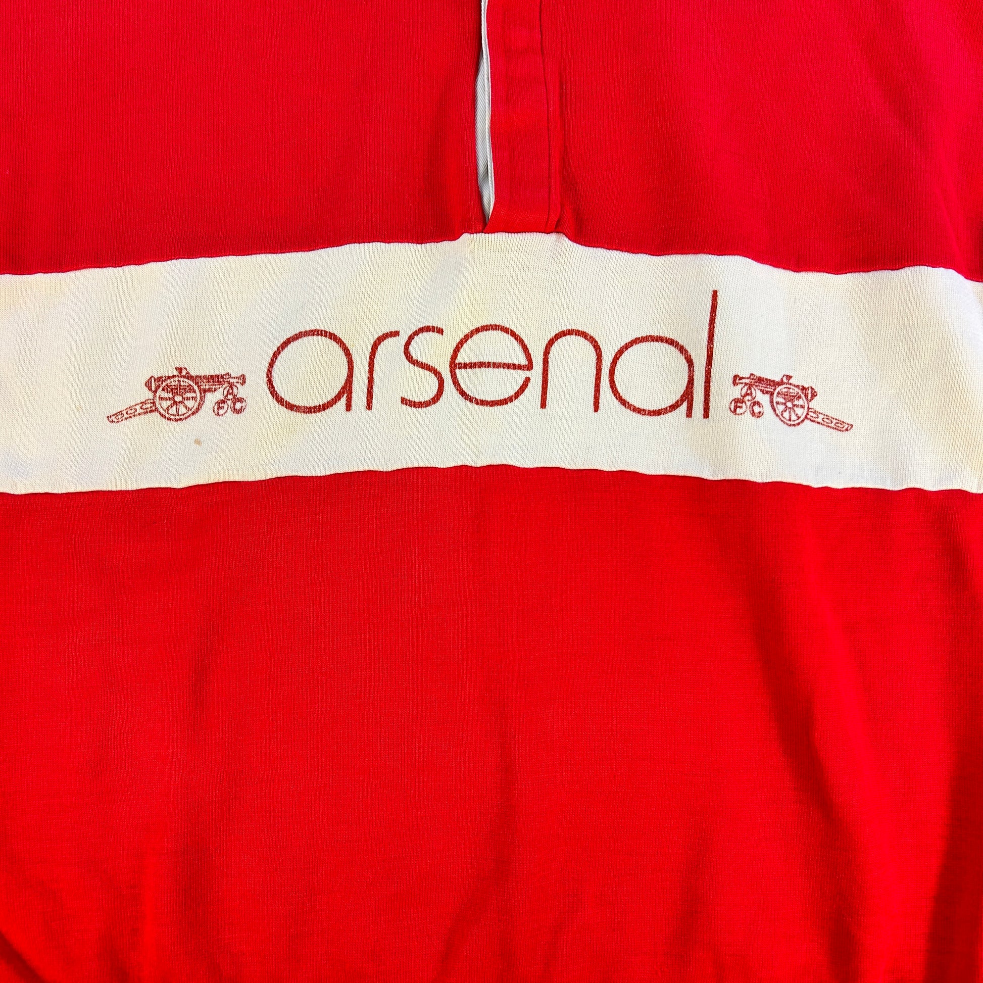 Info: This is a classic vintage Arsenal rugby-style jumper that was common in the 1980s. It has ARSENAL printed on the front with the Arsenal cannon logo on either side.