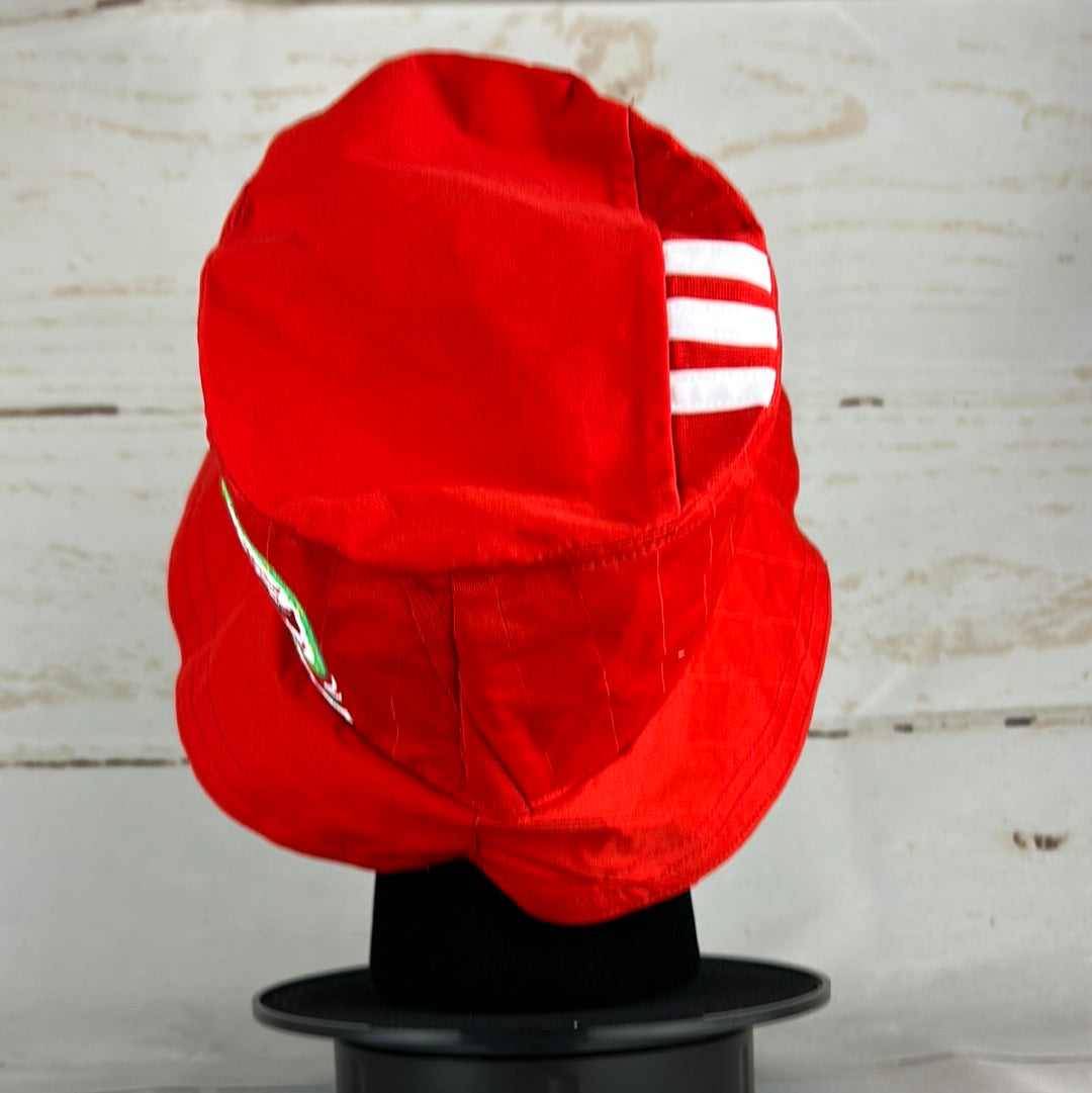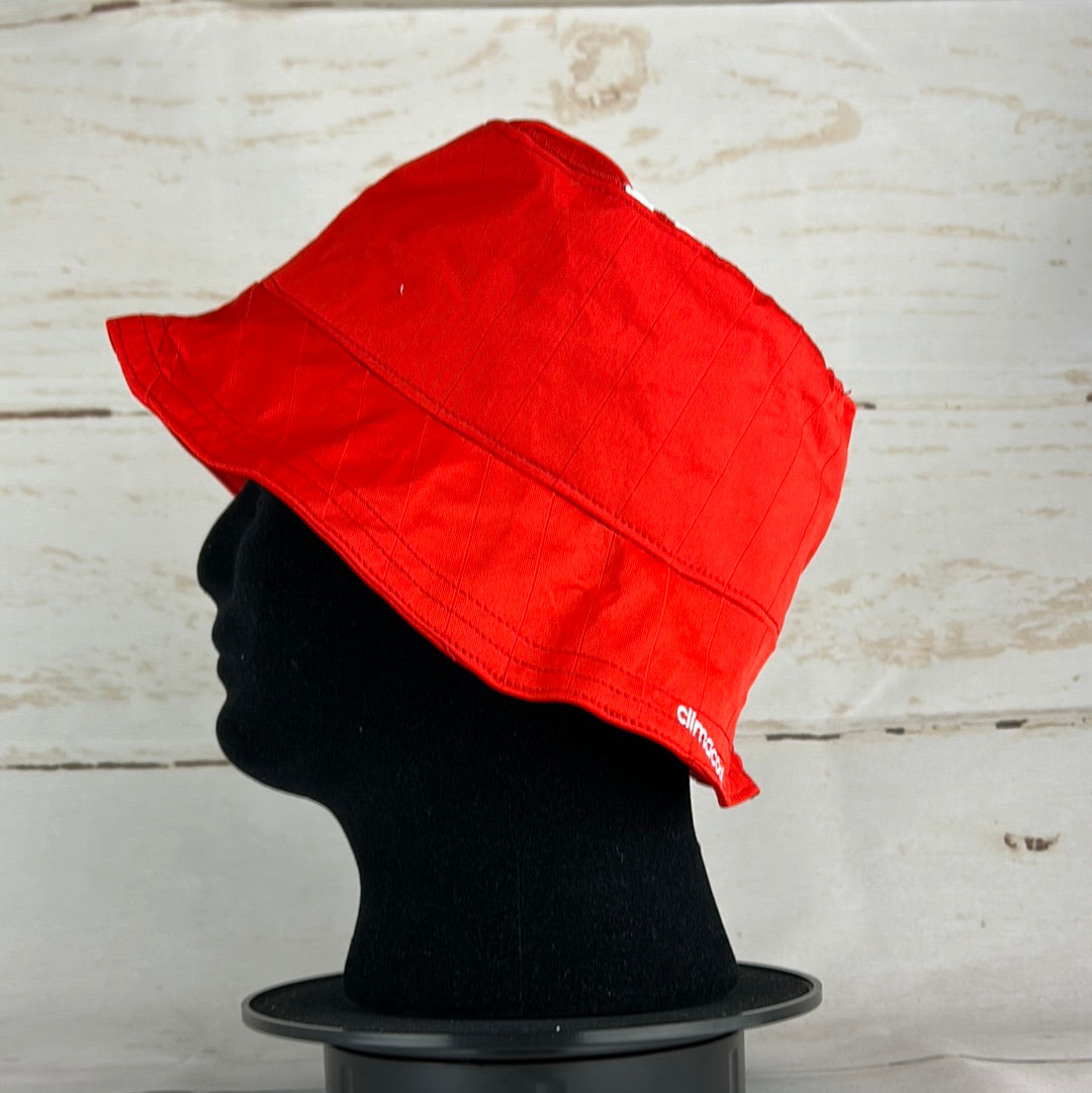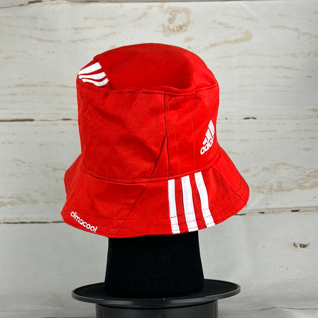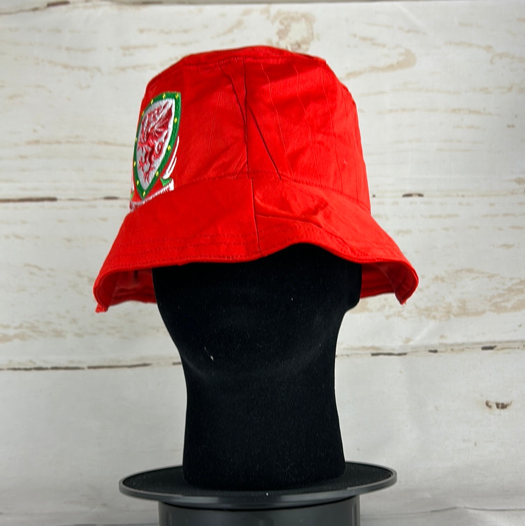Bucket Hat Info: A custom Wales bucket hat upcycled from an Adidas home shirt. The hat has the Wales badge, Adidas logo and 3 stripes from the sleeves in the design.